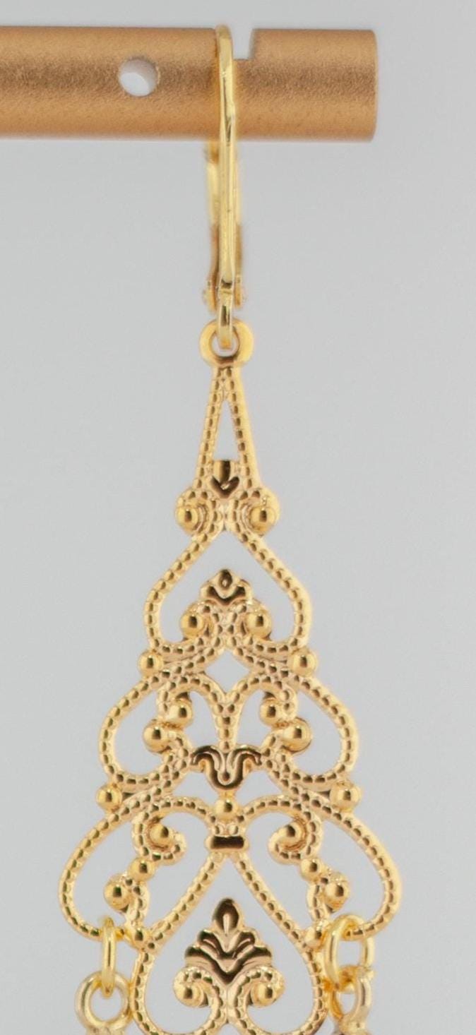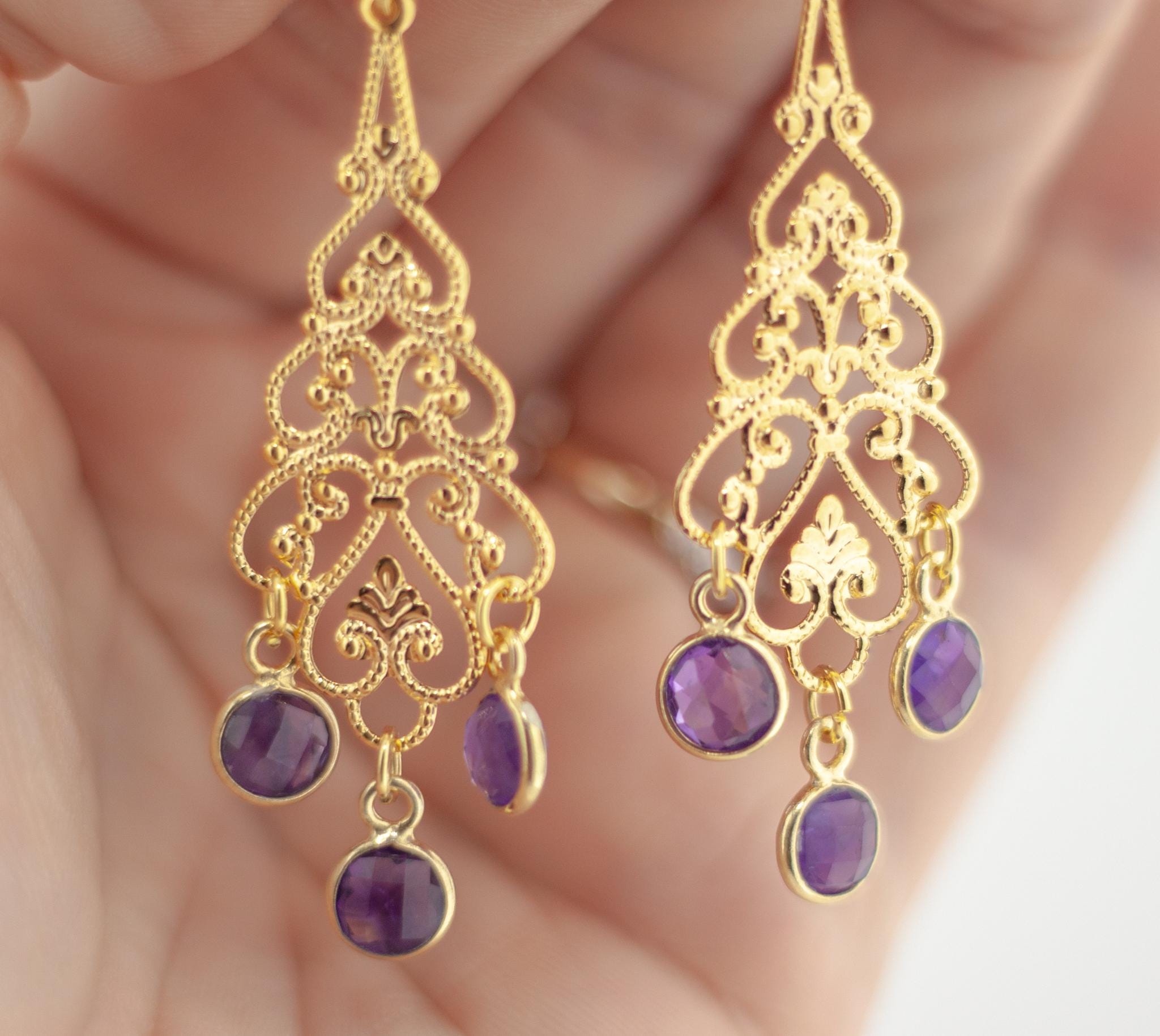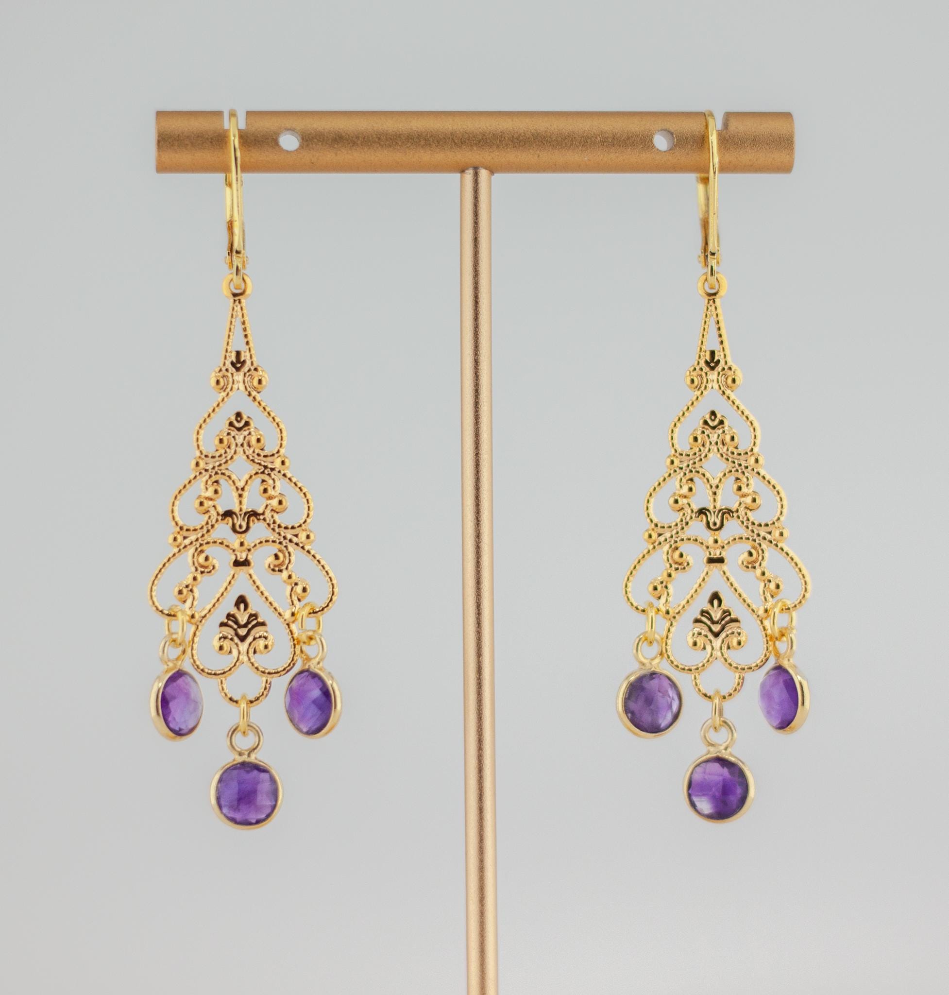 Elevate your style with these elegant Gold Filigree Dangle Earrings featuring deep purple amethyst gemstones. The intricate filigree design of these boho luxe amethyst drops exudes timeless femininity, while the rich dark purple amethyst stones add a touch of refined sophistication and charm. These long gold dangle earrings are perfect for any occasion, effortlessly transitioning from daytime elegance to evening glamour.