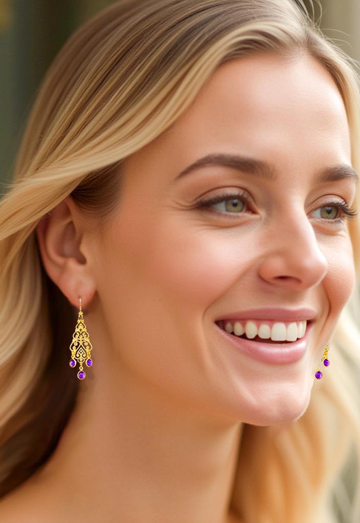 These chandelier-style earrings are a must-have for anyone who loves versatile and timeless pieces. in their Amethyst Jewelry Collection. Their lightweight design ensures all-day comfort, while the stunning combination of gold and purple makes them an exquisite addition to your purple accessories collection. Whether dressing up for a special event or adding a touch of refinement to your everyday look, these pretty boho chic gold amethyst earrings are the perfect choice.