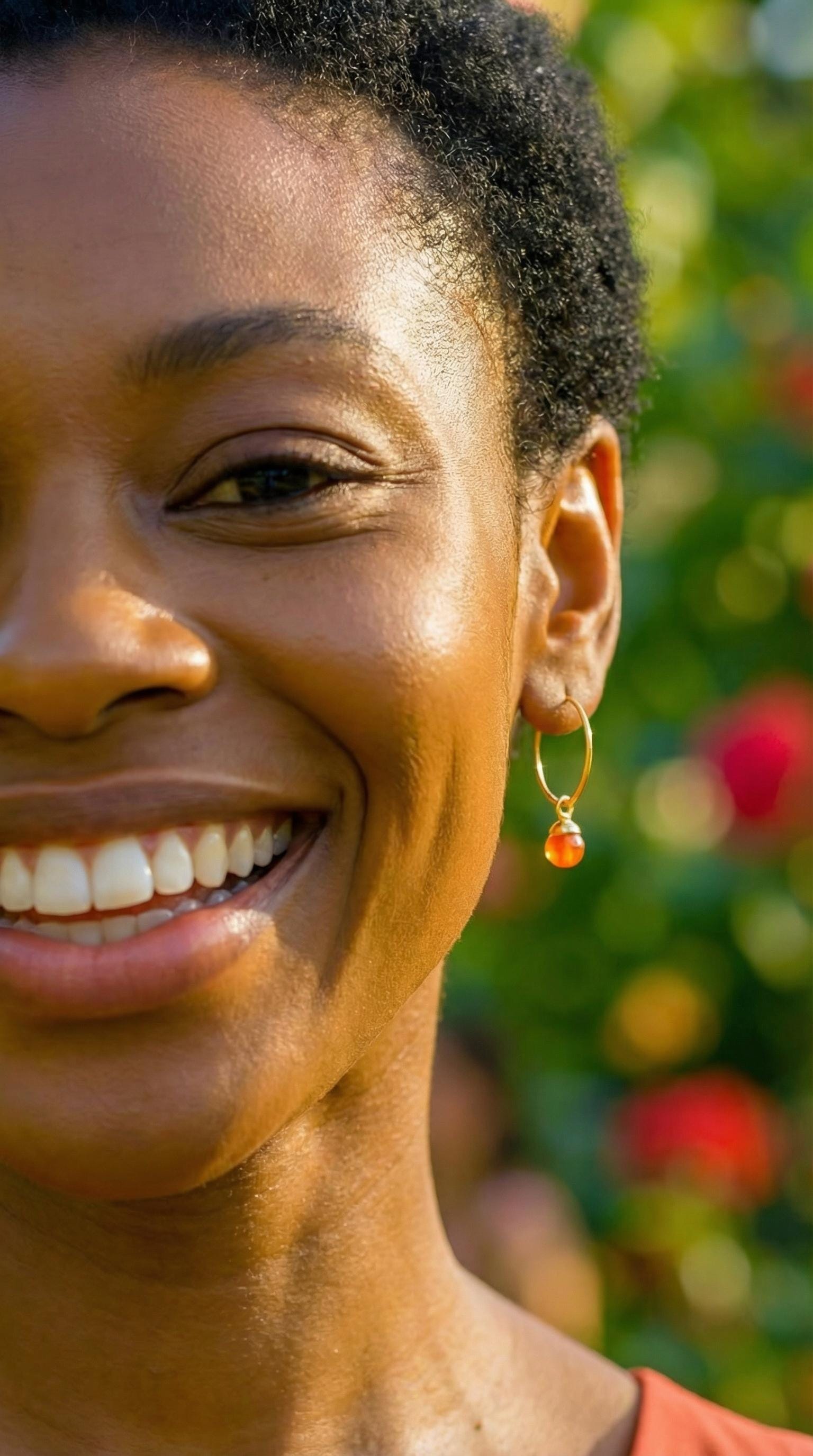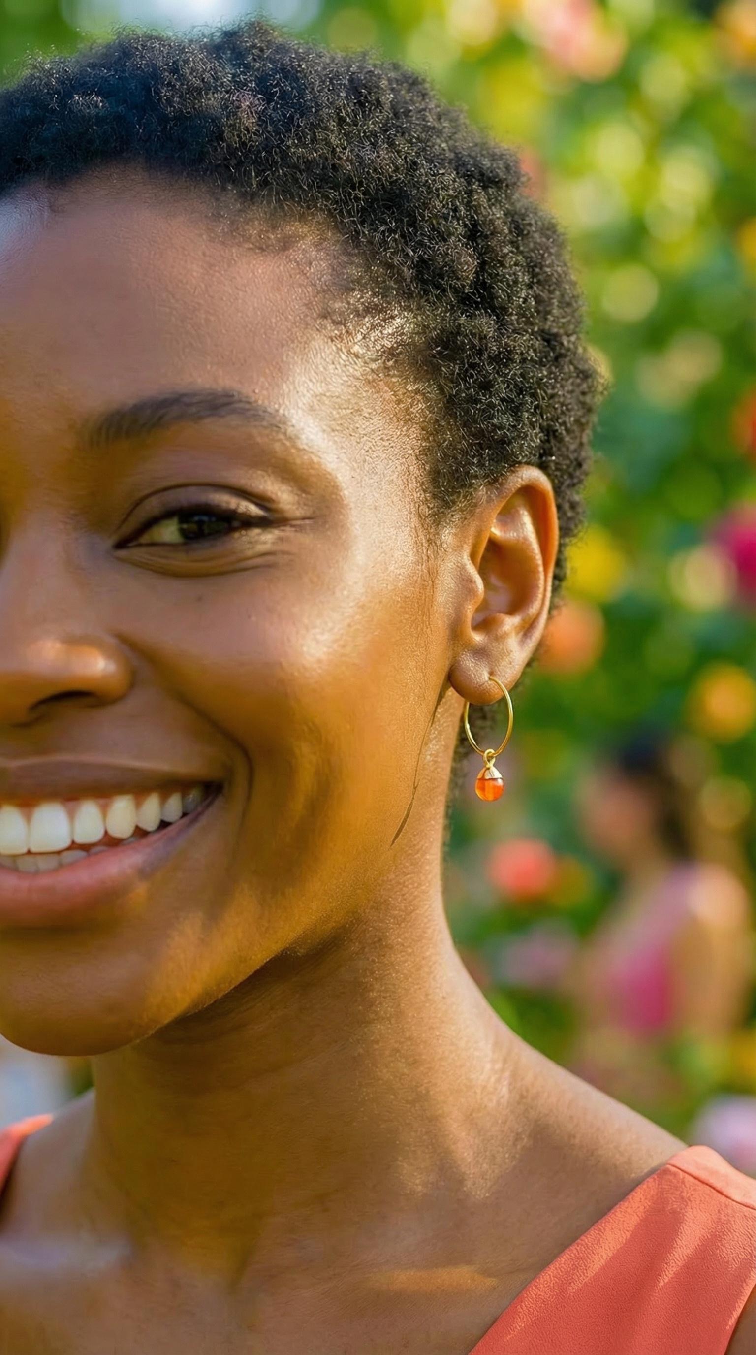 Add a touch of vibrant elegance and boho luxe beauty to your look with these Dainty Carnelian Hoop Earrings featuring gold leaf accents. These small orange carnelian and gold earrings are crafted from gold stainless steel and adorned with rich, dark orange carnelian gemstones, creating a warm, glowing contrast that is perfect for any occasion. These small gemstone hoop earrings offer a striking yet delicate pop of color without being overpowering.