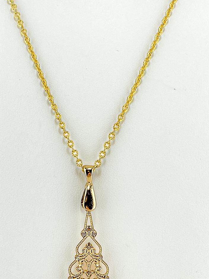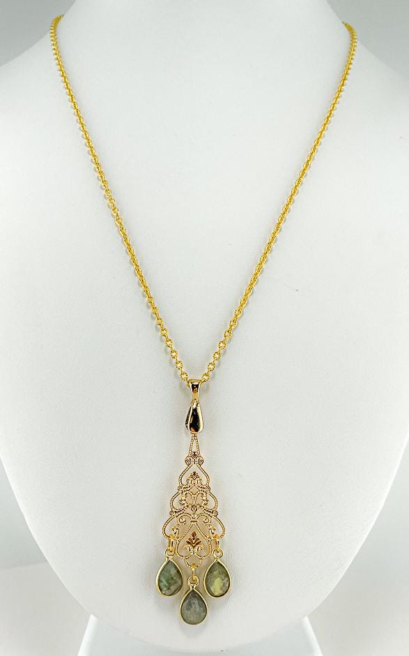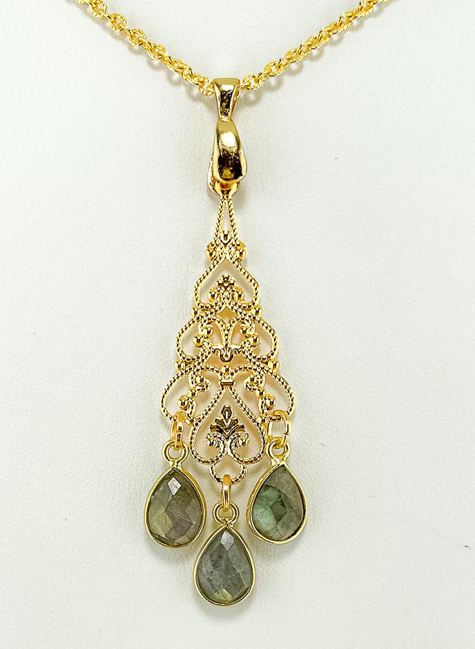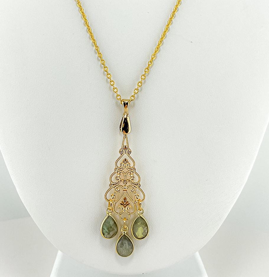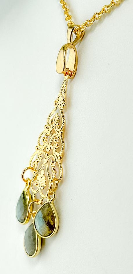 Elevate your style with this stunning chandelier style Gold Labradorite Necklace—a bright, elegant gold accessory that effortlessly combines timeless charm and modern sophistication. This exquisite gold chain necklace features an intricate gold filigree inspired by classic vintage retro styles, creating a unique and captivating look with a refined modern twist. The teardrop-shaped labradorite gemstone accents add a mesmerizing touch of iridescence with their grey, green, blue, and yellow hues, making this piece a standout addition to any statement jewelry collection.