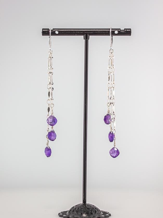 Add a touch of elegance and playful charm to your look with these Pretty Boho Chic Amethyst Earrings. Featuring lilac purple amethyst gemstones in a tiered chandelier design, these long silver dangle earrings exude delicate femininity with a modern bohemian twist. The silver chain detailing enhances their graceful movement, creating a light, airy feel that makes them perfect for everyday wear or a special occasion.