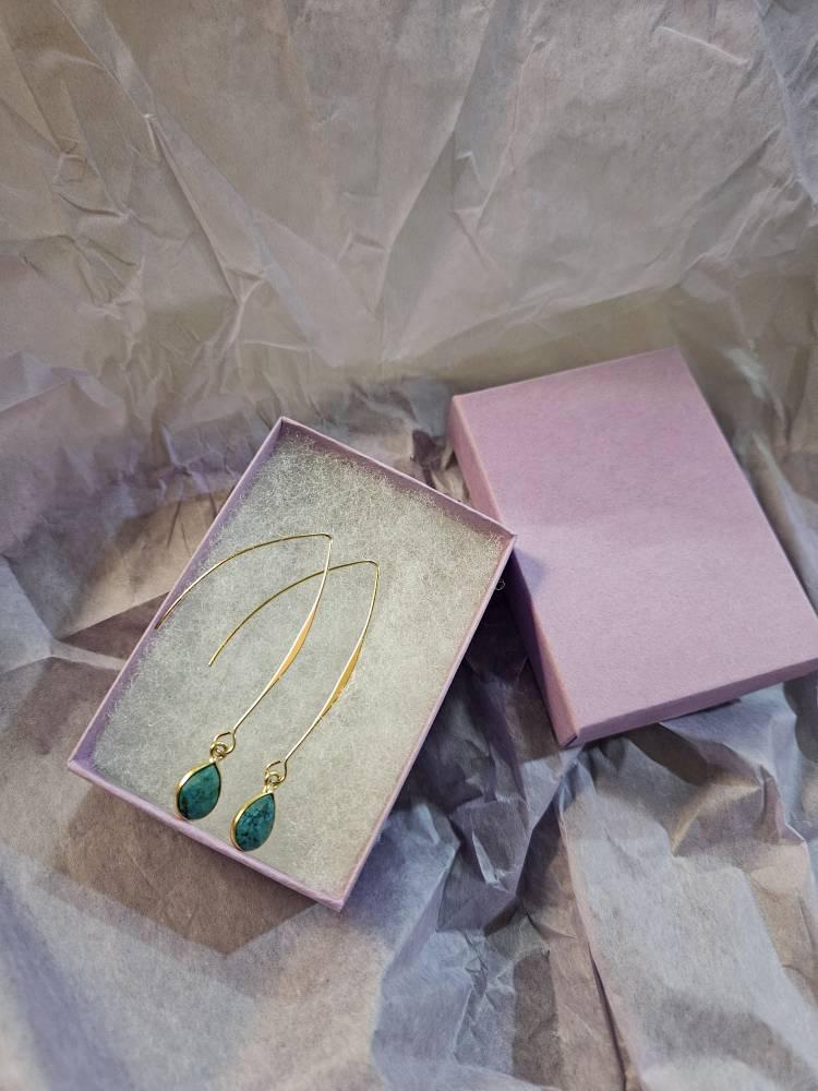 Enhance your everyday outfits with these stunning Turquoise Howlite Earrings featuring dainty gold fishhook style ear wires. These long gold drop earrings showcase a dominant shade of dark teal, dark blue green gemstones that catch the light beautifully. They have subtle natural pebbled patterns in hues of navy blue, cream, white, brown black and plumb purple adding a touch of nature ispired understated boho chic elegance and intrigue to any outfit. These beautiful minimalist dangles are perfect for any occasion, combining the beauty of turquoise howlite with warm gold accents for feminine elegance with a sleek refined modern twist. Crafted with delicate gold fishhook ear wires, these earrings provide a comfortable and secure fit, making them perfect for both everyday wear and special occasions. The captivating turquoise howlite gemstones, with their rich dark teal tones, make these earrings a standout piece in any turquoise howlite jewelry collection, radiating chic boho luxe charm.