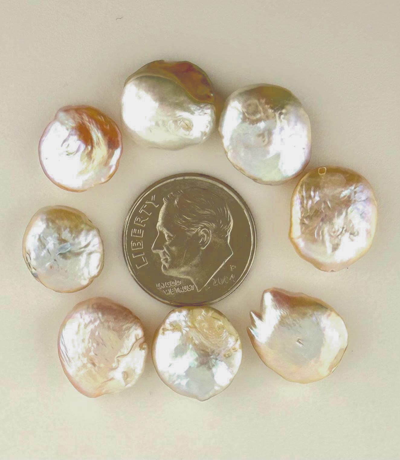 • Genuine peach freshwater coin pearls.