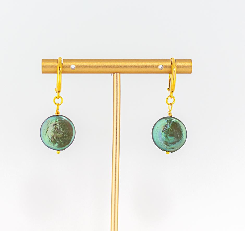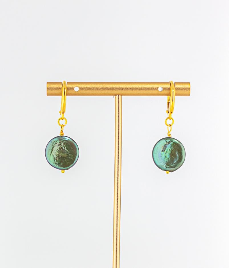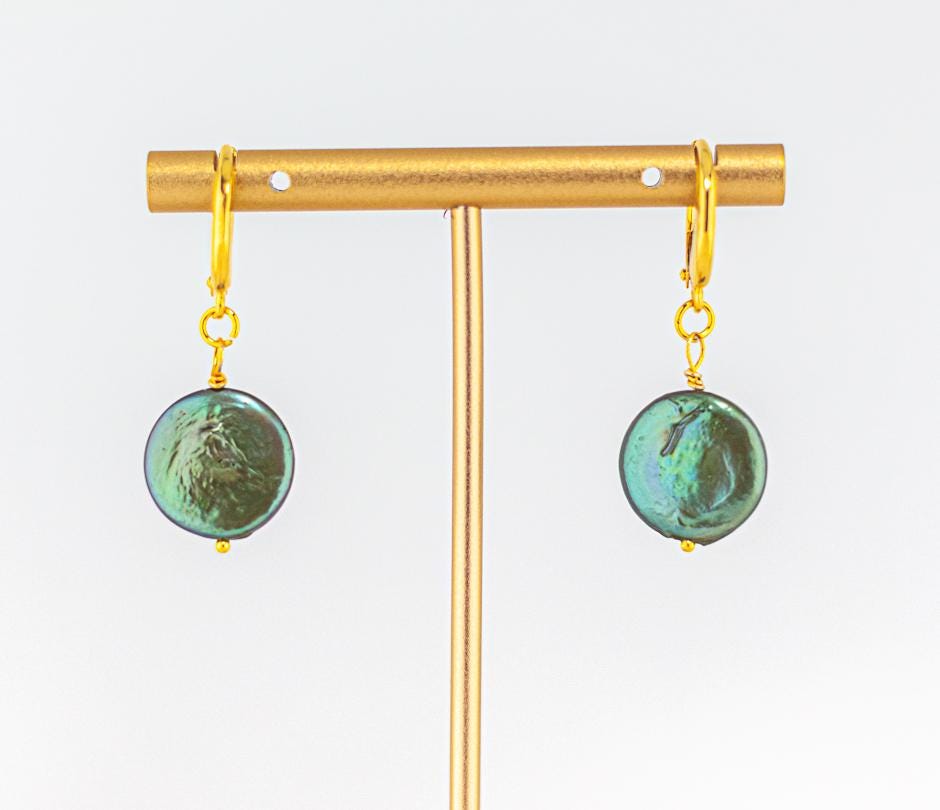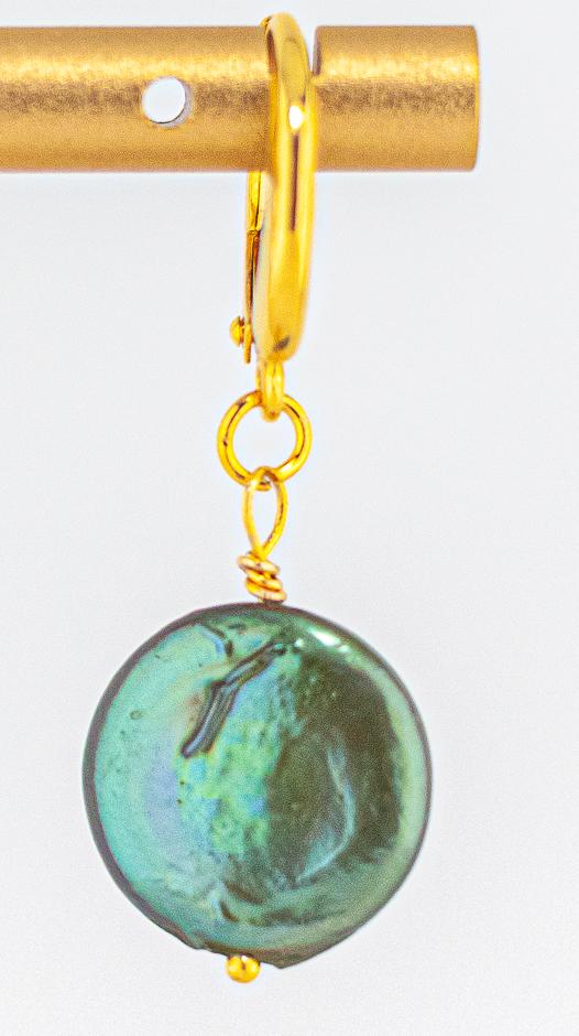 •	Genuine freshwater dark forrest/emerald green coin pearls with subtle irridescence.