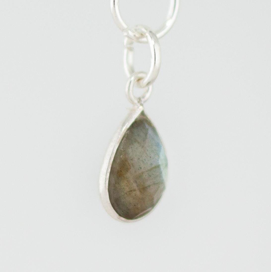 • These teardrop-shaped labradorite stones have shimmering hues of grey, amber,