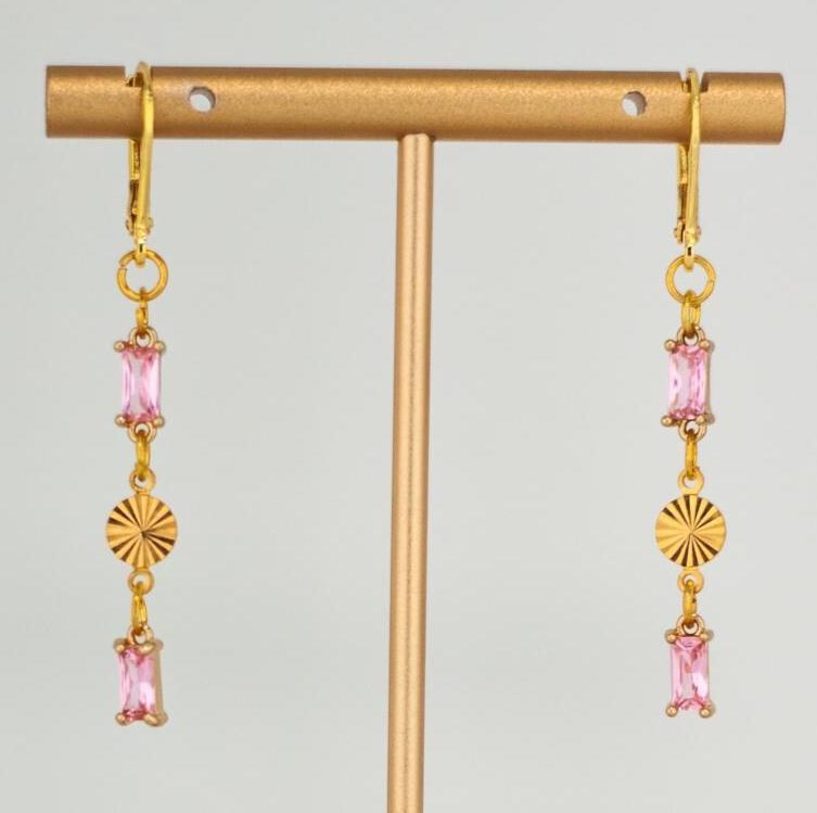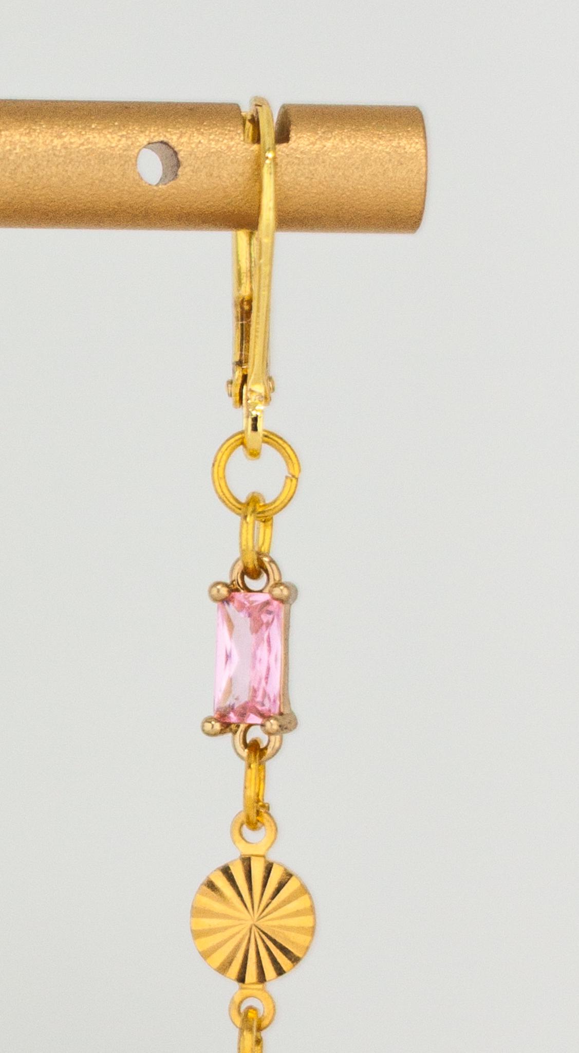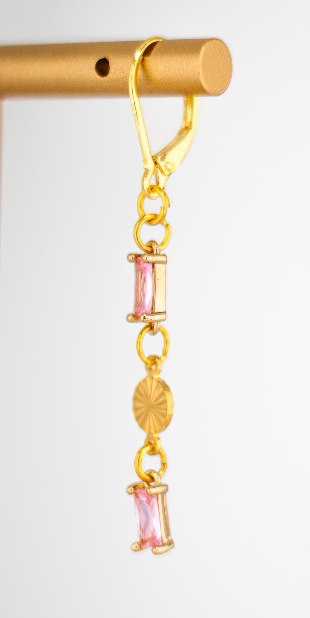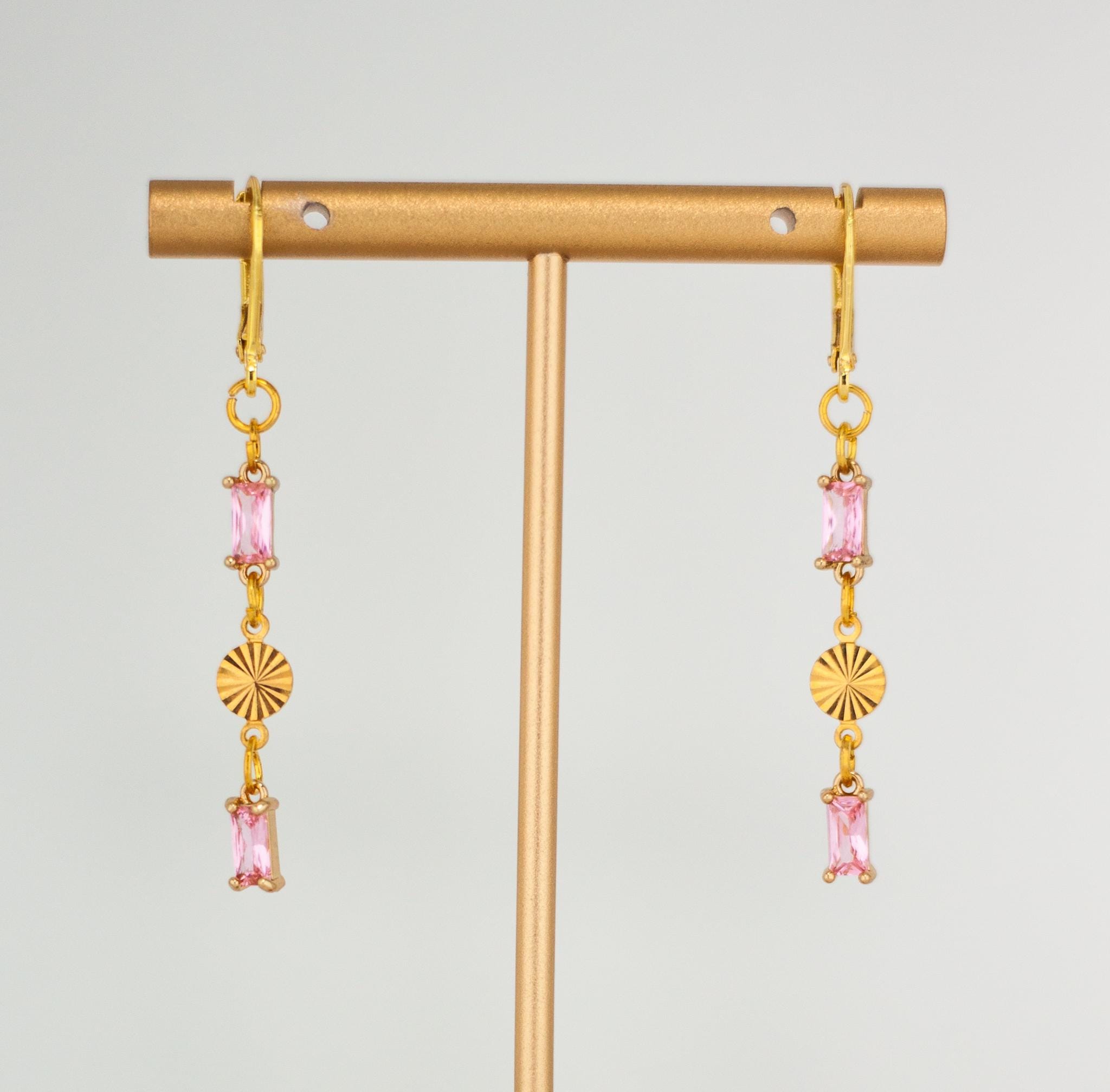 Add a touch of elegance to your look with these Chic Rose Pink Drop Earrings. These dainty gold drop earrings, feature sparkling light pink glass accents. The delicate rectangle-shaped gold links and shimmering pink glass drops create a beautiful balance of modern sophistication and timeless feminine style. Perfect for everyday wear and special occasions, these lightweight glass earrings offer eye-catching subtle sparkle that won’t overpower your look. Crafted from high-quality, hypoallergenic materials, these pink drop earrings are designed for comfort and lasting beauty. Elevate your jewelry collection with these timeless and pretty sparkling pink and gold earrings.