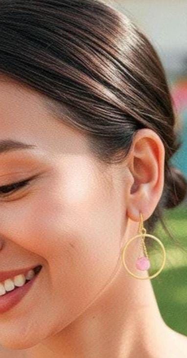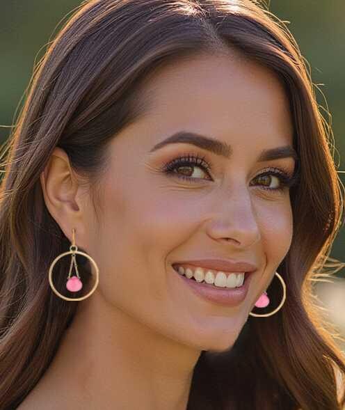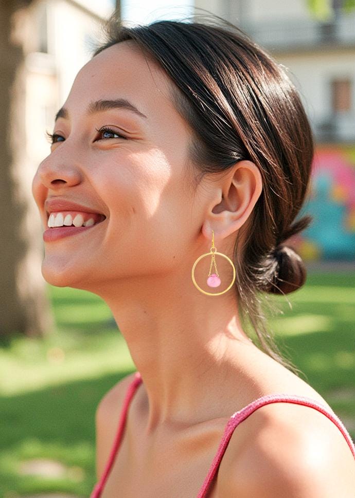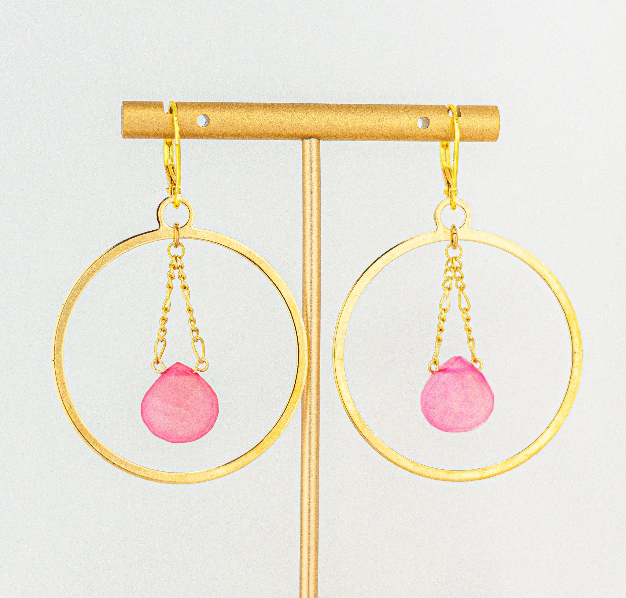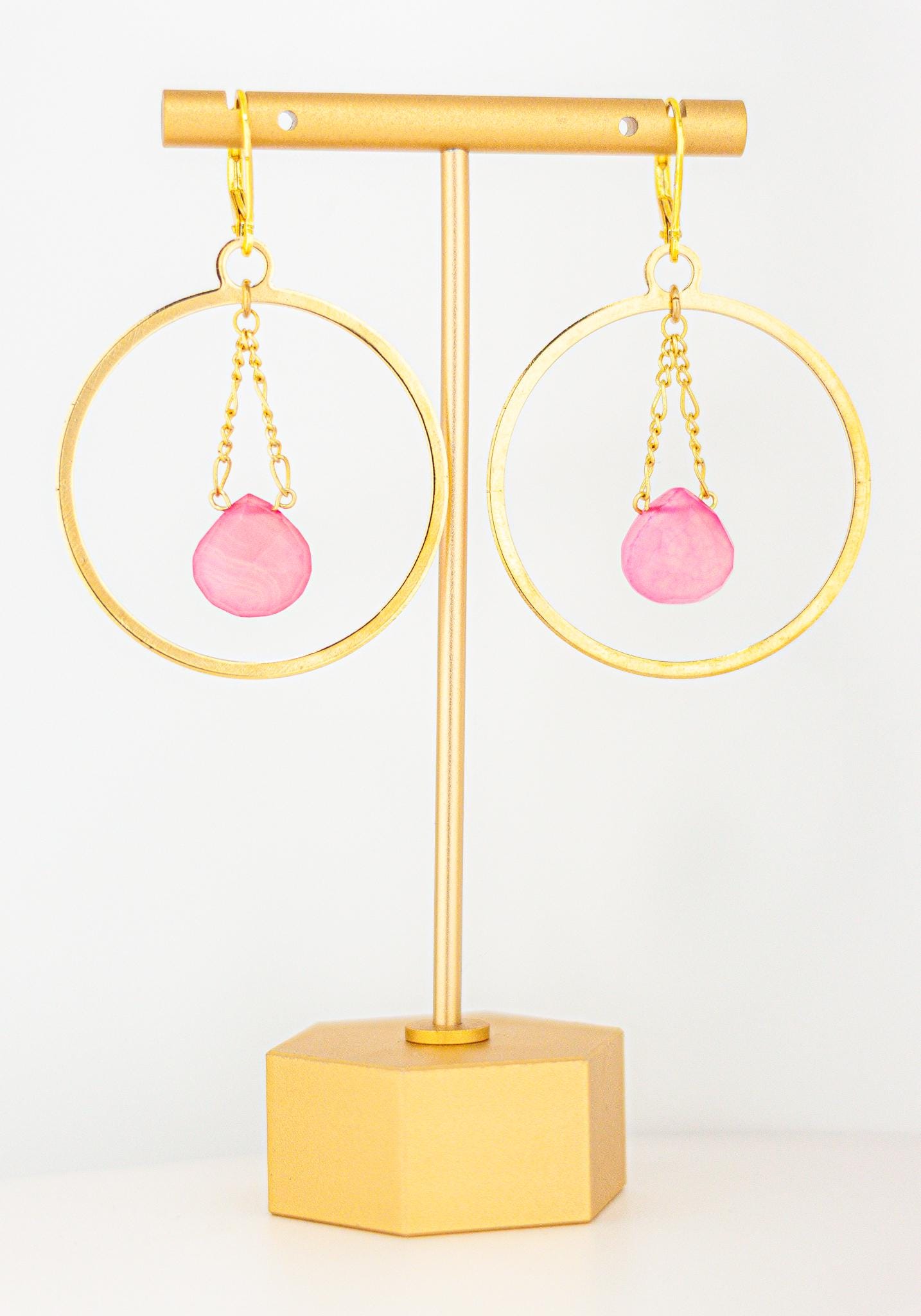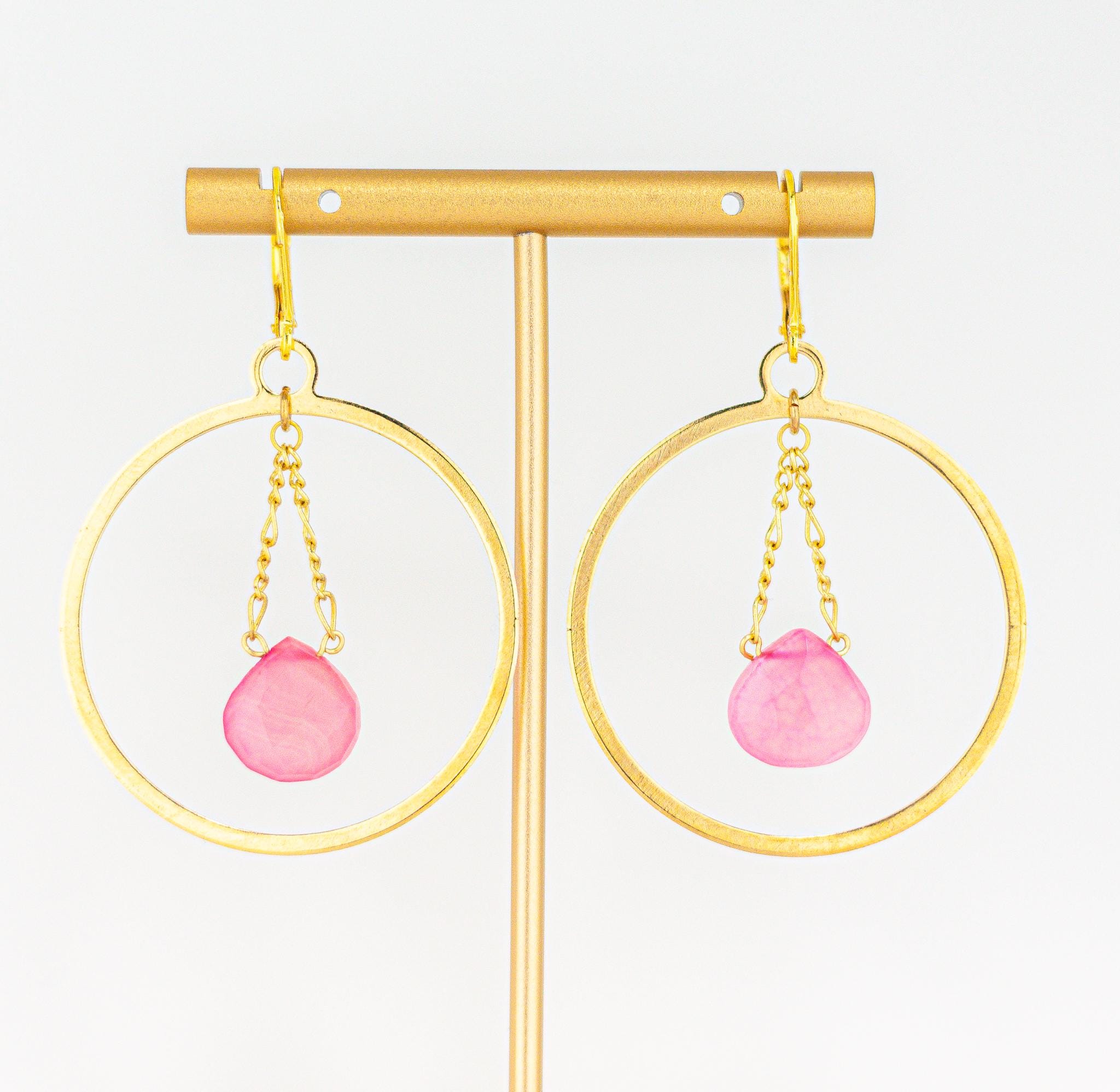 Experience the captivating allure of these rose pink chalcedony and gold hoop earrings! The pretty bubble gum pink chalcedony stones beautifully contrast with the bright gold hoops, creating a playful yet sophisticated look perfect for a night out. Adorned with dazzling teardrop-shaped chalcedony beads, these chic pink gemstone earrings exude modern elegance and a glamorous aura. They make a bold statement while being lightweight, secure, and comfortable. Elevate your boho chic style with these unique light pink and gold statement hoop earrings—an eye-catching addition to your chalcedony jewelry collection! These large gold hoop earrings shimmer with feminine charm, blending timeless elegance with a modern boho chic twist. Lightweight yet eye-catching, they are perfect for wedding guest outfits, special occasions, or everyday wear.