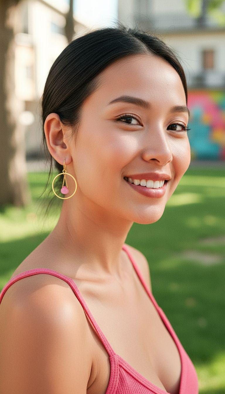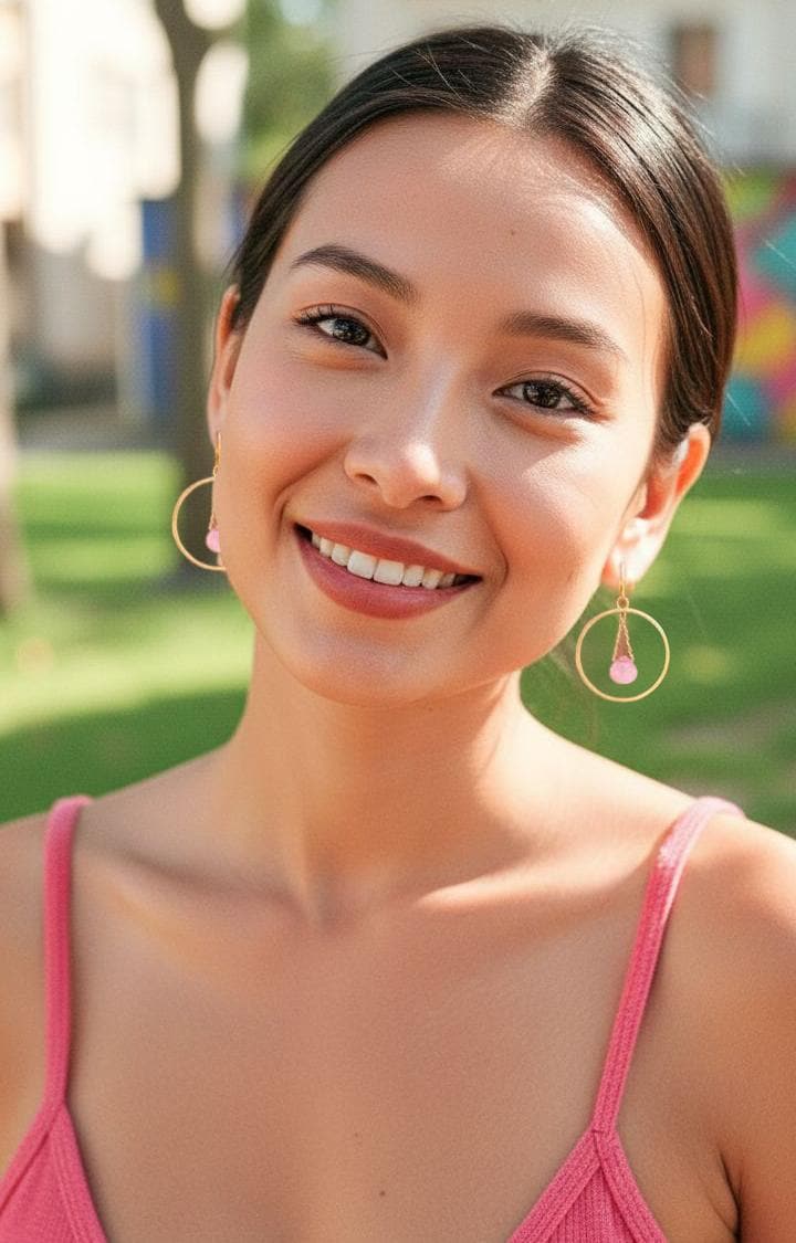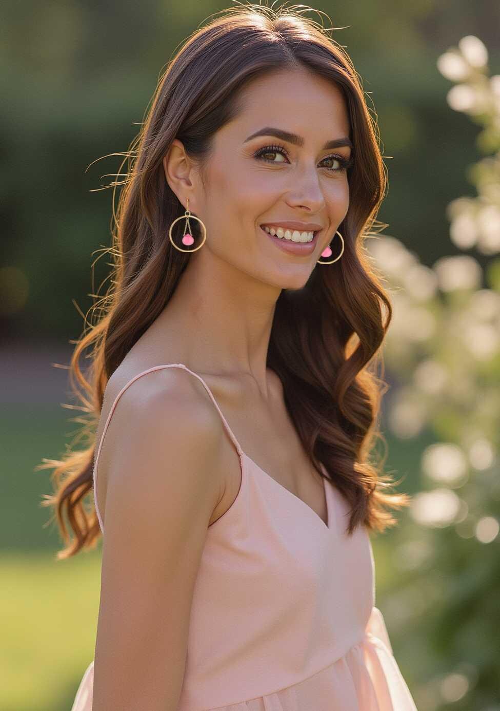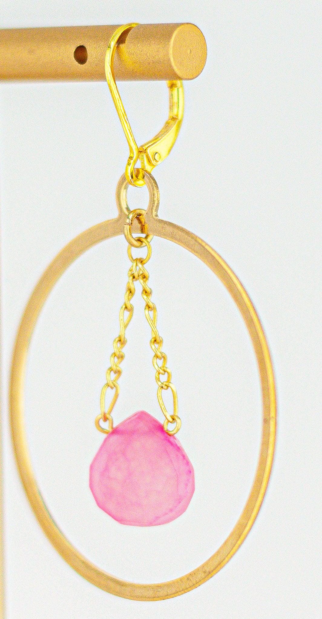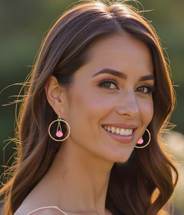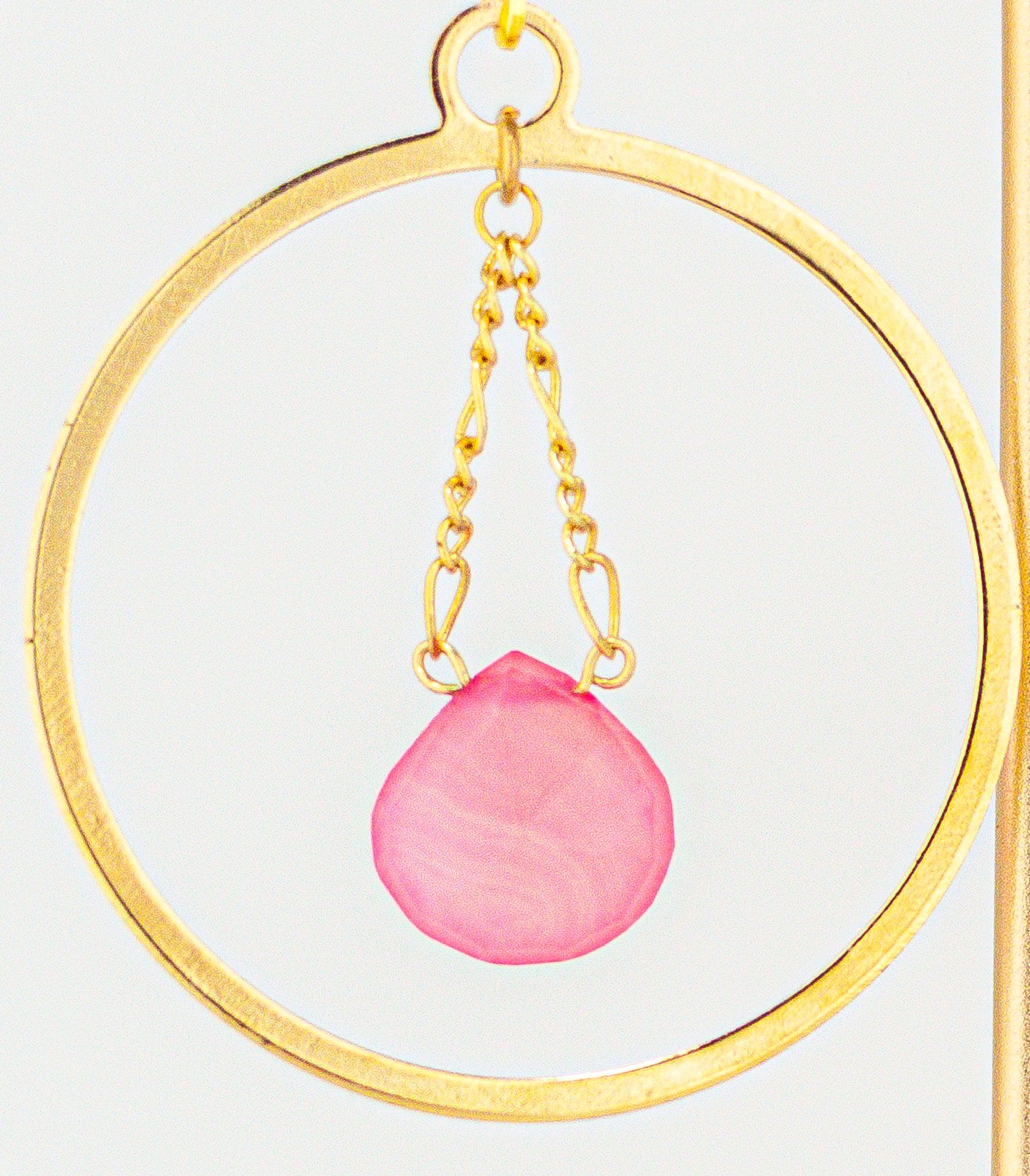 Experience the captivating allure of these rose pink chalcedony and gold hoop earrings! The pretty bubble gum pink chalcedony stones beautifully contrast with the bright gold hoops, creating a playful yet sophisticated look perfect for a night out. Adorned with dazzling teardrop-shaped chalcedony beads, these chic pink gemstone earrings exude modern elegance and a glamorous aura. They make a bold statement while being lightweight, secure, and comfortable. Elevate your boho chic style with these unique light pink and gold statement hoop earrings—an eye-catching addition to your chalcedony jewelry collection! These large gold hoop earrings shimmer with feminine charm, blending timeless elegance with a modern boho chic twist. Lightweight yet eye-catching, they are perfect for wedding guest outfits, special occasions, or everyday wear.
