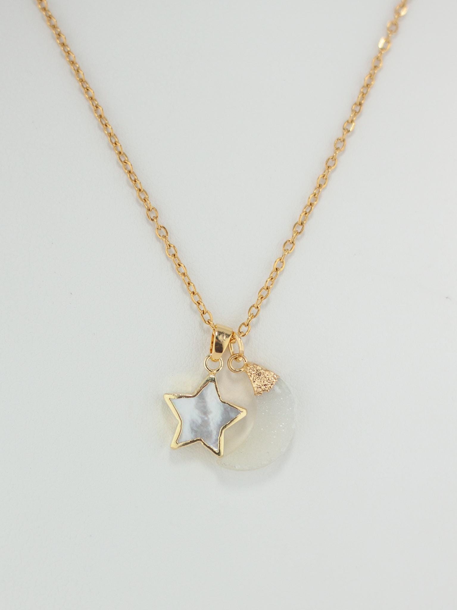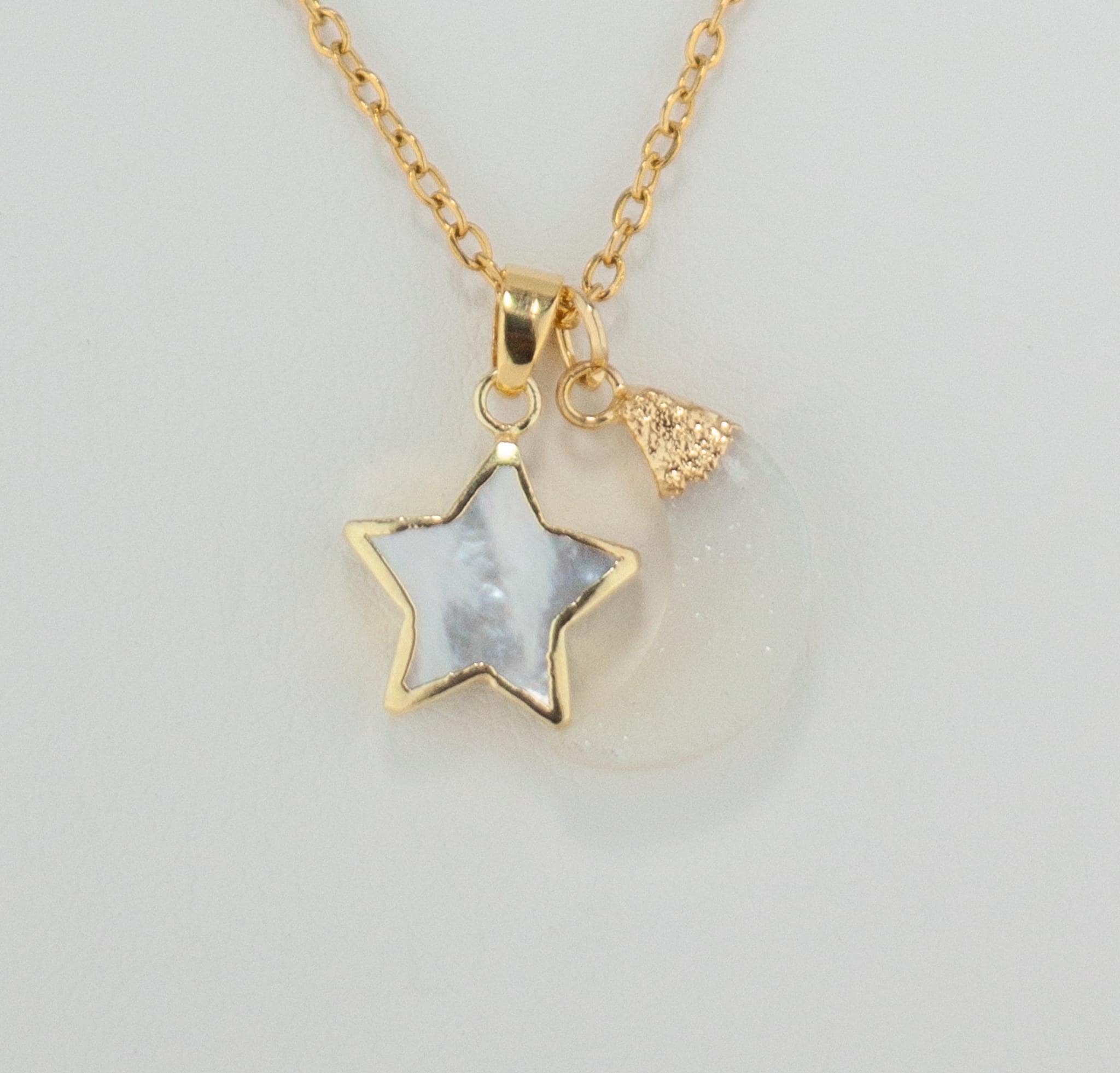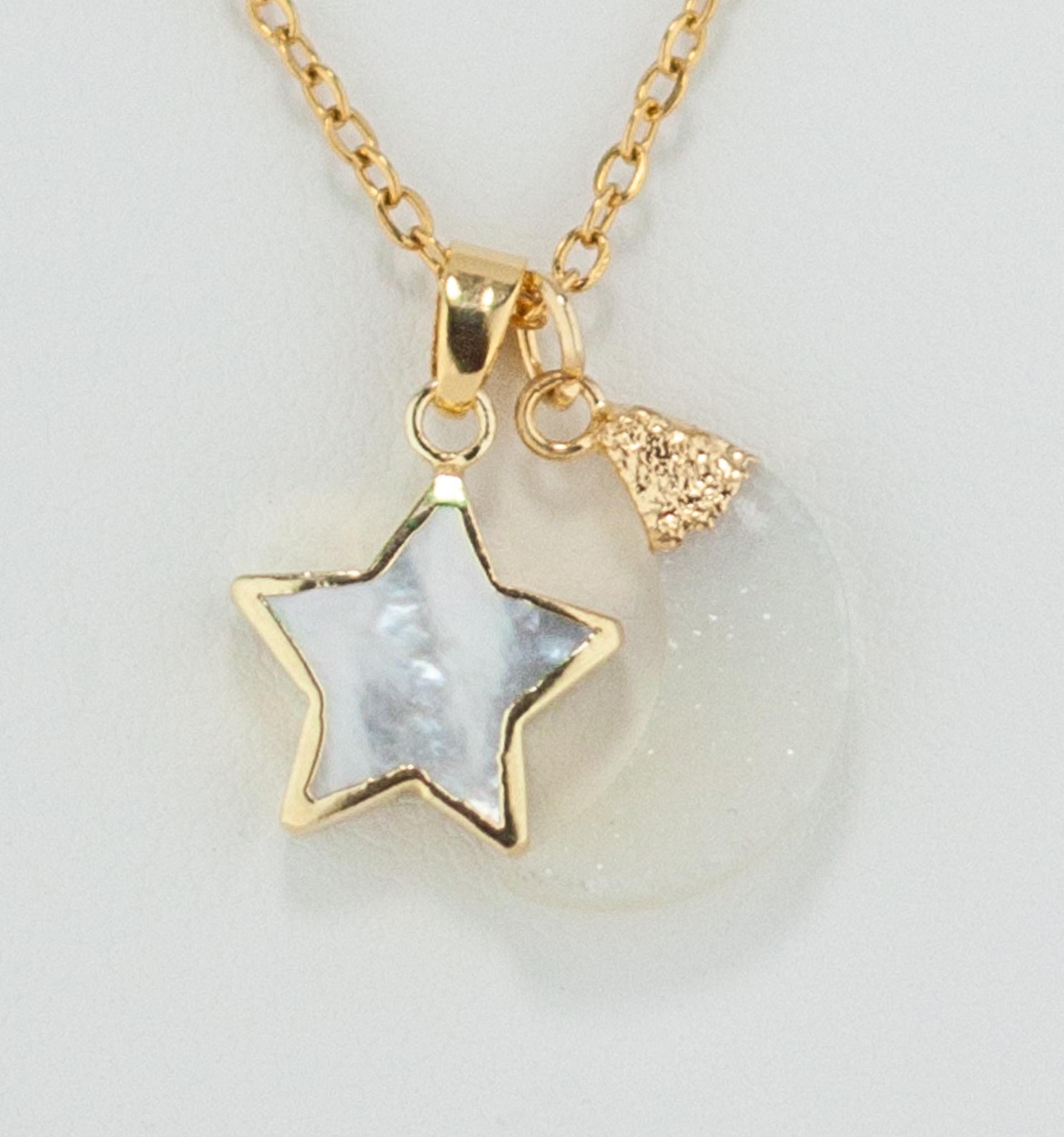 Add a touch of celestial elegance to your jewelry collection with this Moon and Star Gold Charm Necklace, featuring a luminous mother of pearl charm paired with a frosted druzy white gemstone. The dainty gold chain creates a feminine, lightweight feel perfect for everyday wear, layering, or gifting. This delicate and dreamy necklace blends girly charm with timeless sophistication, making it ideal for special occasions such as weddings, birthdays, anniversaries, or as a thoughtful bridesmaid gift. The moon and star motifs symbolize guidance, dreams, and inspiration, while the shimmering mother of pearl and frosted druzy gemstone add subtle sparkle and natural beauty.