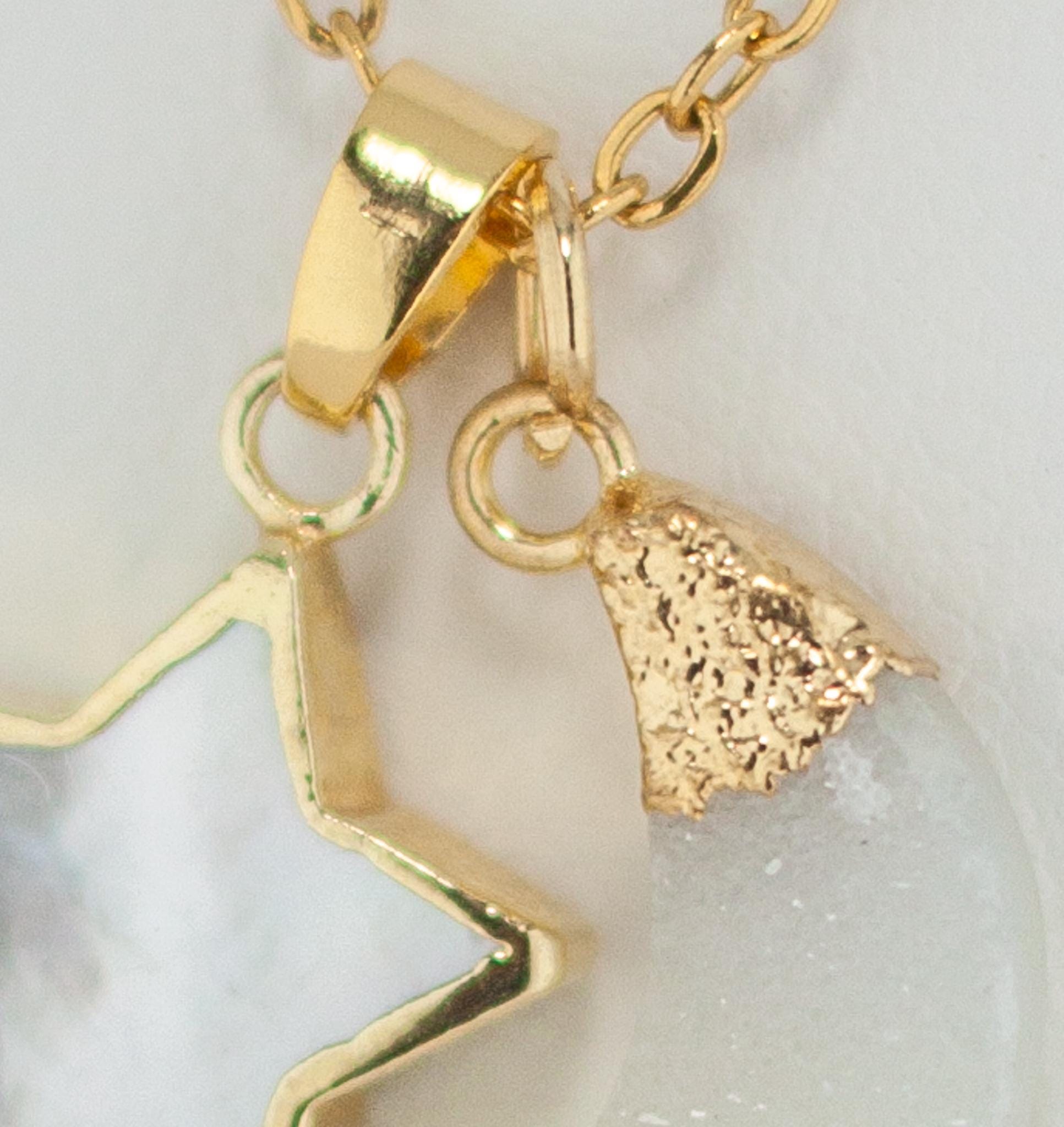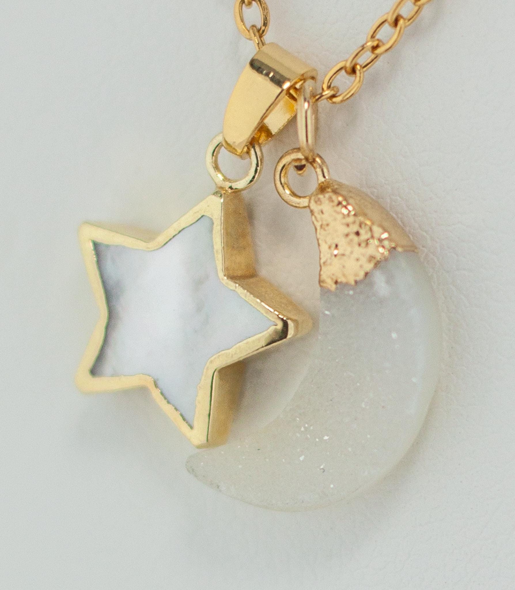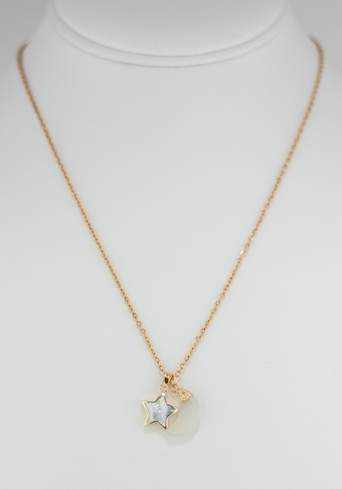 Add a touch of celestial elegance to your jewelry collection with this Moon and Star Gold Charm Necklace, featuring a luminous mother of pearl charm paired with a frosted druzy white gemstone. The dainty gold chain creates a feminine, lightweight feel perfect for everyday wear, layering, or gifting. This delicate and dreamy necklace blends girly charm with timeless sophistication, making it ideal for special occasions such as weddings, birthdays, anniversaries, or as a thoughtful bridesmaid gift. The moon and star motifs symbolize guidance, dreams, and inspiration, while the shimmering mother of pearl and frosted druzy gemstone add subtle sparkle and natural beauty.