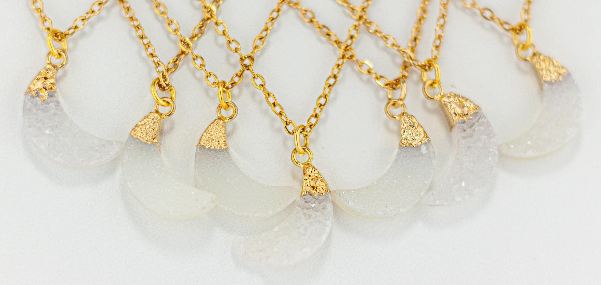 •	Genuine crescent moon shaped white druzy crystal charm with gold leaf detail