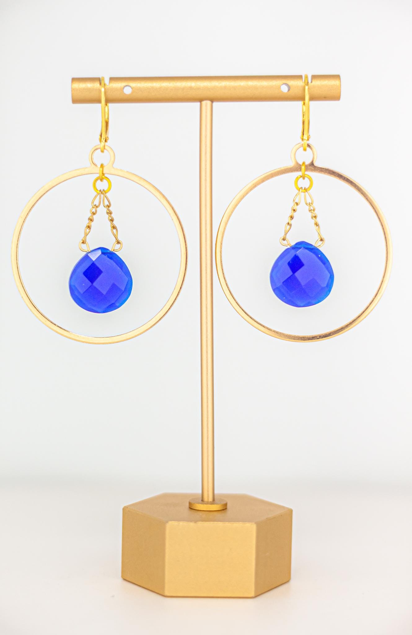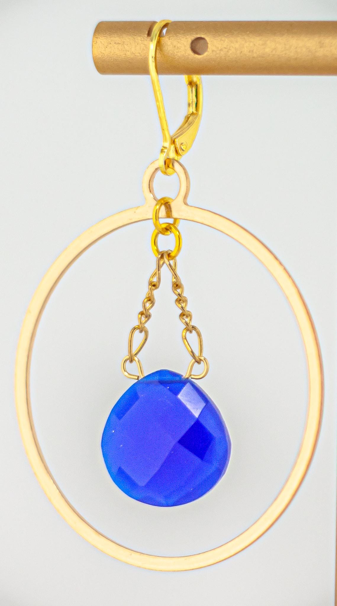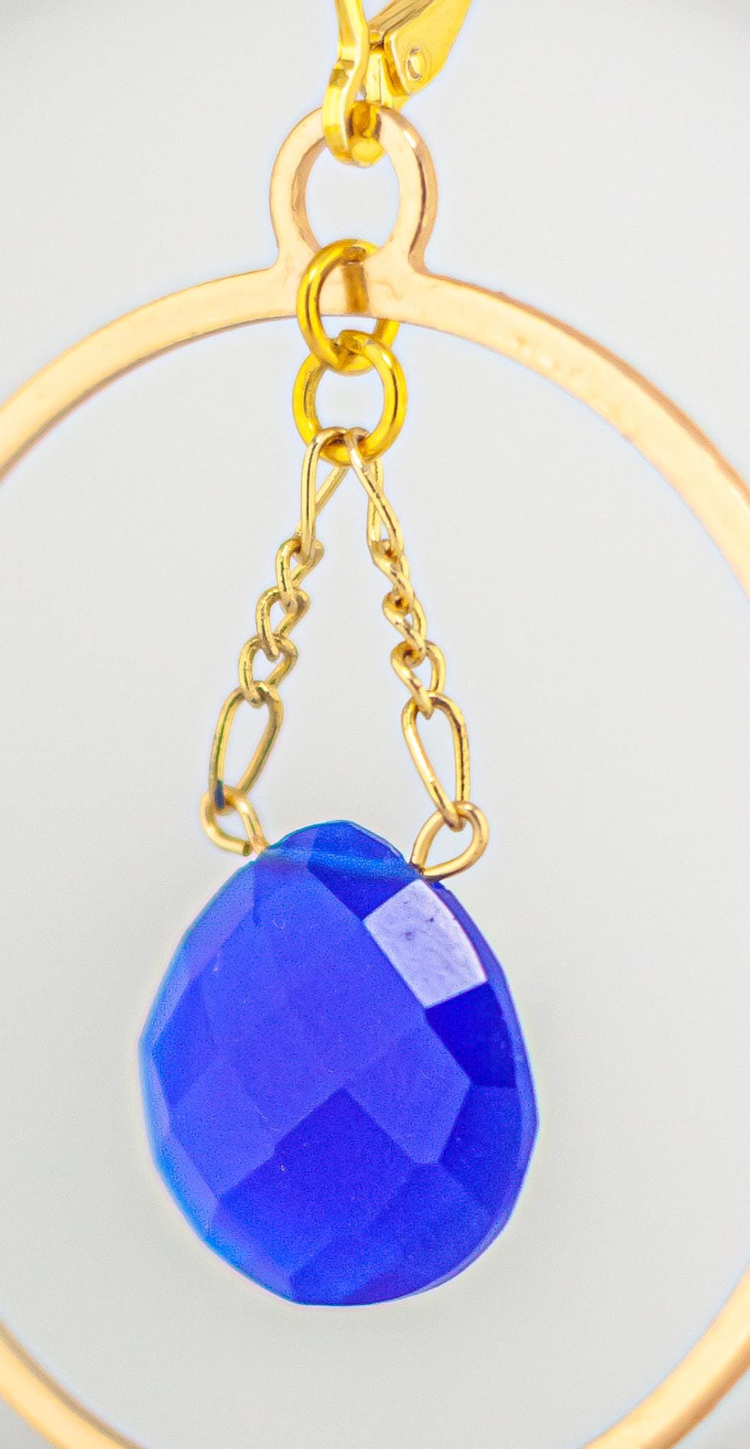 Experience the alluring attention-grabbing power of these stunning cobalt blue chalcedony statement hoop earrings! The vibrant shimmering navy shade of the chalcedony beautifully contrasts with the gold hoops, creating a dazzling colorful combination and playful, unique style that's perfect for a night out. Combining the glamour of a hoop with the movement of a dangle earrings this pretty blue accessory will liven up your look with a bold pop of color. Adorned with smooth faceted bright blue chalcedony beads, these boho chic gold earrings exude modern elegance and radiate a glamorous contemporary aura.