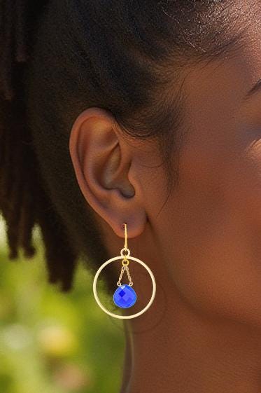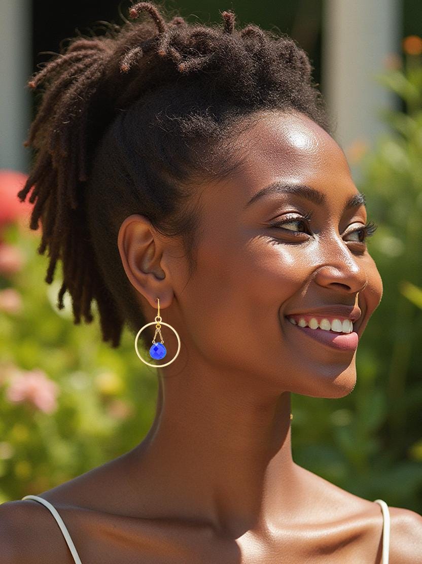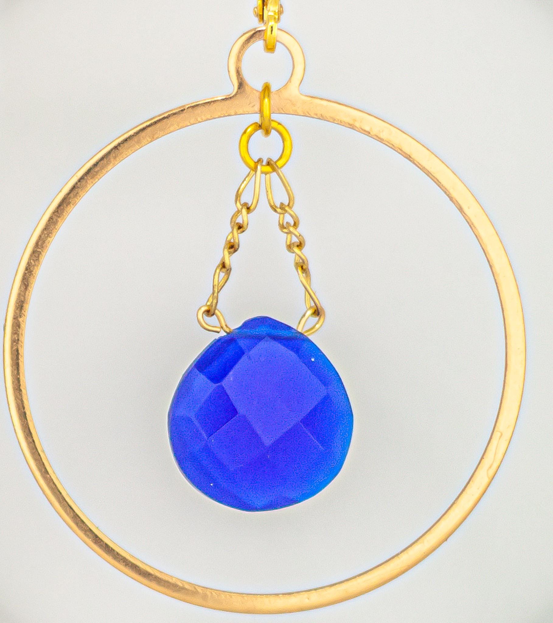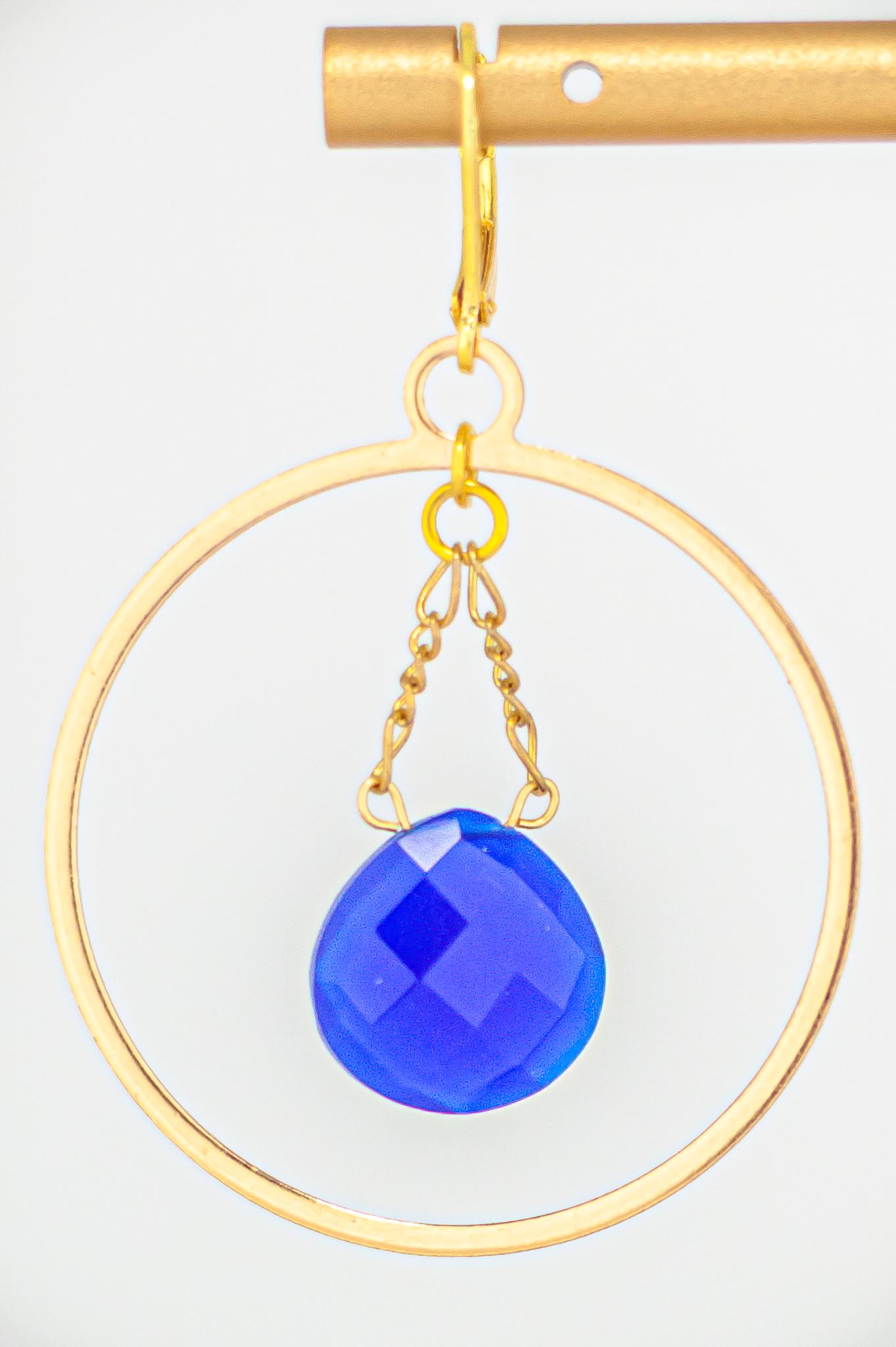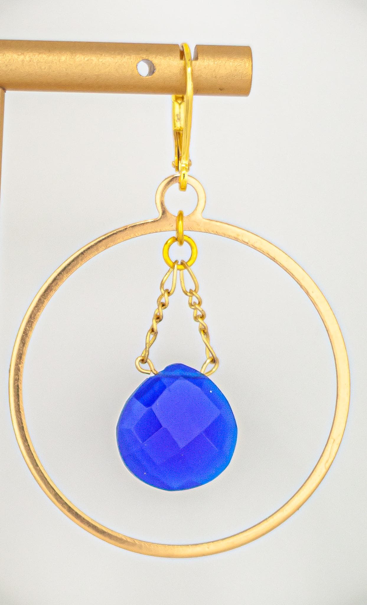Experience the alluring attention-grabbing power of these stunning cobalt blue chalcedony statement hoop earrings! The vibrant shimmering navy shade of the chalcedony beautifully contrasts with the gold hoops, creating a dazzling colorful combination and playful, unique style that's perfect for a night out. Combining the glamour of a hoop with the movement of a dangle earrings this pretty blue accessory will liven up your look with a bold pop of color. Adorned with smooth faceted bright blue chalcedony beads, these boho chic gold earrings exude modern elegance and radiate a glamorous contemporary aura.