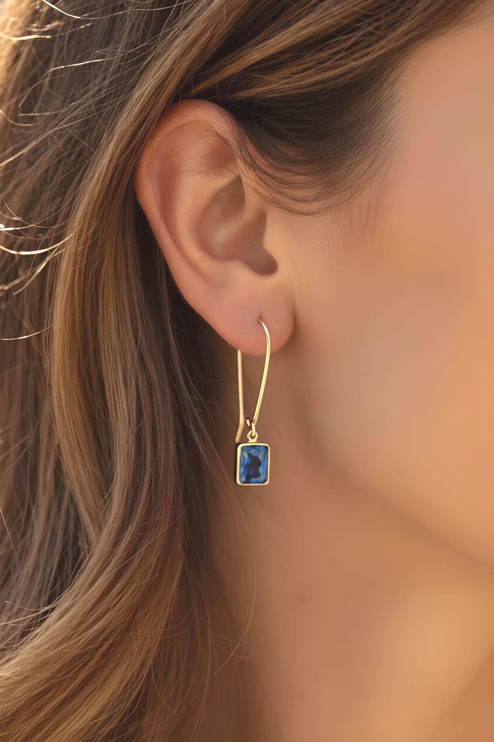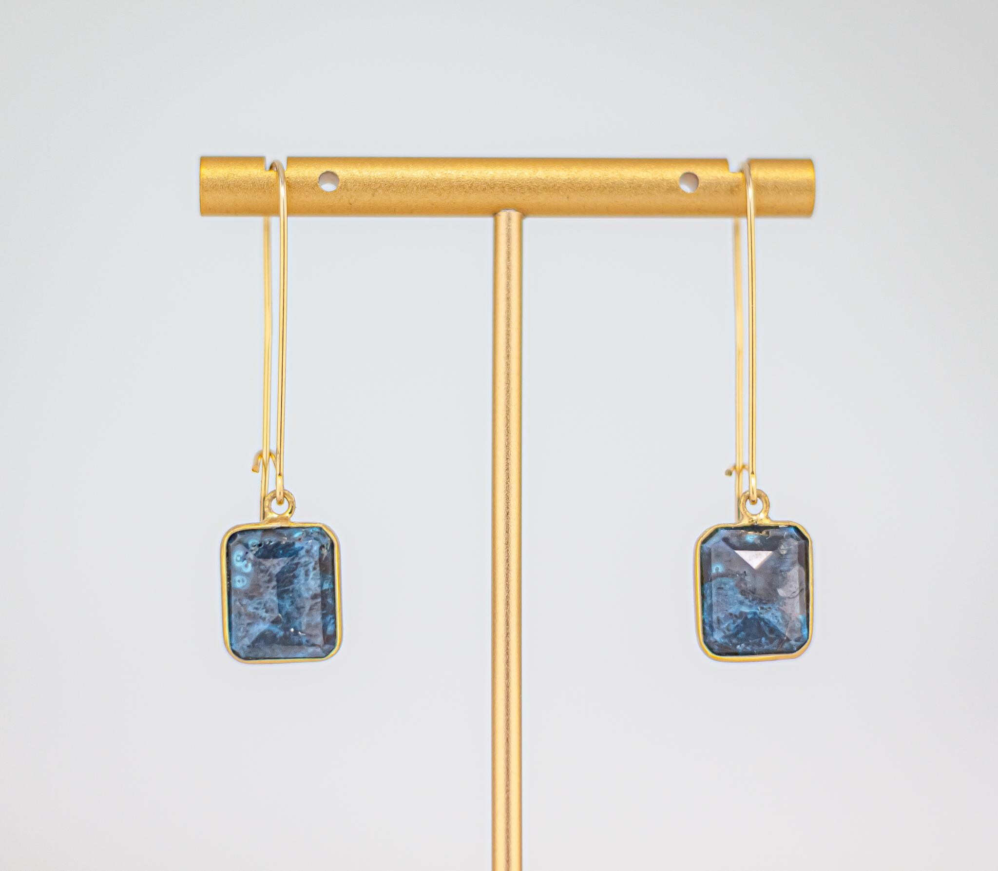 Elevate your boho luxe style with these stunning Long Gold Dangle Earrings featuring natural marbled chrysocolla gemstones. Each blue gemstone is smooth with a glossy sheen and a uniquely patterned with mesmerizing swirls of cobalt and navy blue, teal, turquoise, aqua, plumb purple and deep green, creating one-of-a-kind statement earrings. The long delicate gold drop design is perfect for adding a bold pop of color and sophistication to your look.