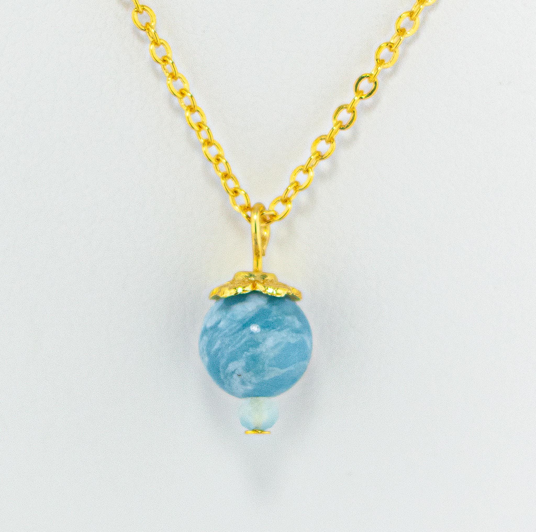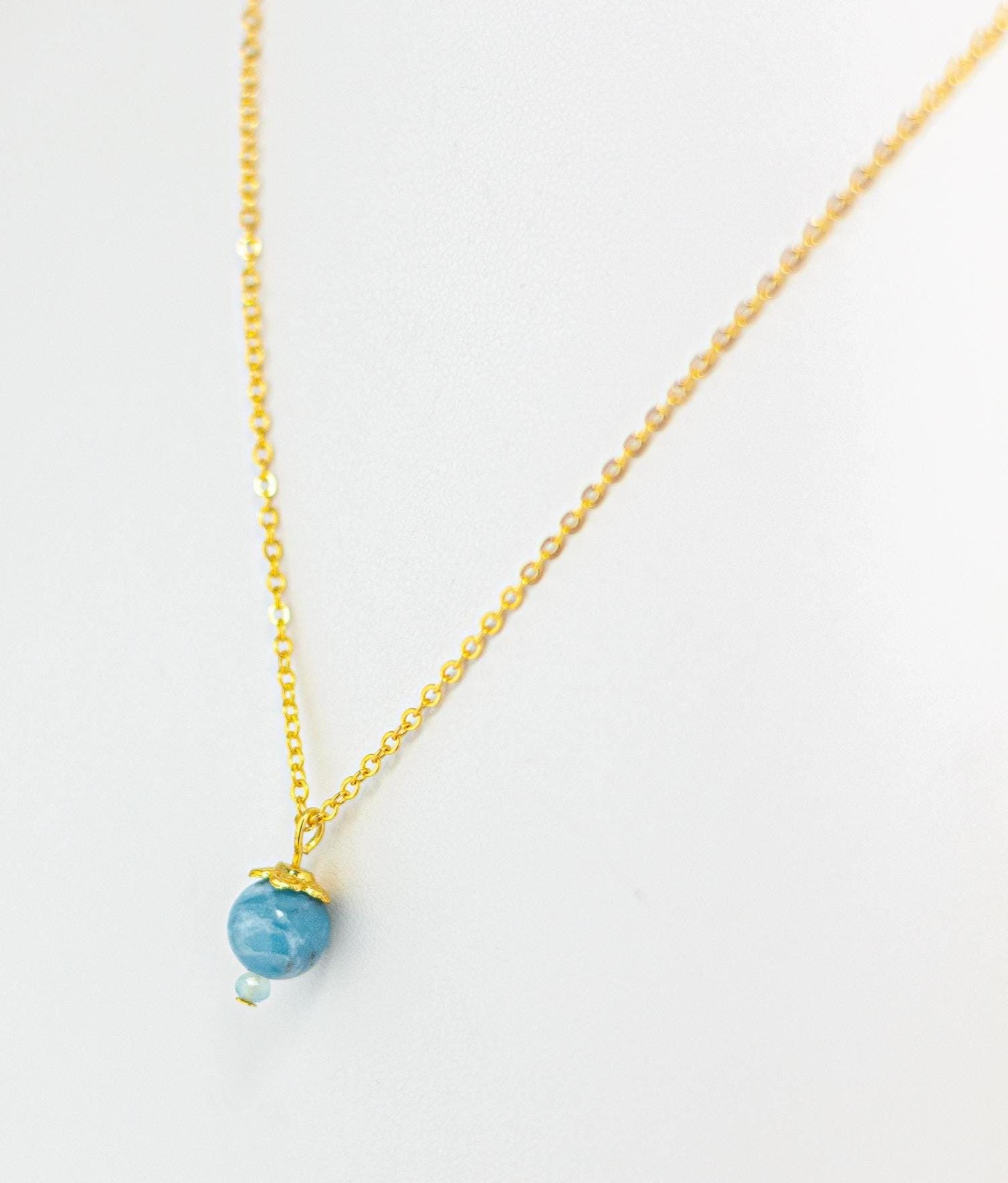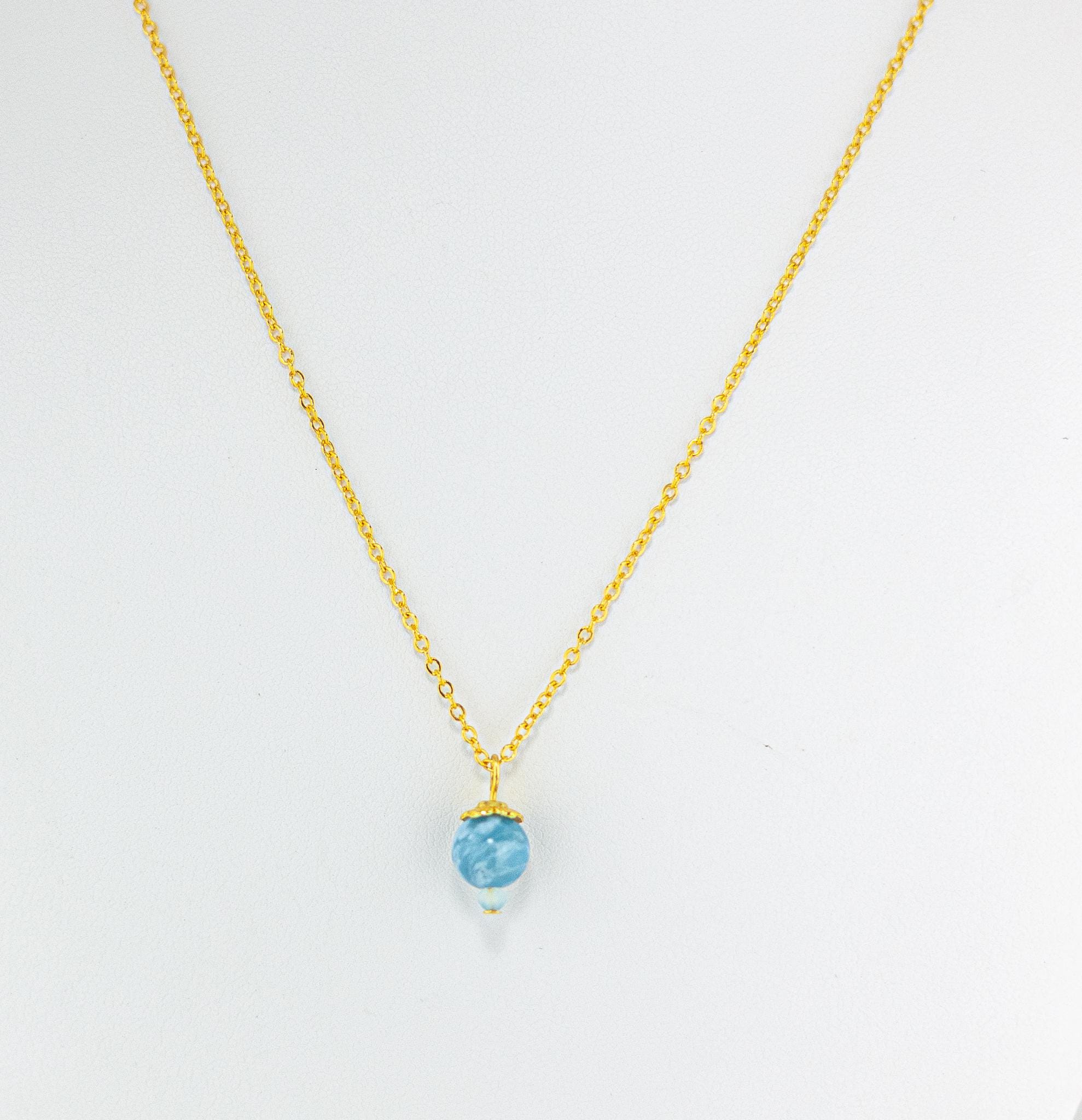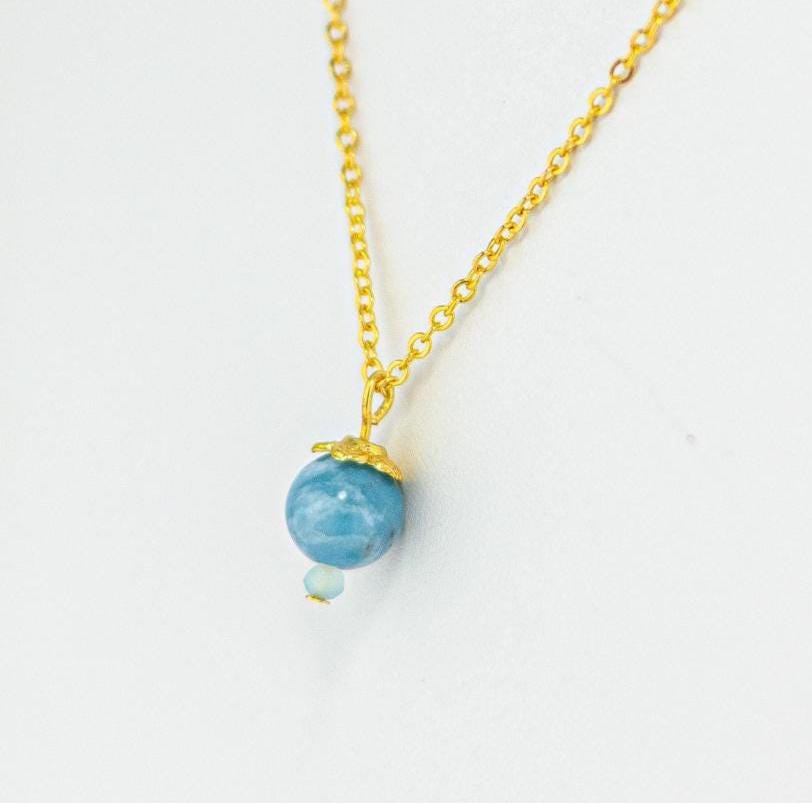 This Elegant Sky Blue Larimar Necklace exudes soft sophistication and natural beauty. Featuring a marbled swirling blue Larimar gemstone accented by pale blue chalcedony beads and shiny gold details, this dainty necklace captures the tranquil essence of the summer sky and simple feminine style.