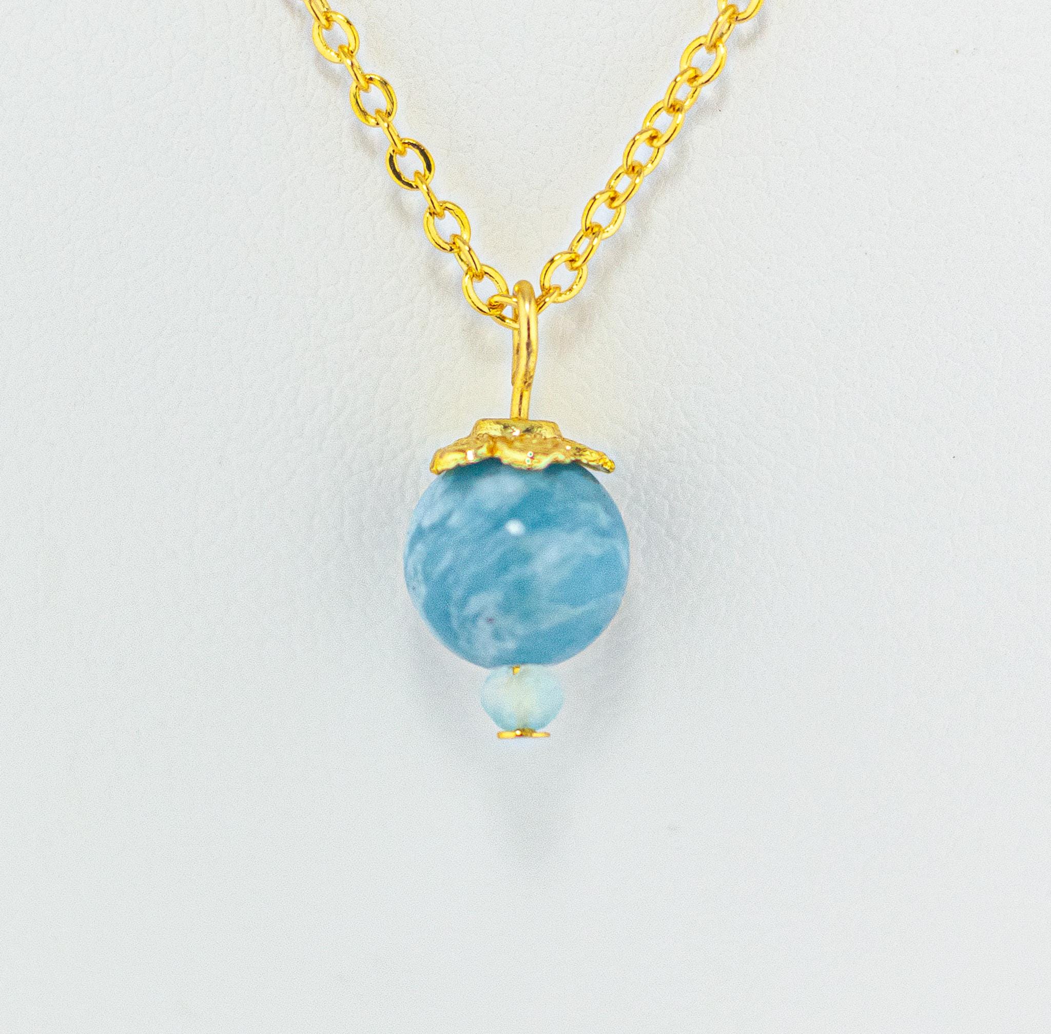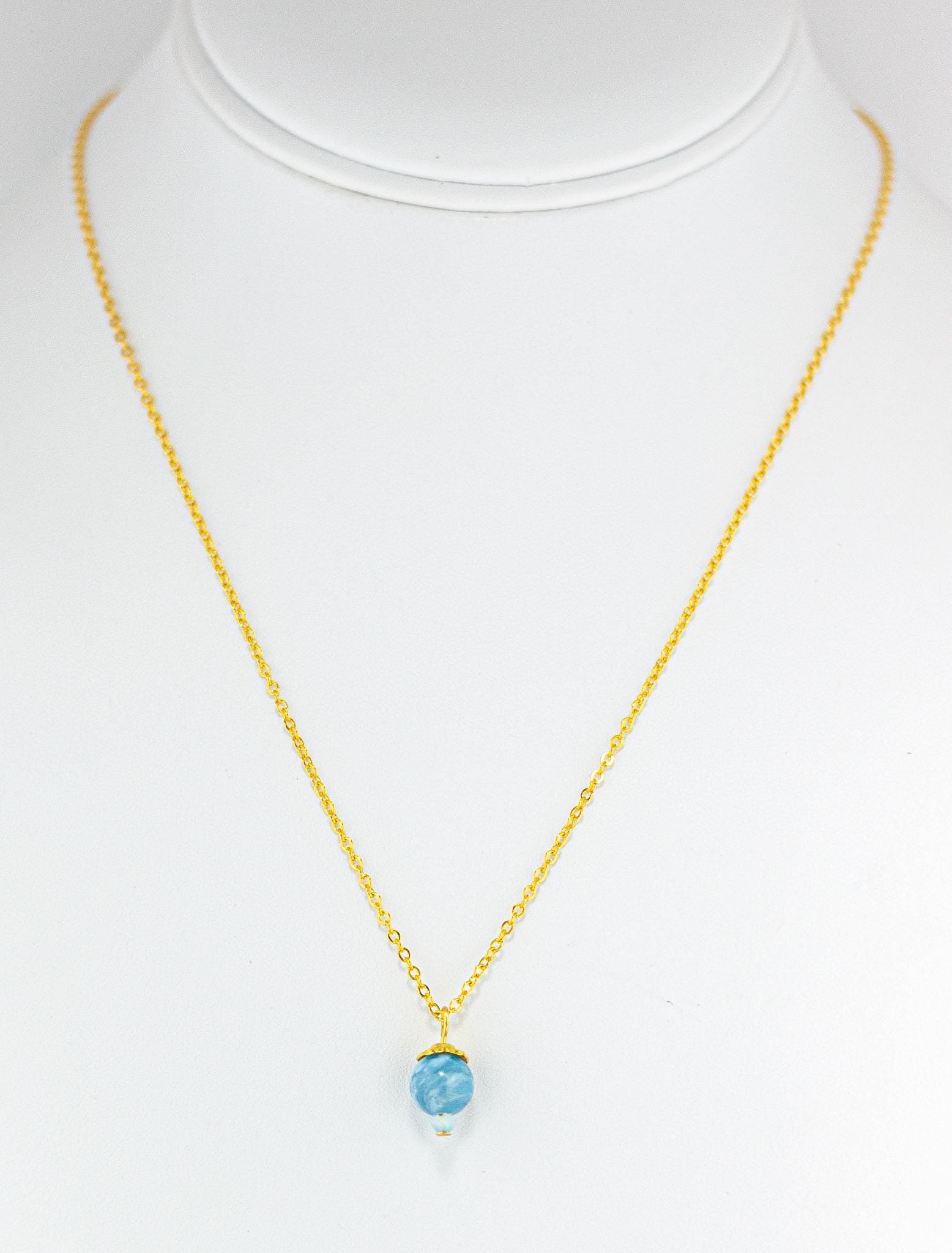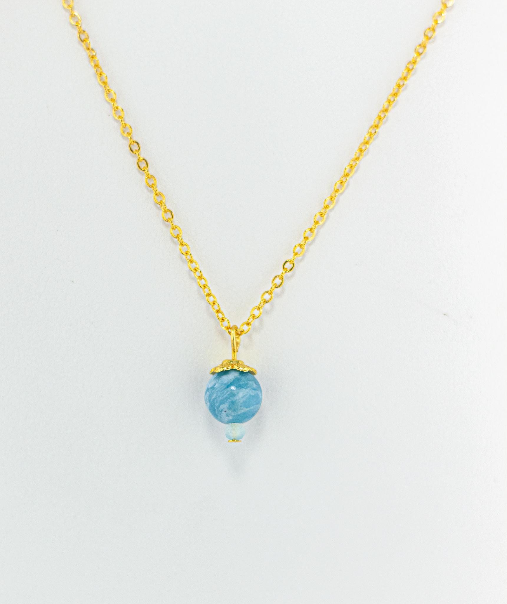 This Elegant Sky Blue Larimar Necklace exudes soft sophistication and natural beauty. Featuring a marbled swirling blue Larimar gemstone accented by pale blue chalcedony beads and shiny gold details, this dainty necklace captures the tranquil essence of the summer sky and simple feminine style.