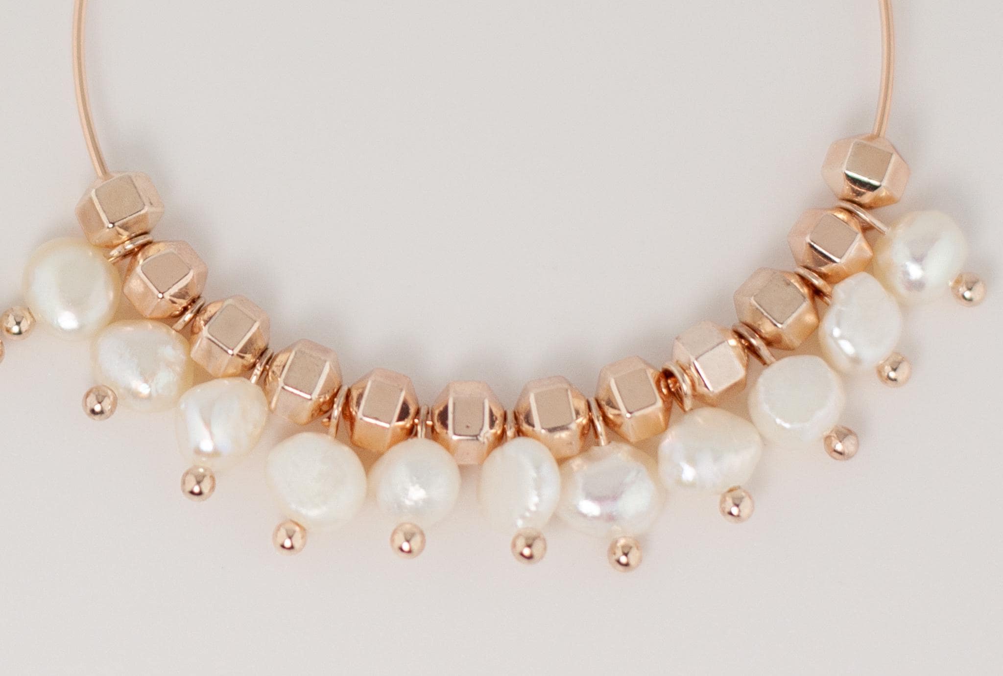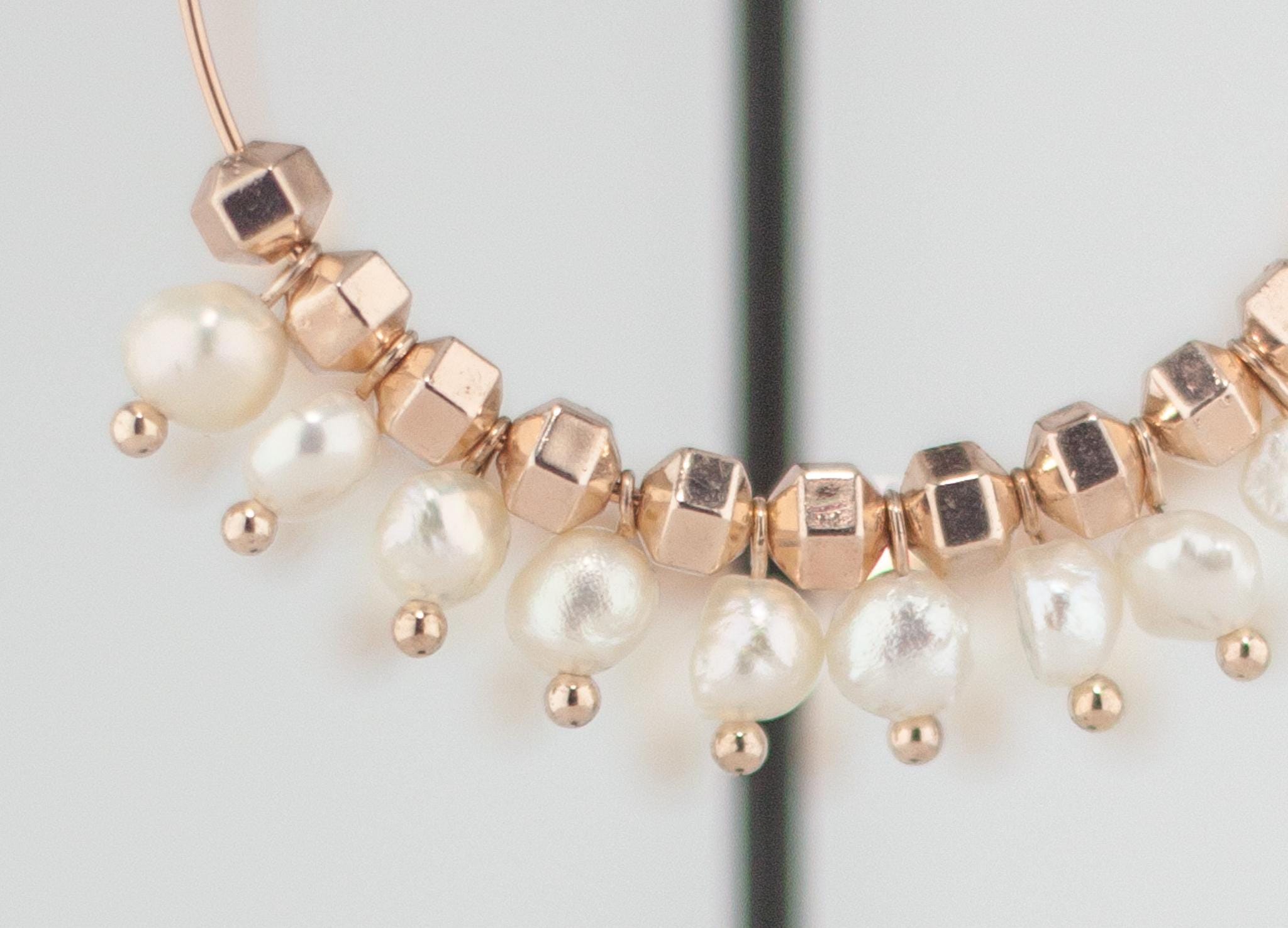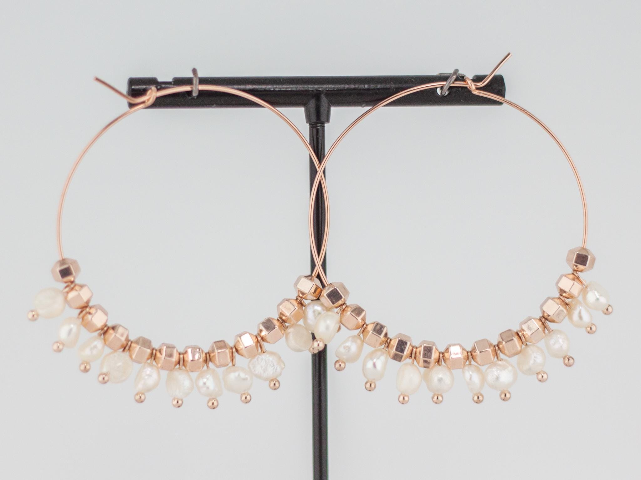 Experience the boho chic beauty, elegance, and understated glamour of our Petit-pearls and rose gold hoop earrings. These stunning pearl hoop earrings showcase iridescent petit pearls in shimmering shades of white, cream, pink, green, and lavender. The pretty white pearls pair perfectly with rose gold hematite beads and delicate blush pink tones.