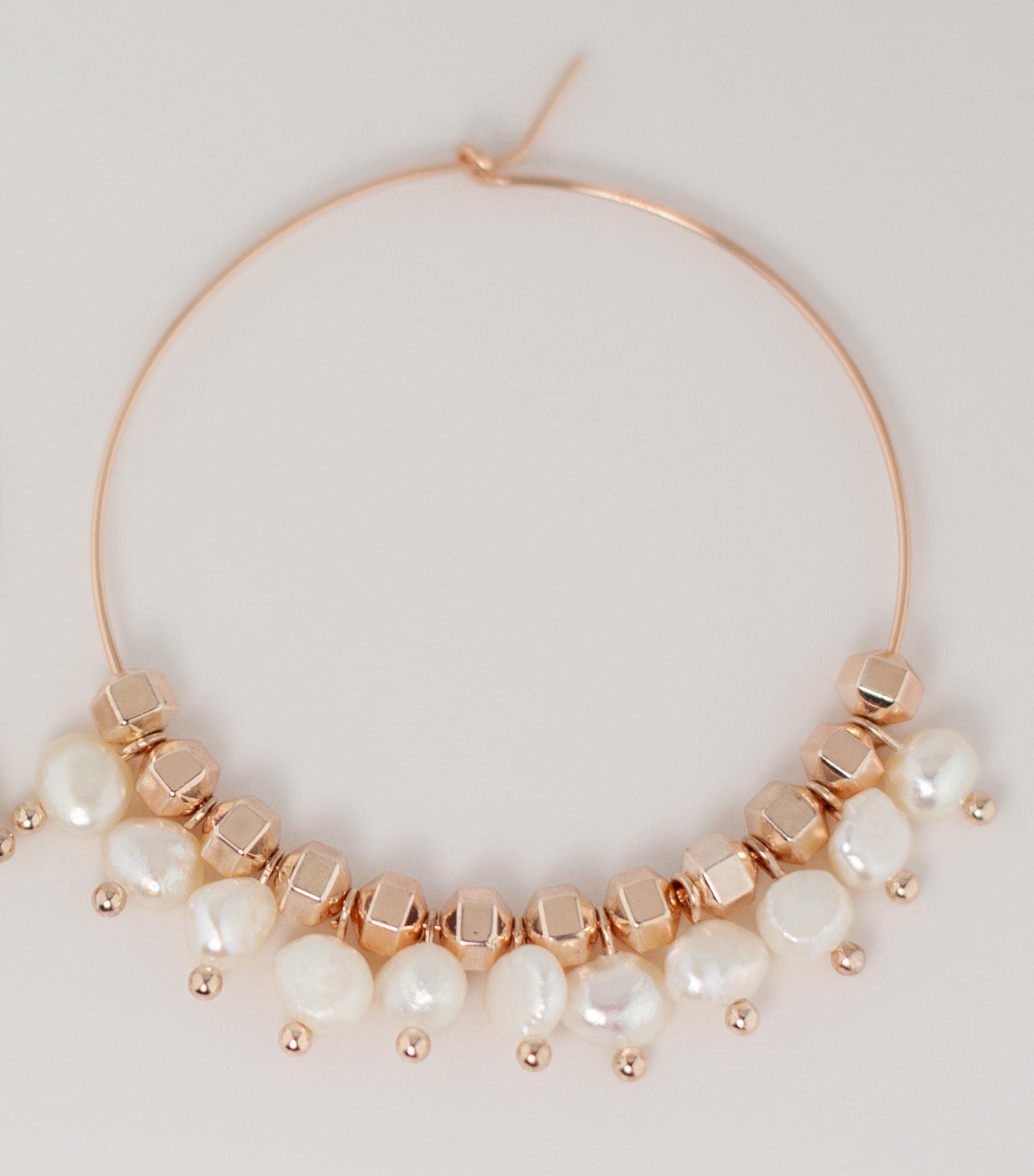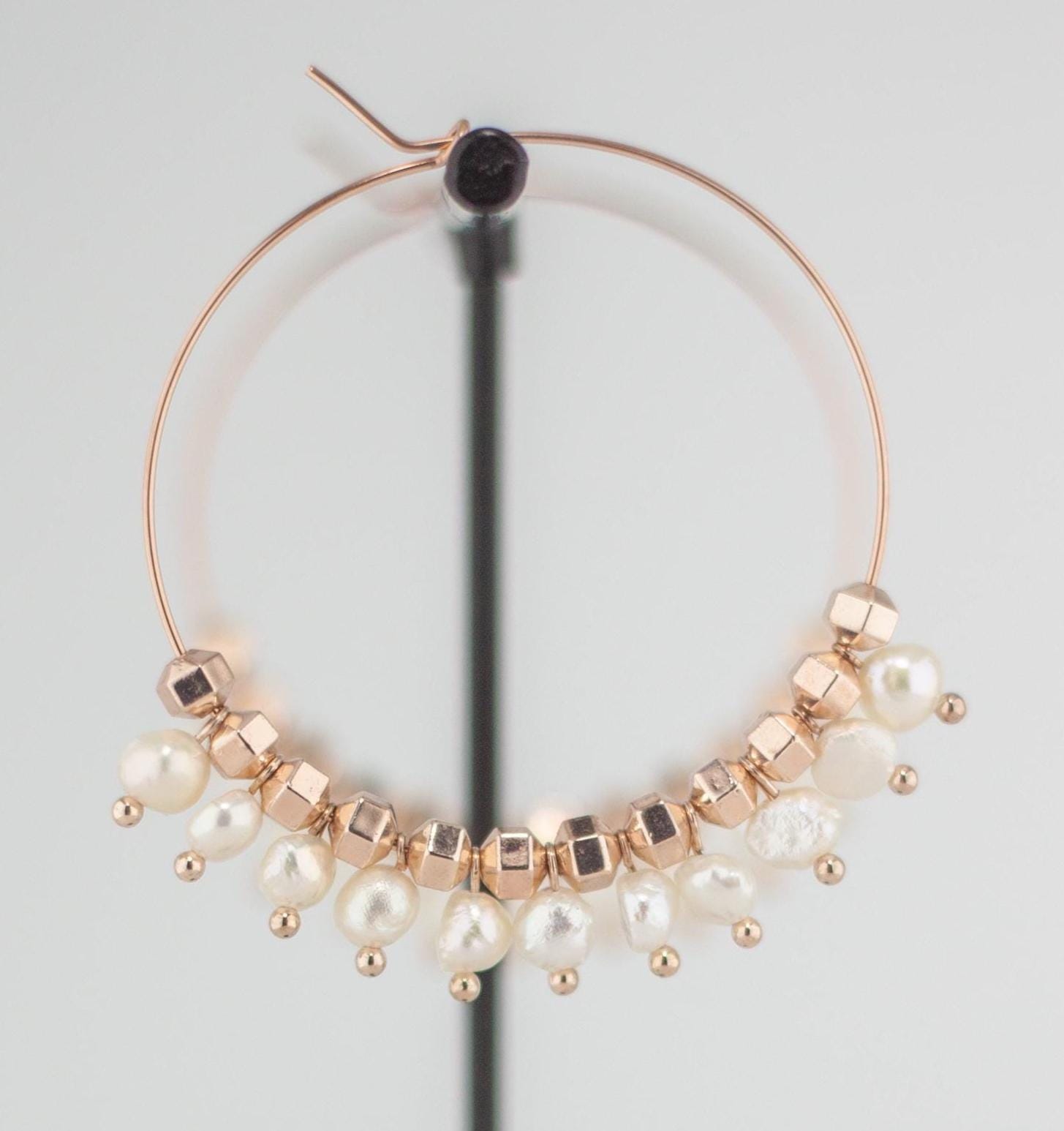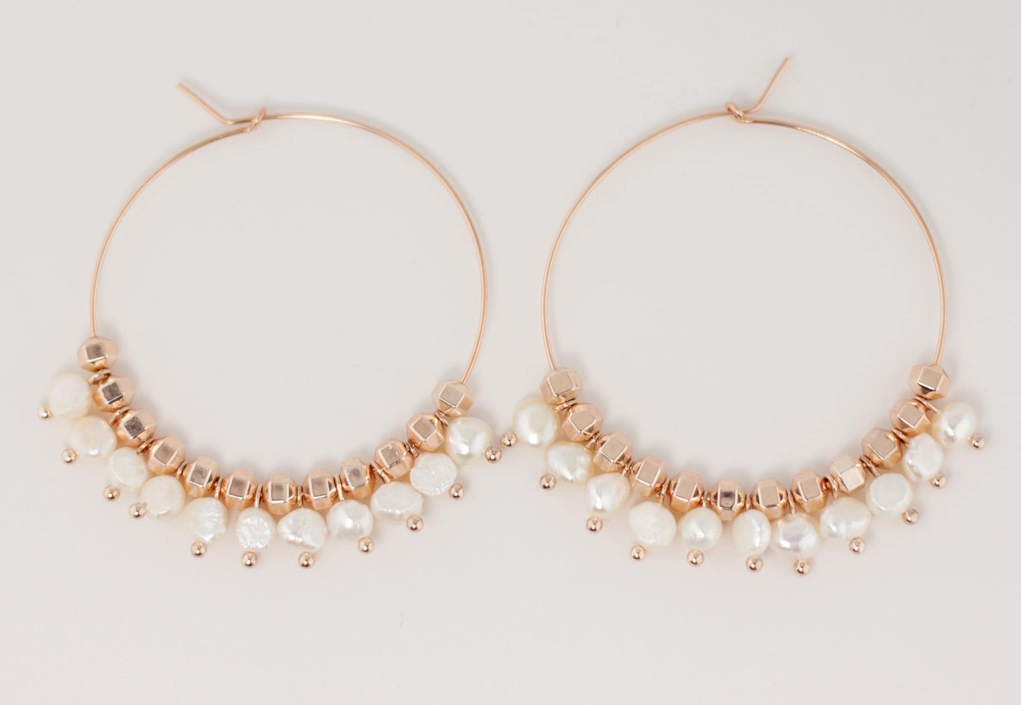 Experience the boho chic beauty, elegance, and understated glamour of our Petit-pearls and rose gold hoop earrings. These stunning pearl hoop earrings showcase iridescent petit pearls in shimmering shades of white, cream, pink, green, and lavender. The pretty white pearls pair perfectly with rose gold hematite beads and delicate blush pink tones.