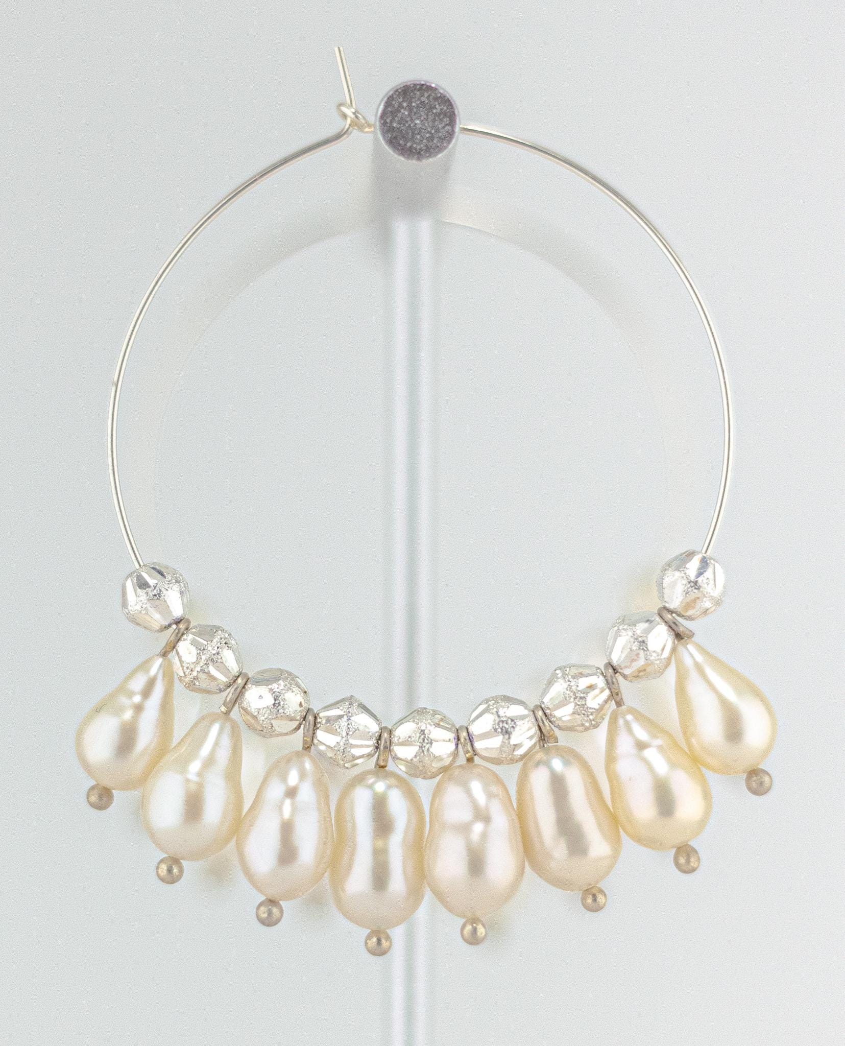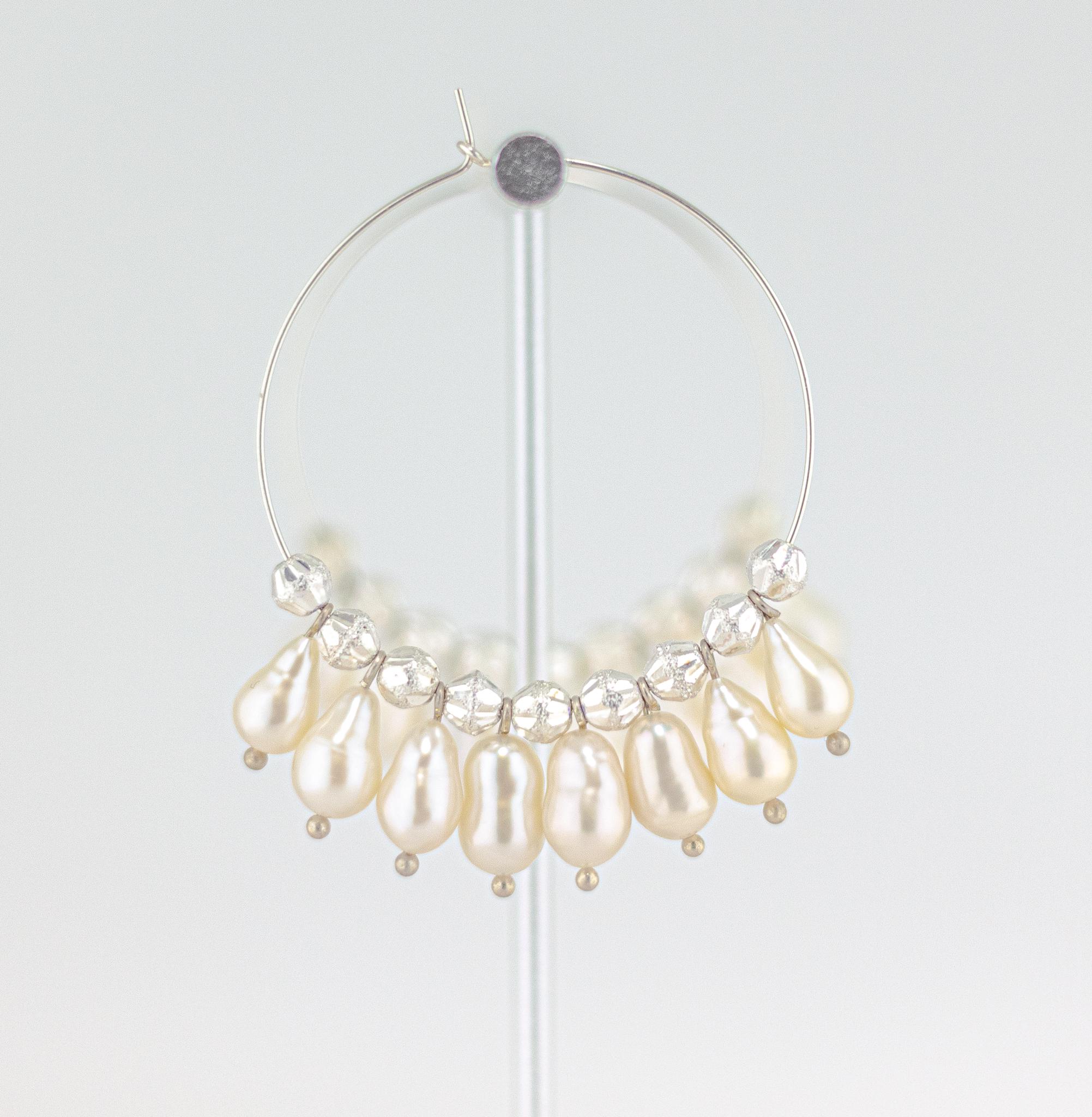 Experience elegance and glamour with these stunning baroque pearl hoop earrings! These beautiful sterling silver statement earrings feature bright and shimmering ultra baroque pearls in shades of white, cream, pink, green, and lavender, perfectly complemented by textured silver beads with both matte and shiny accents.