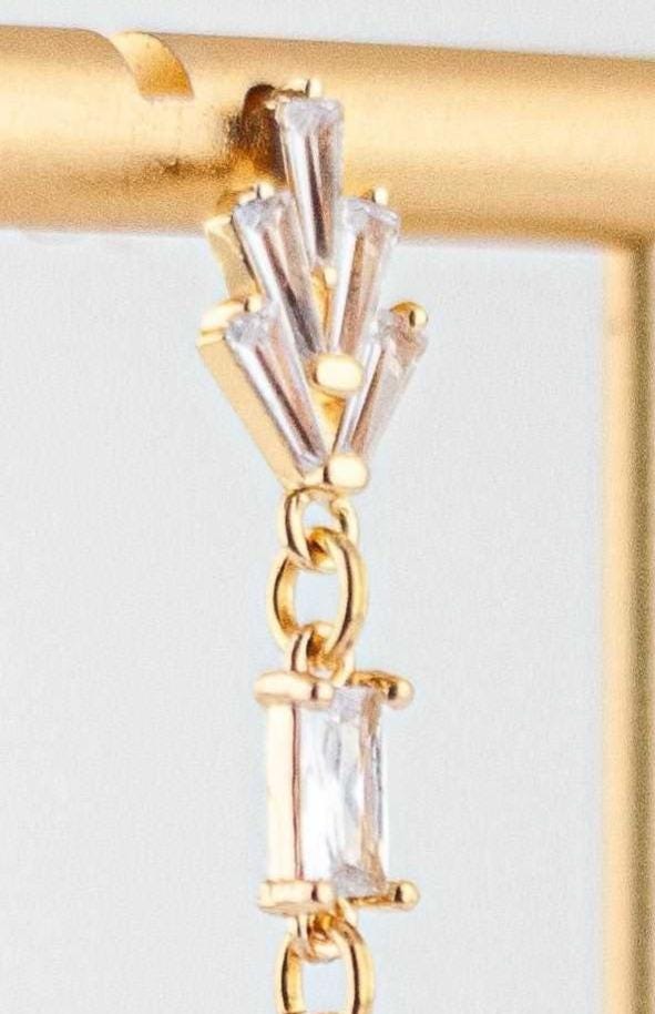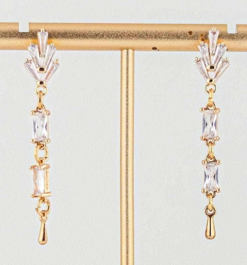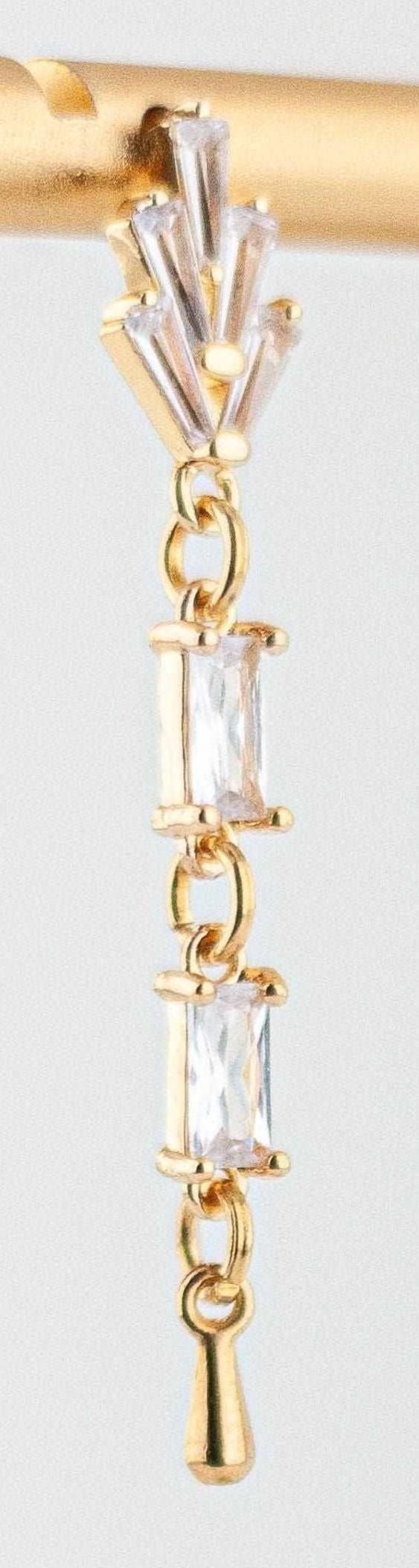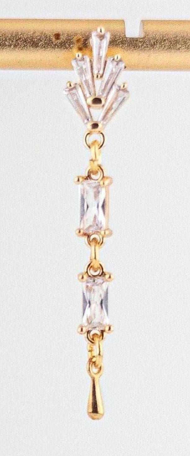 These Incredibly pretty gold drop earrings feature the sparkling combination of clear Cubic Zirconia stones and radiant clear glass links. The art deco inspired vintage style crystal earrings exude timeless feminine romance and chic retro beauty with their dazzling light play and warm gold accents. The geometric gold drop design lends a sleek modern flair to these simple yet striking gold dangle. Delicate and lightweight with classic understated glamour, these are an ideal choice for everyday wear, evening dresses, wedding guests, vintage style bridal accessories, holiday party or special occasion.