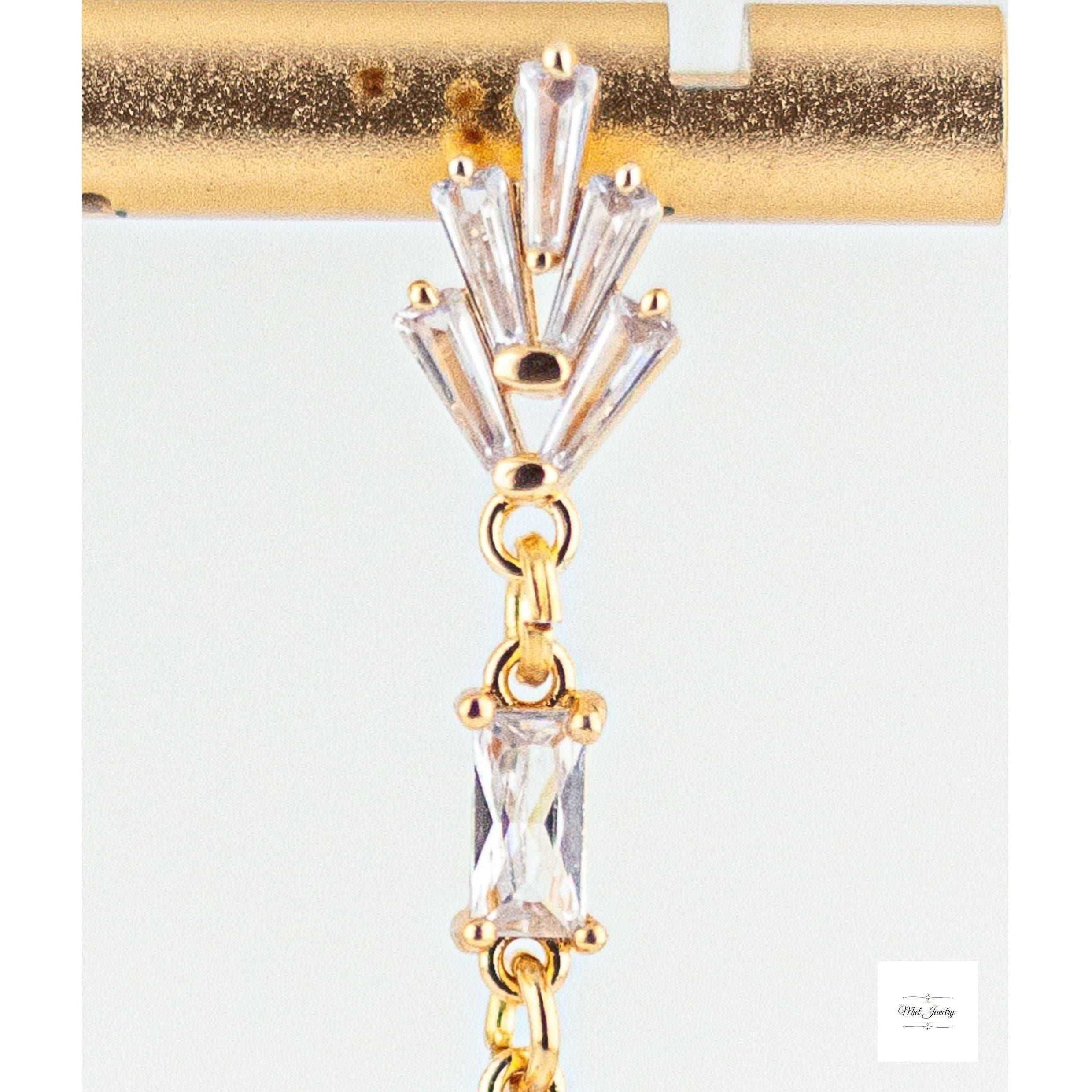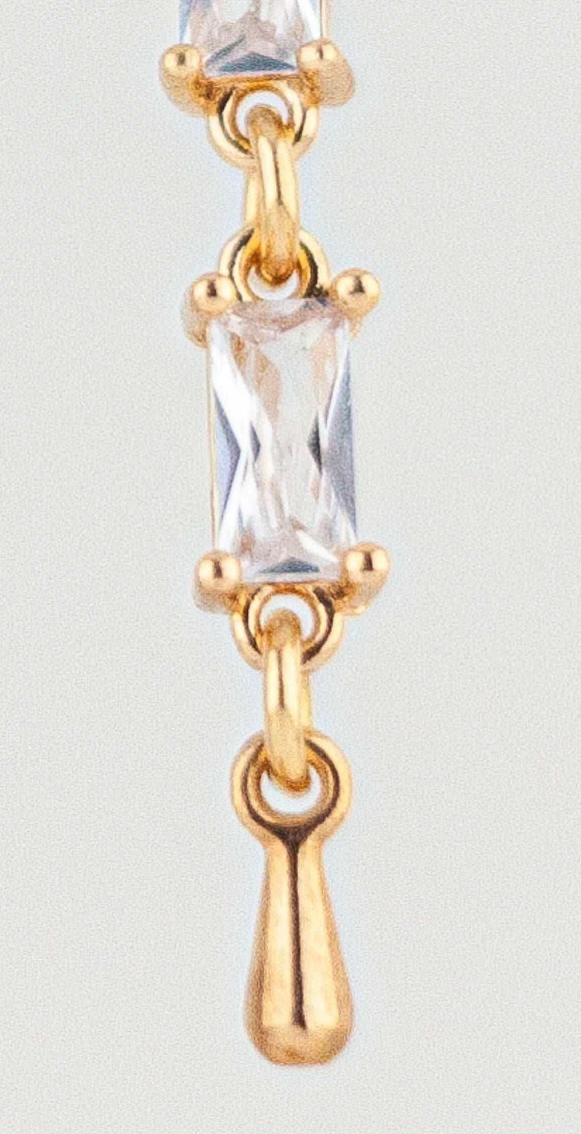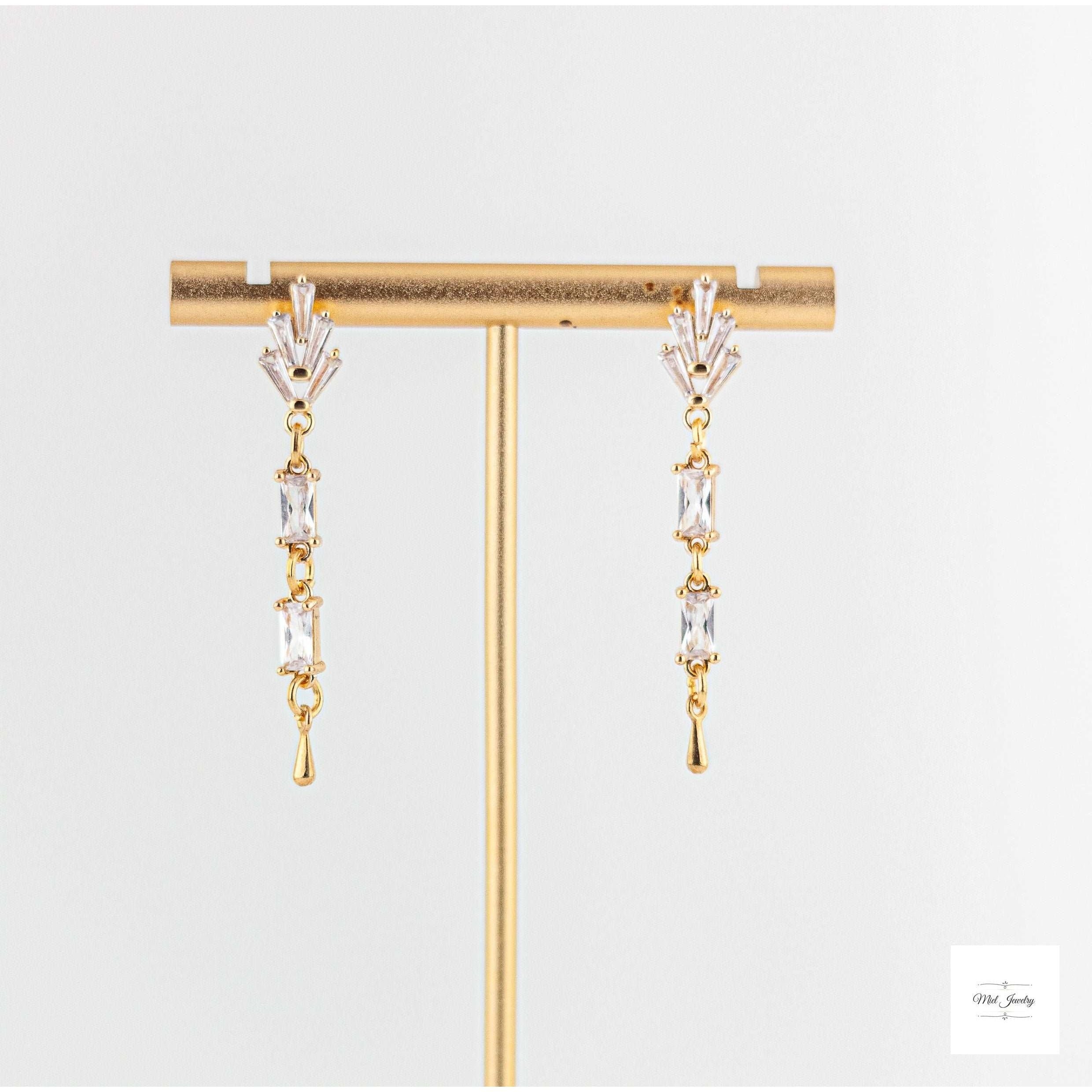 These Incredibly pretty gold drop earrings feature the sparkling combination of clear Cubic Zirconia stones and radiant clear glass links. The art deco inspired vintage style crystal earrings exude timeless feminine romance and chic retro beauty with their dazzling light play and warm gold accents. The geometric gold drop design lends a sleek modern flair to these simple yet striking gold dangle. Delicate and lightweight with classic understated glamour, these are an ideal choice for everyday wear, evening dresses, wedding guests, vintage style bridal accessories, holiday party or special occasion.