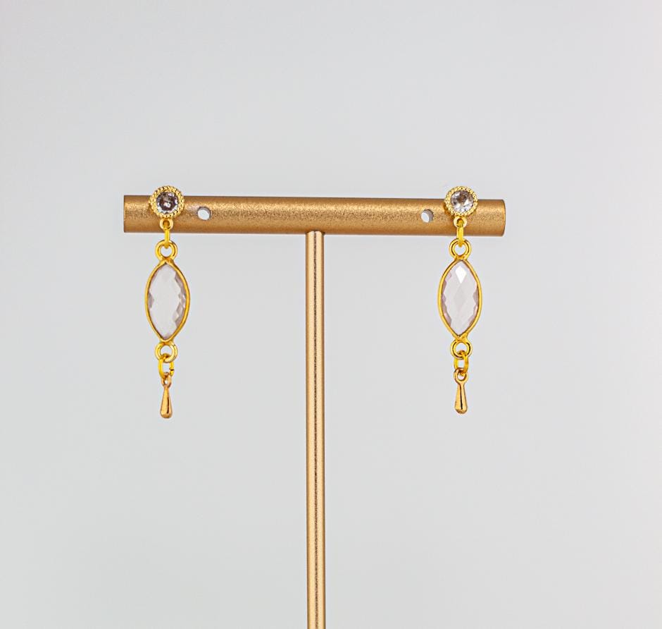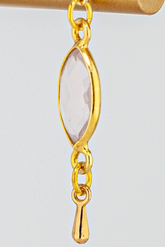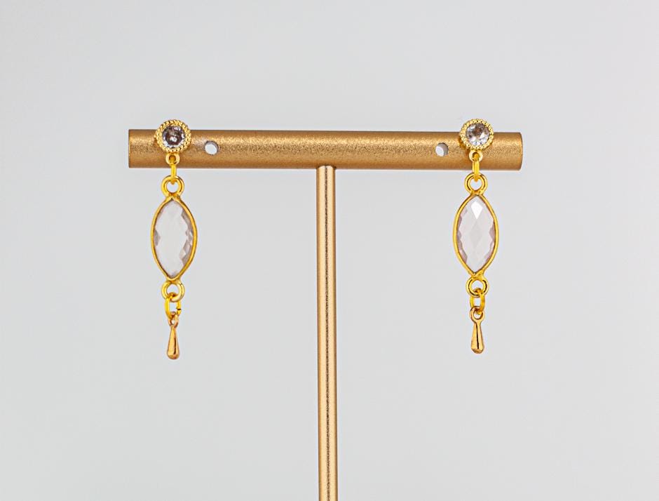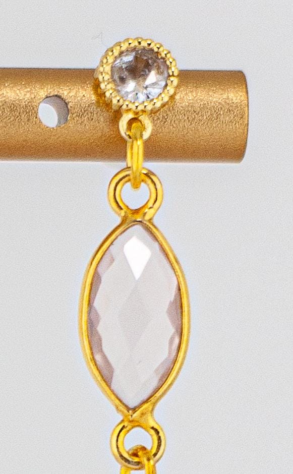 Embrace timeless elegance with these pretty Rose Quartz Earrings, featuring delicate pale pink gemstones that exude vintage style femininity and grace. Designed with a retro aesthetic that somehow feels stylish and modern these dainty gold drop earrings showcase soft, shimmering rose quartz crystals, elegantly dangling from sparkling cubic zirconia studded gold posts. The result is a understated, refined, sophisticated look that effortlessly complements both modern and classic styles.