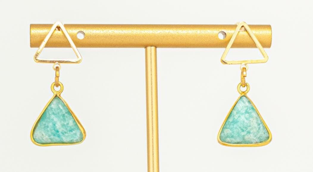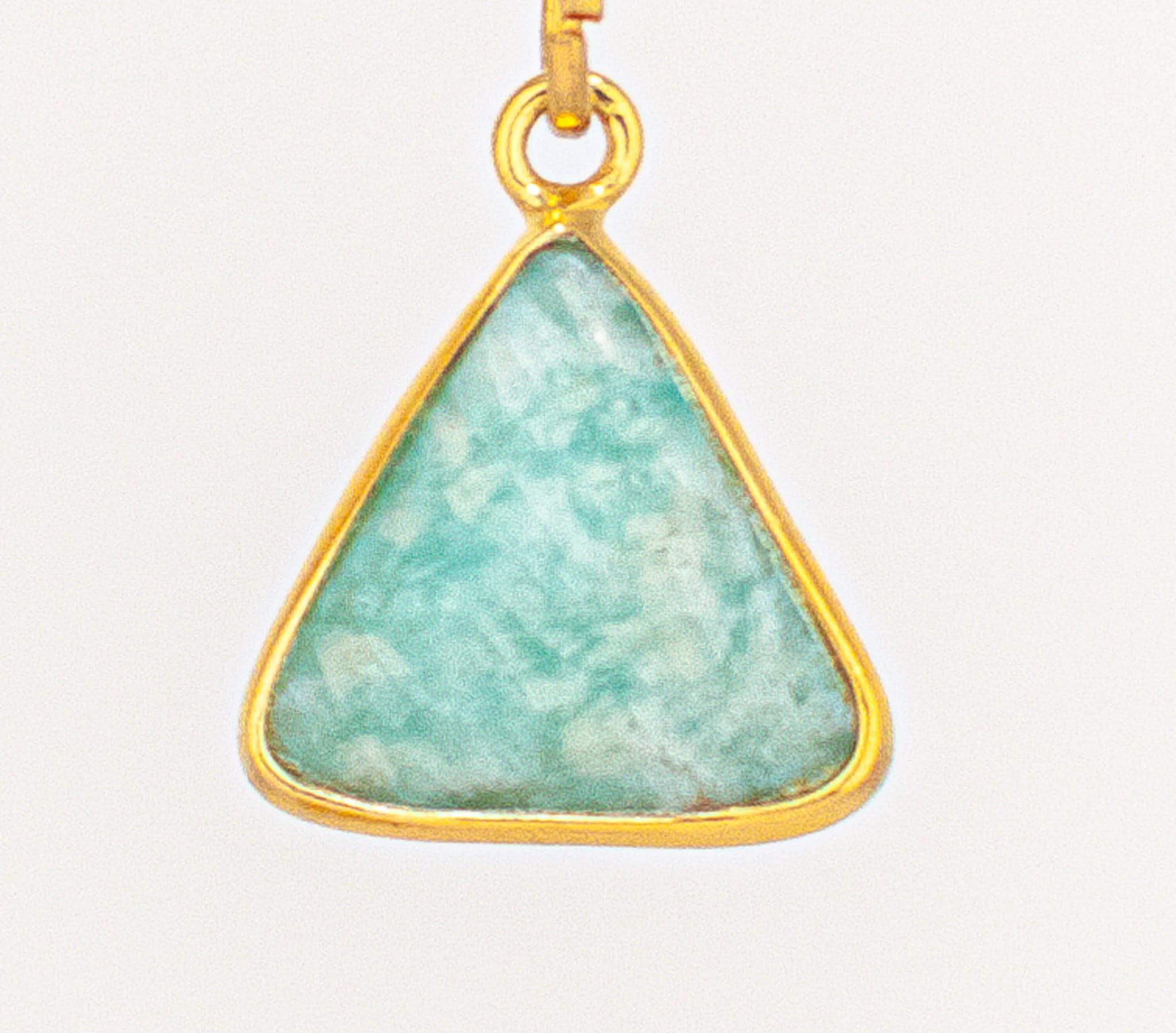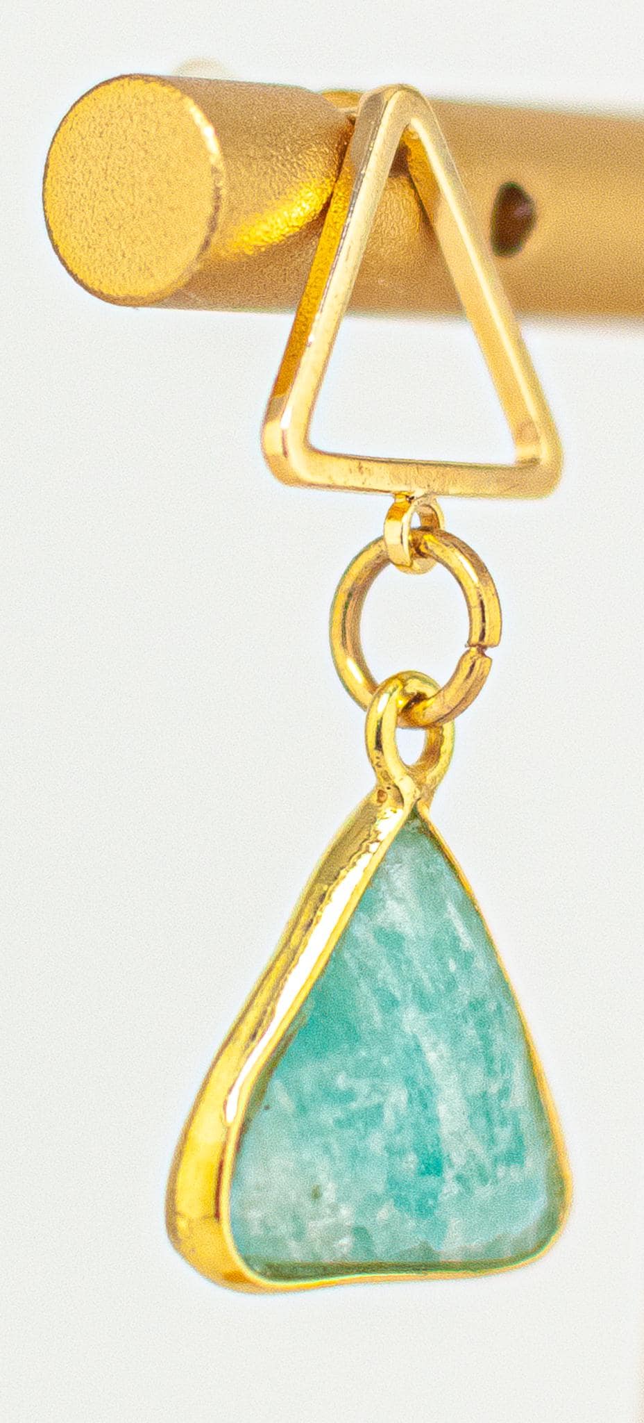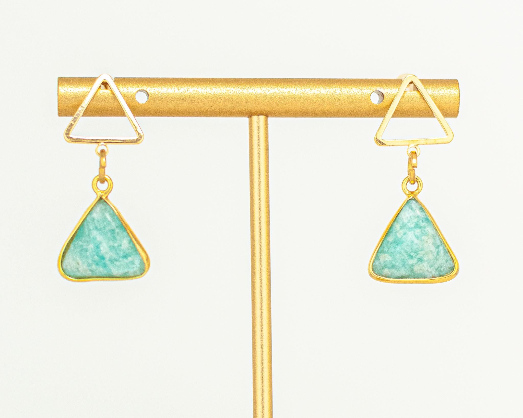 Elevate your modern boho chic style with these stunning Amazonite Earrings. Featuring natural seafoam green gemstones that shimmer in aqua, turquoise, and soft aquamarine tones, these triangle shaped gold drop earrings exude sleek elegance and artistic flair. Each gemstone is beautifully faceted to reflect light and enhance its organic oceanic hue, creating a captivating statement piece that’s both contemporary and timeless.