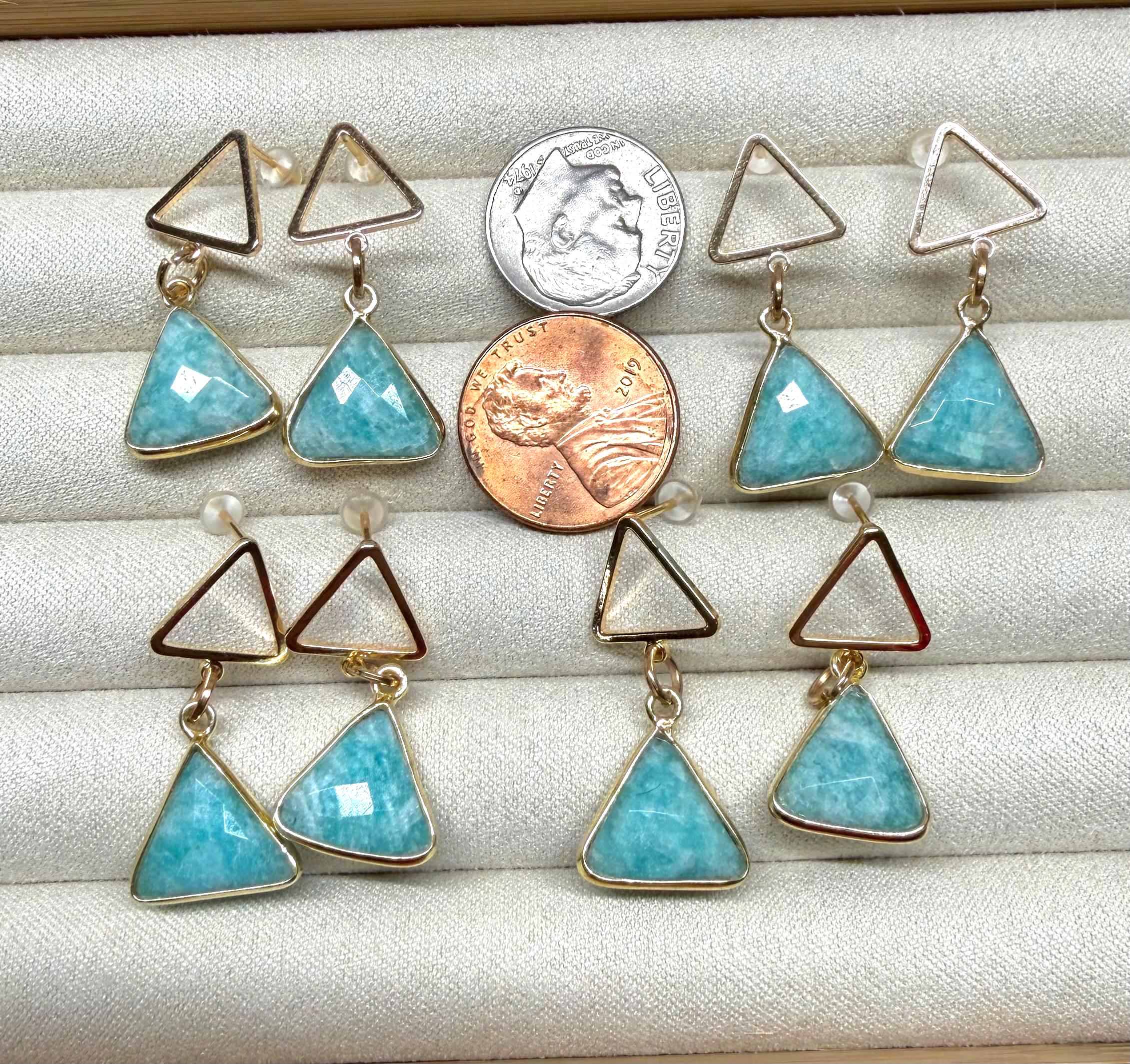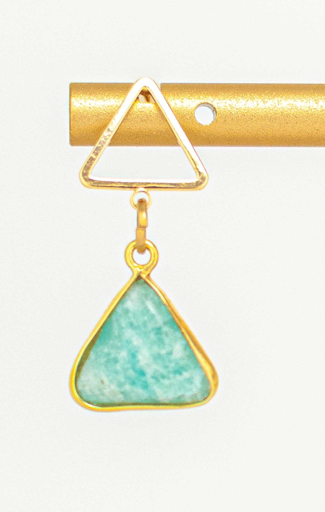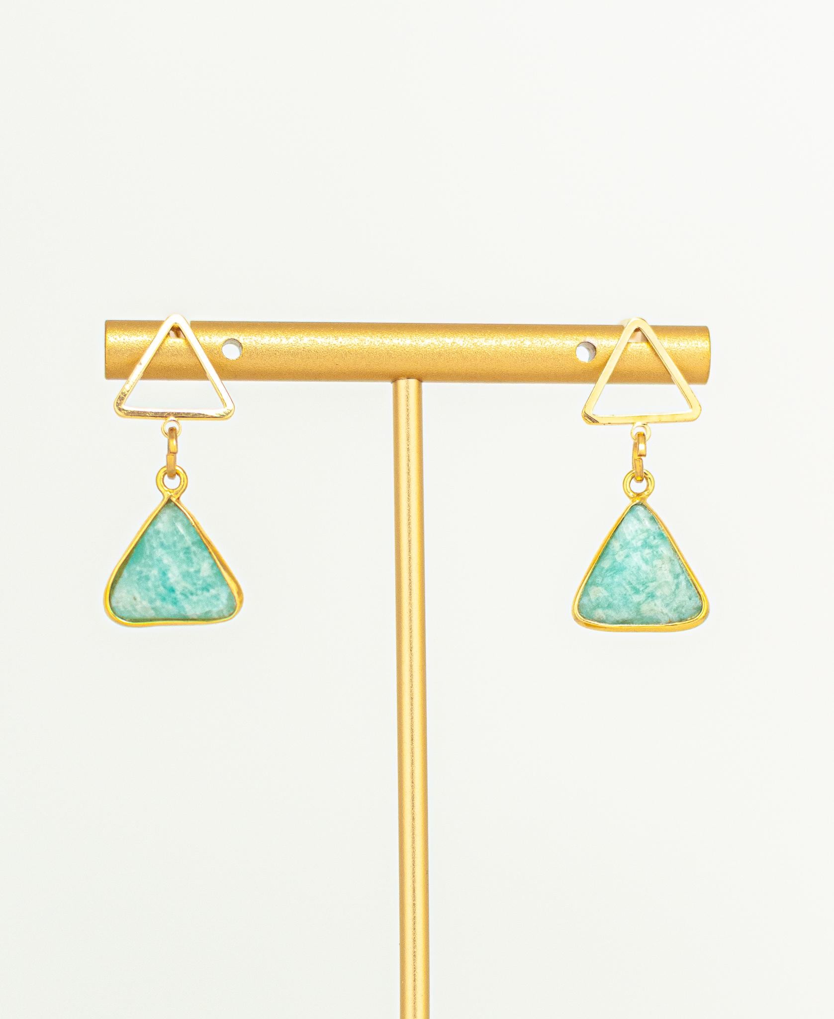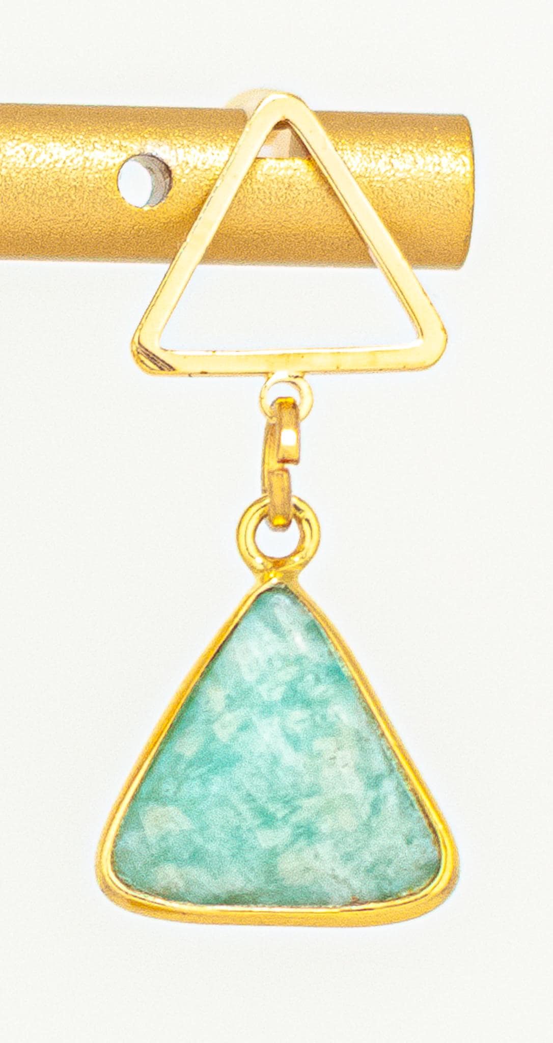 Elevate your modern boho chic style with these stunning Amazonite Earrings. Featuring natural seafoam green gemstones that shimmer in aqua, turquoise, and soft aquamarine tones, these triangle shaped gold drop earrings exude sleek elegance and artistic flair. Each gemstone is beautifully faceted to reflect light and enhance its organic oceanic hue, creating a captivating statement piece that’s both contemporary and timeless.