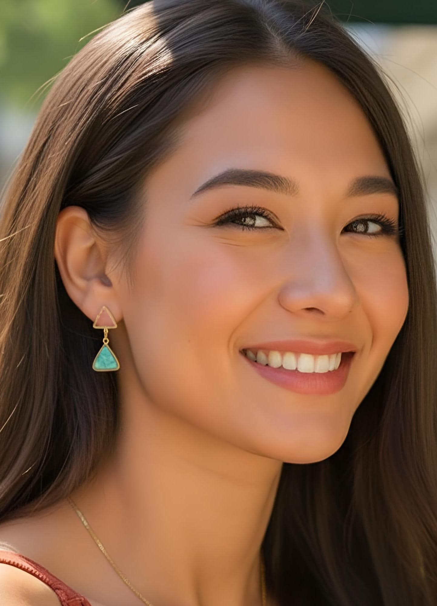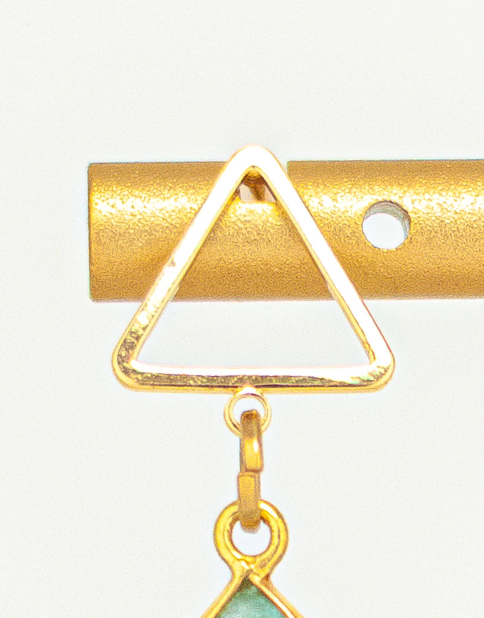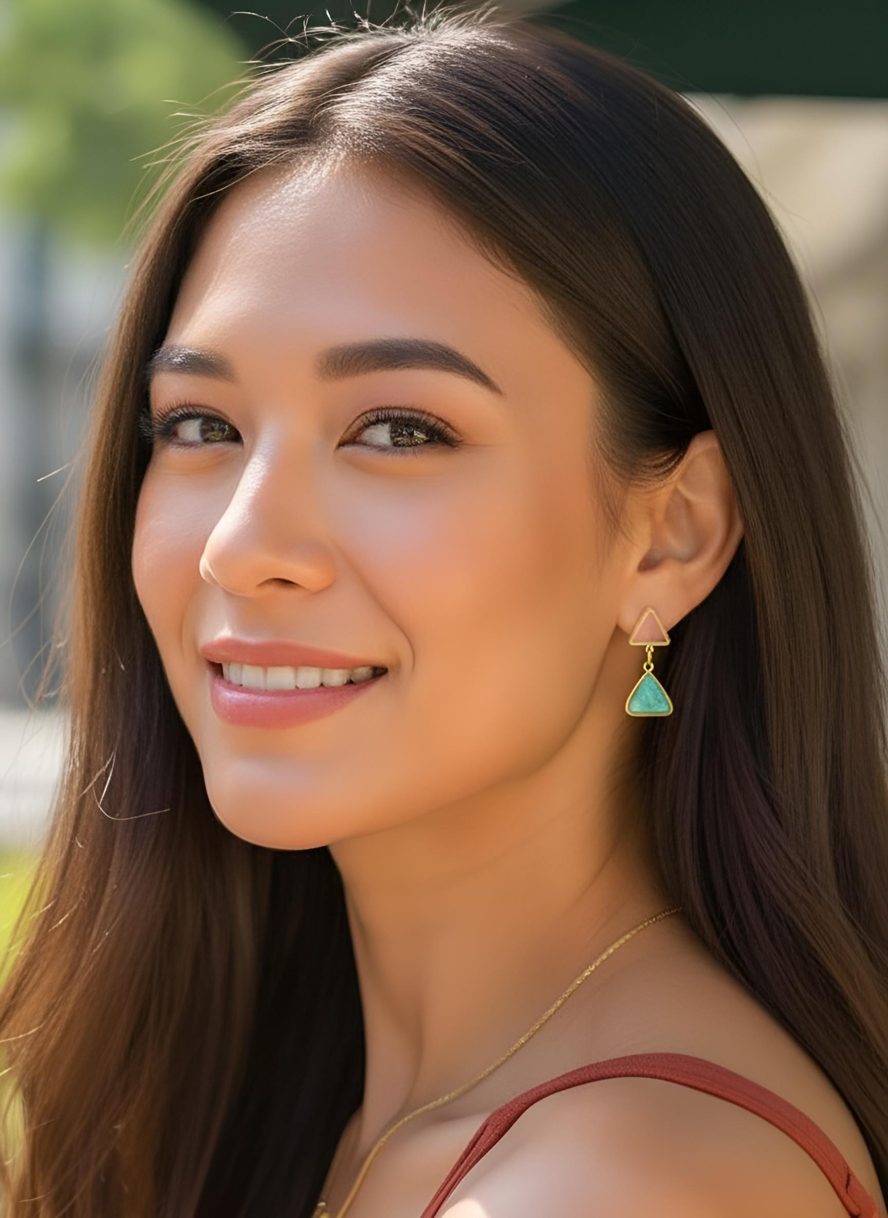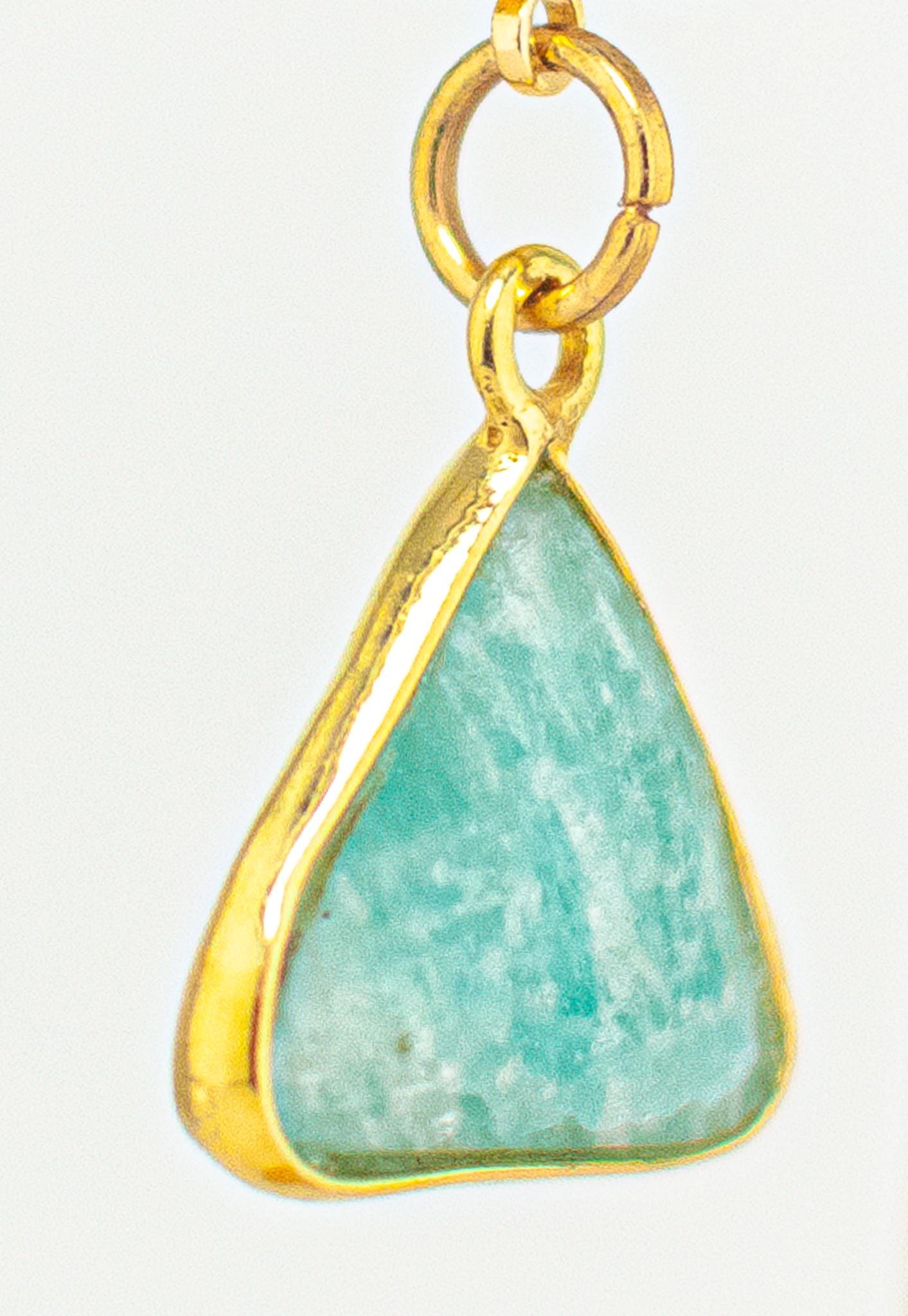 Elevate your modern boho chic style with these stunning Amazonite Earrings. Featuring natural seafoam green gemstones that shimmer in aqua, turquoise, and soft aquamarine tones, these triangle shaped gold drop earrings exude sleek elegance and artistic flair. Each gemstone is beautifully faceted to reflect light and enhance its organic oceanic hue, creating a captivating statement piece that’s both contemporary and timeless.