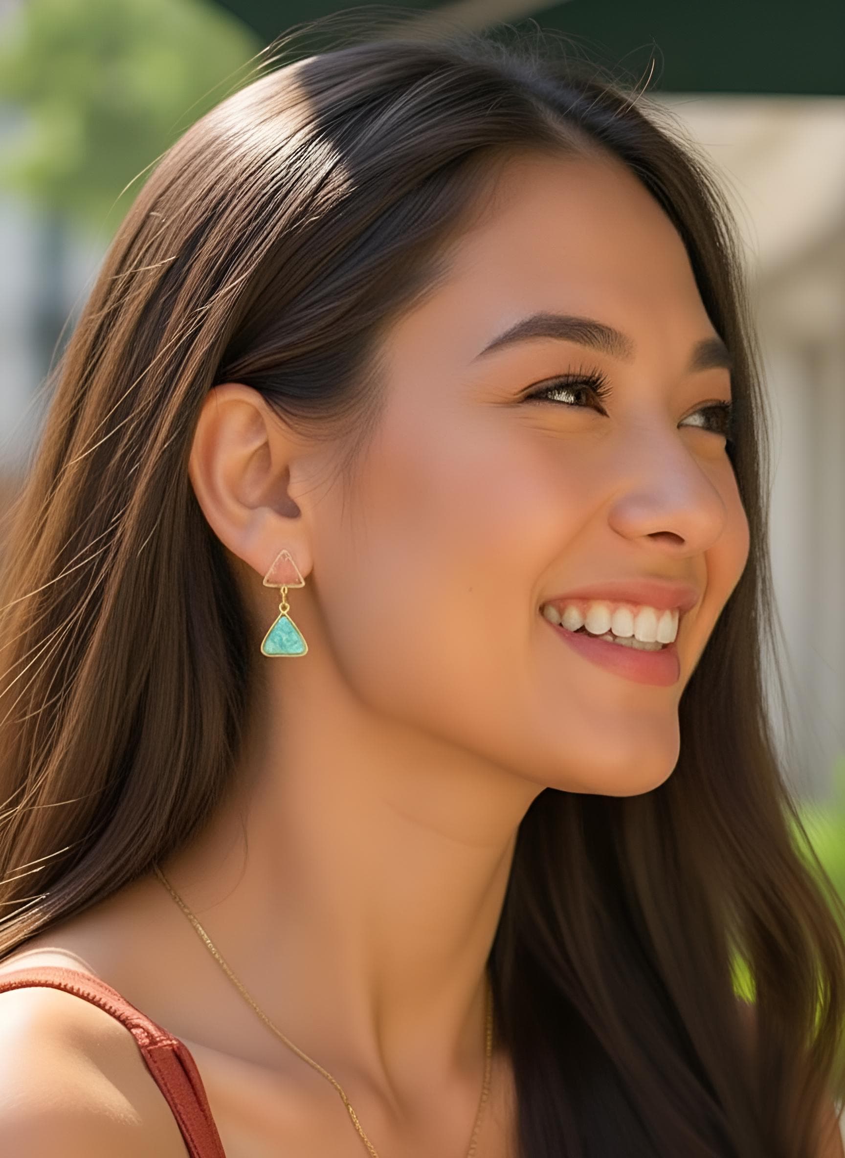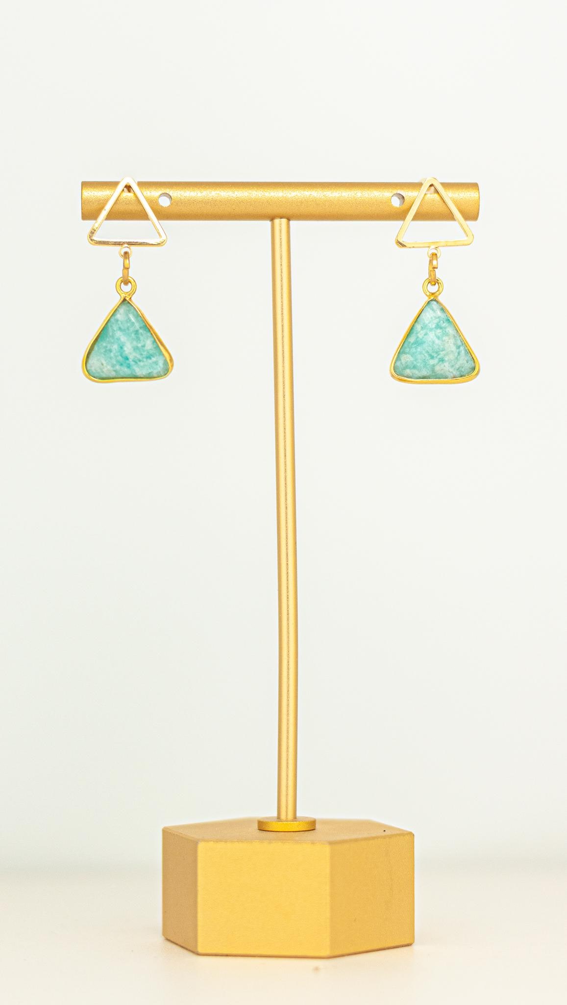 The geometric design and short drop silhouette offer a refined yet bold aesthetic, perfect for those who love modern, artsy, and bohemian jewelry. Lightweight and versatile, they complement both casual and dressy looks—ideal for festivals, beach weddings, or everyday wear. Handcrafted with care, these Amazonite earrings celebrate the natural beauty of semi-precious stones while maintaining a sleek, minimalist form.