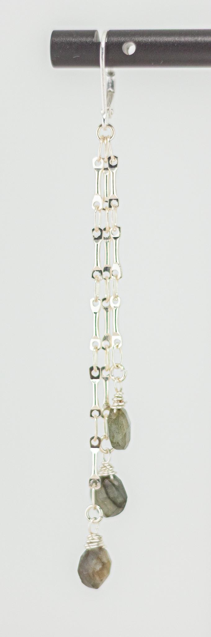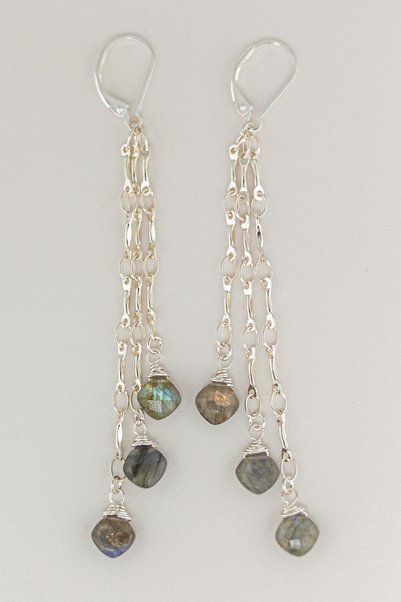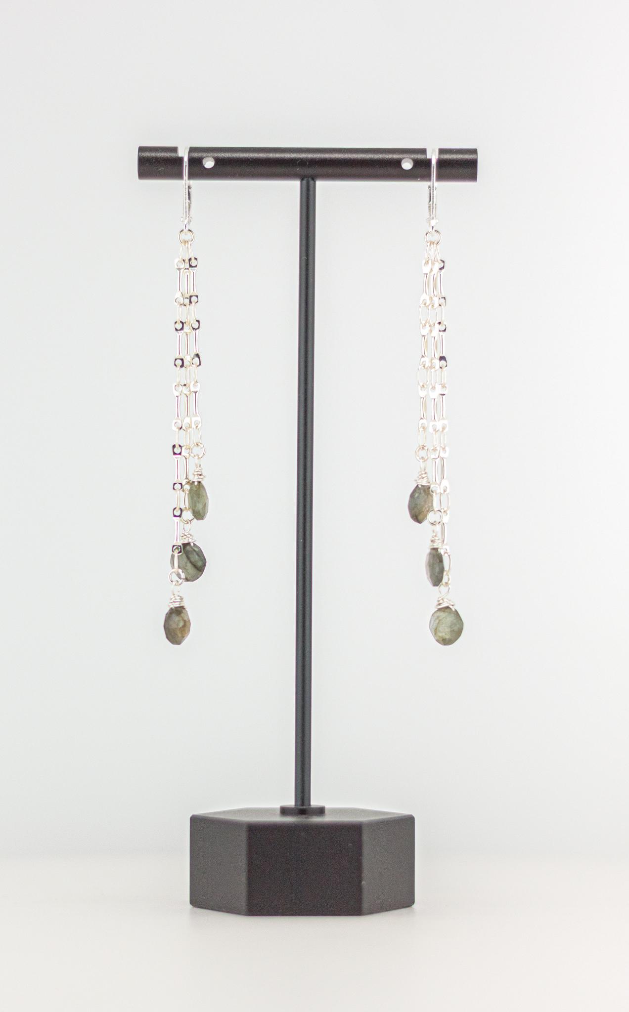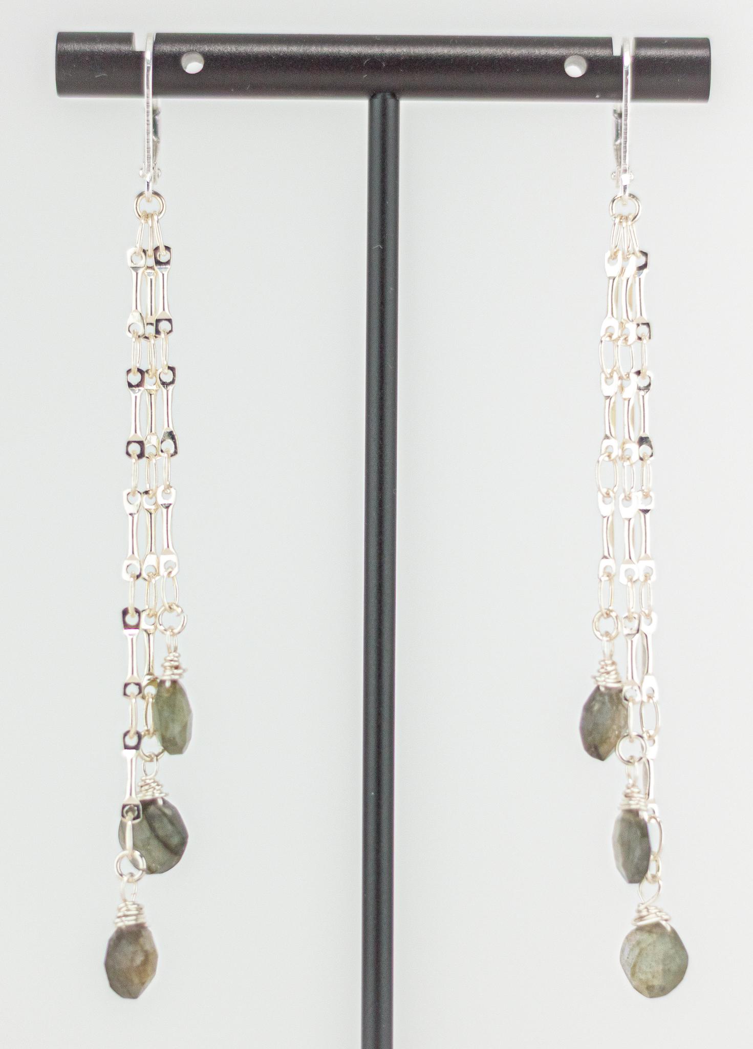 Add a touch of elegance and earthy charm to your look with these Pretty Boho Chic Silver Labradorite Earrings. Featuring natural gray and brown labradorite gemstones with subtle flashes of blue, green, and golden yellow, these long silver dangle earrings exude delicate femininity with a modern bohemian twist. The tiered chandelier design and fine silver chain detailing enhance their graceful movement, creating a lightweight, airy feel that makes them perfect for everyday wear or a special occasion.