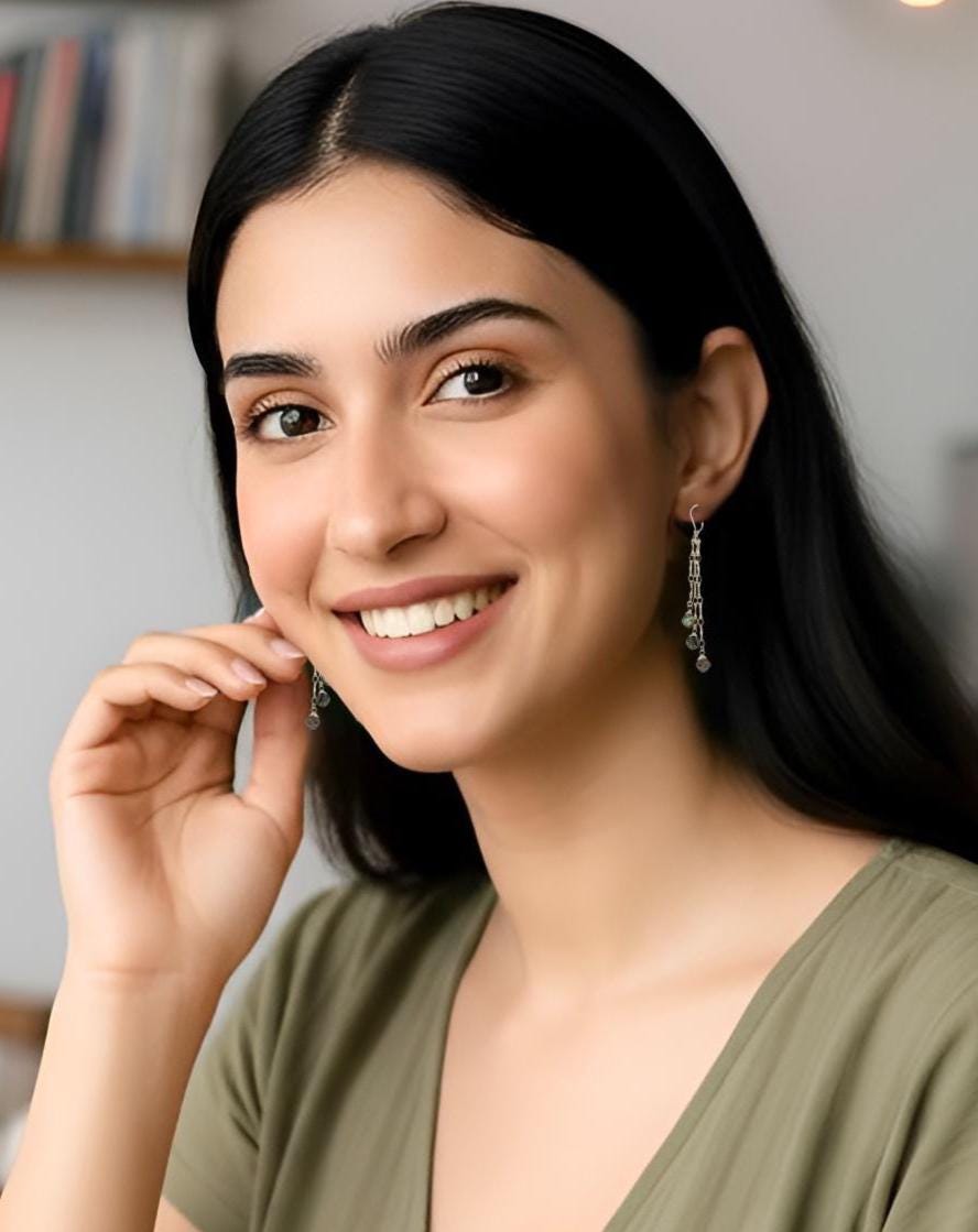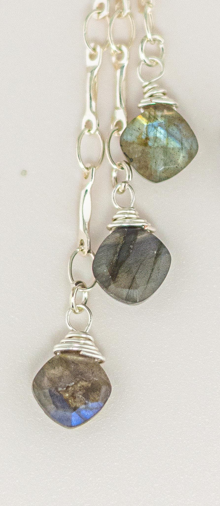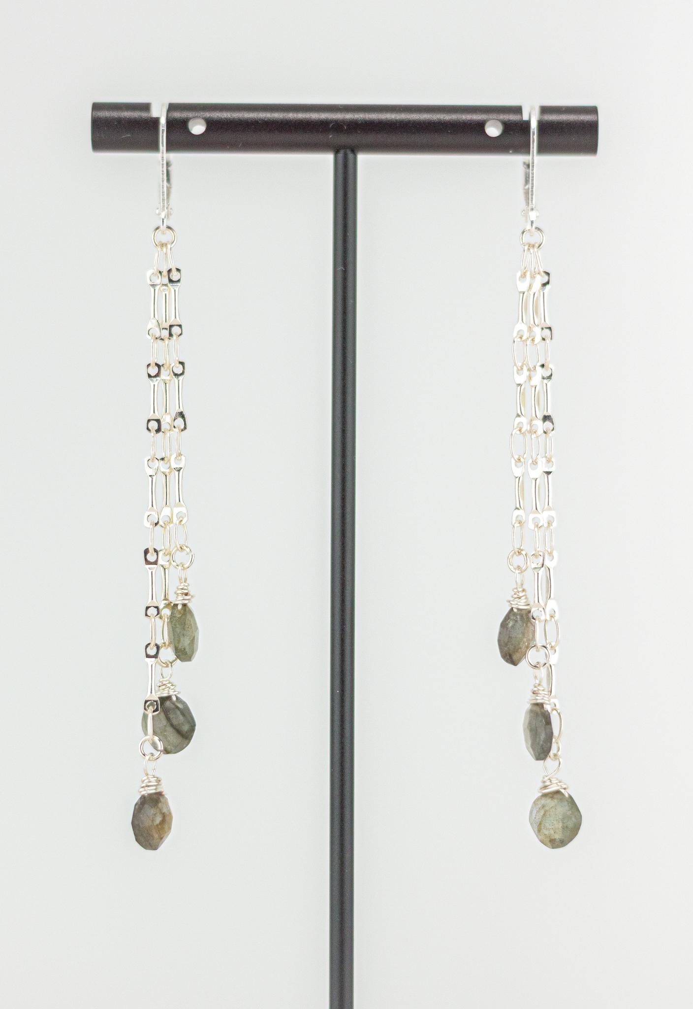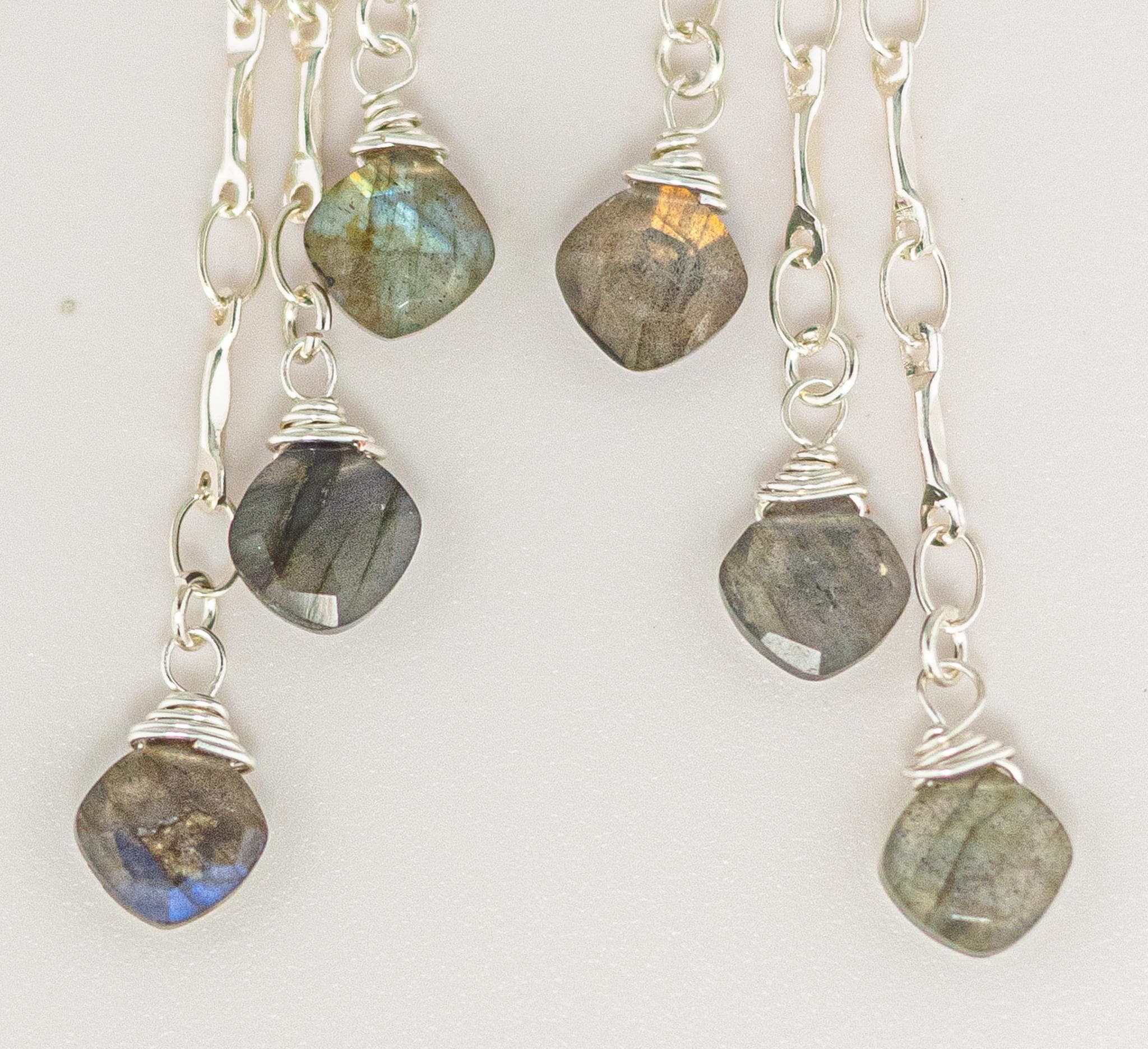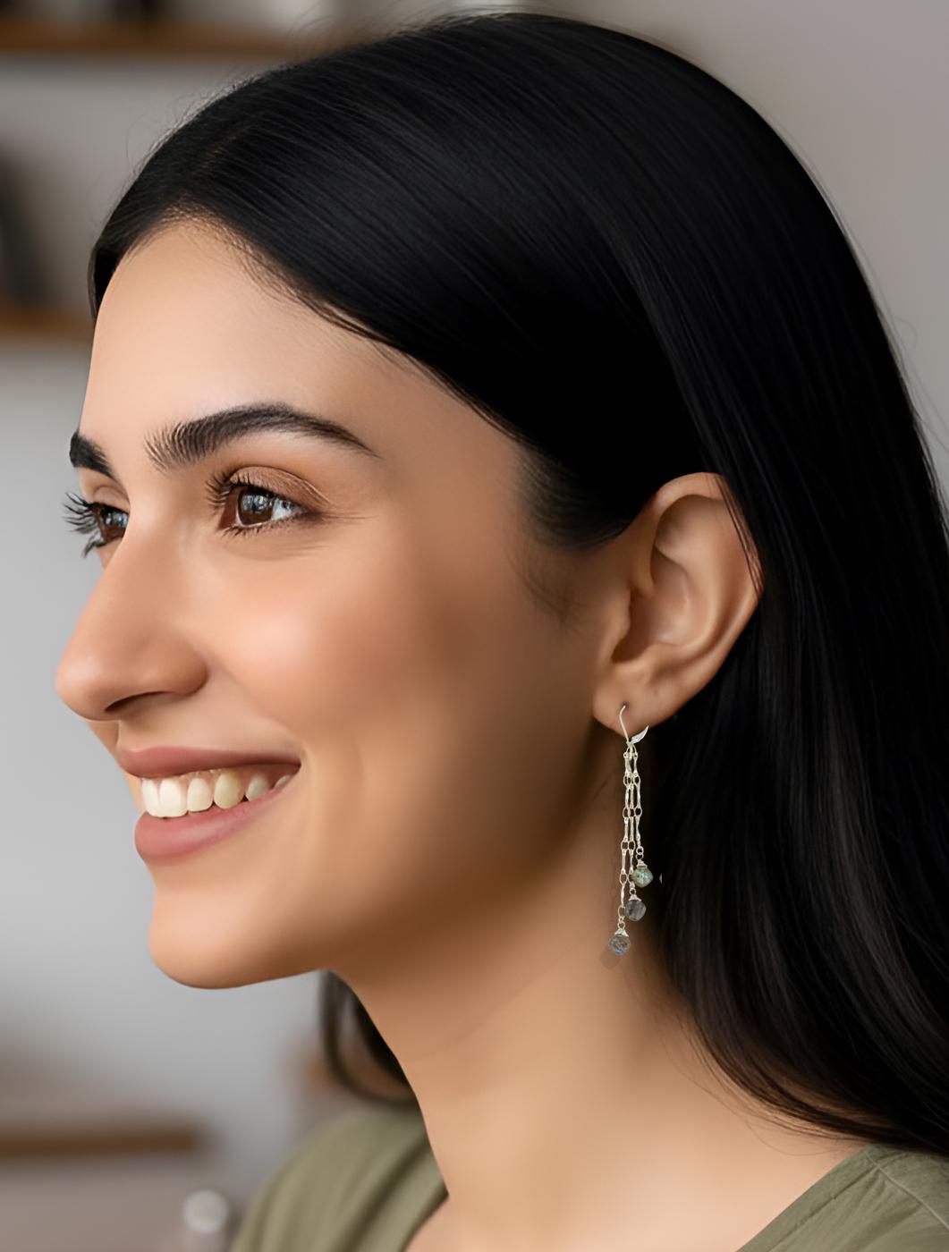 Add a touch of elegance and earthy charm to your look with these Pretty Boho Chic Silver Labradorite Earrings. Featuring natural gray and brown labradorite gemstones with subtle flashes of blue, green, and golden yellow, these long silver dangle earrings exude delicate femininity with a modern bohemian twist. The tiered chandelier design and fine silver chain detailing enhance their graceful movement, creating a lightweight, airy feel that makes them perfect for everyday wear or a special occasion.