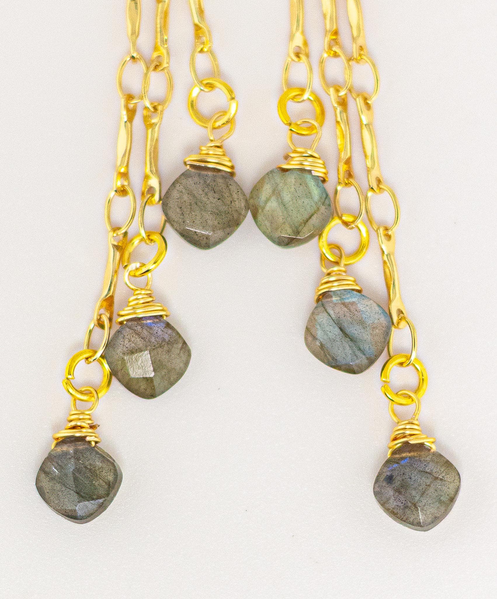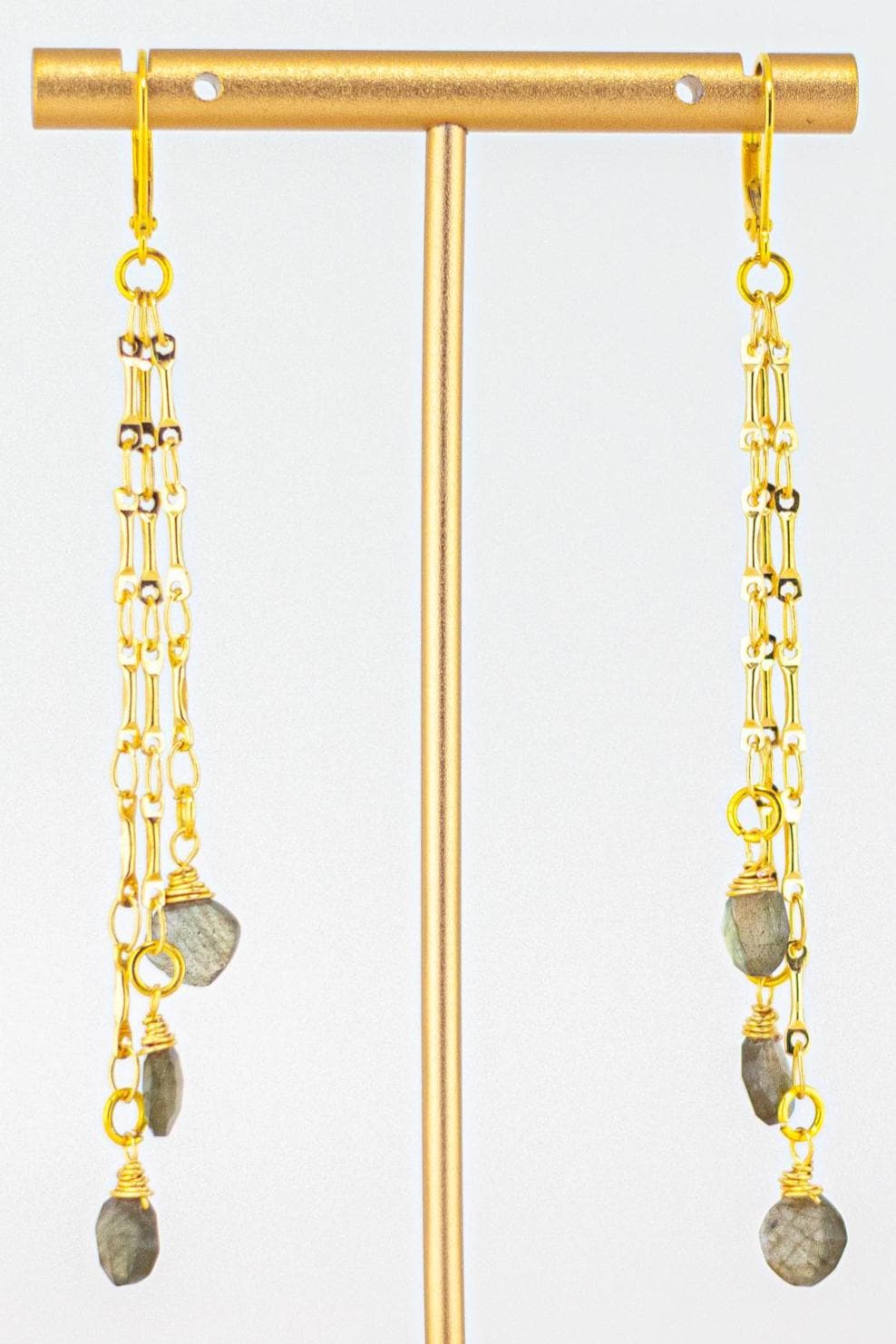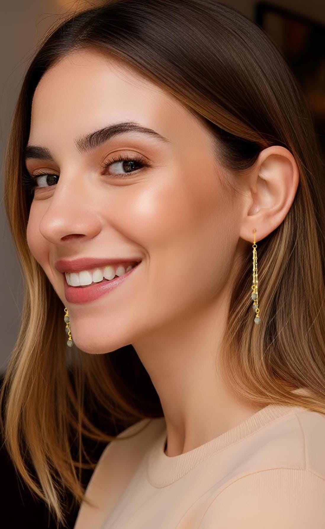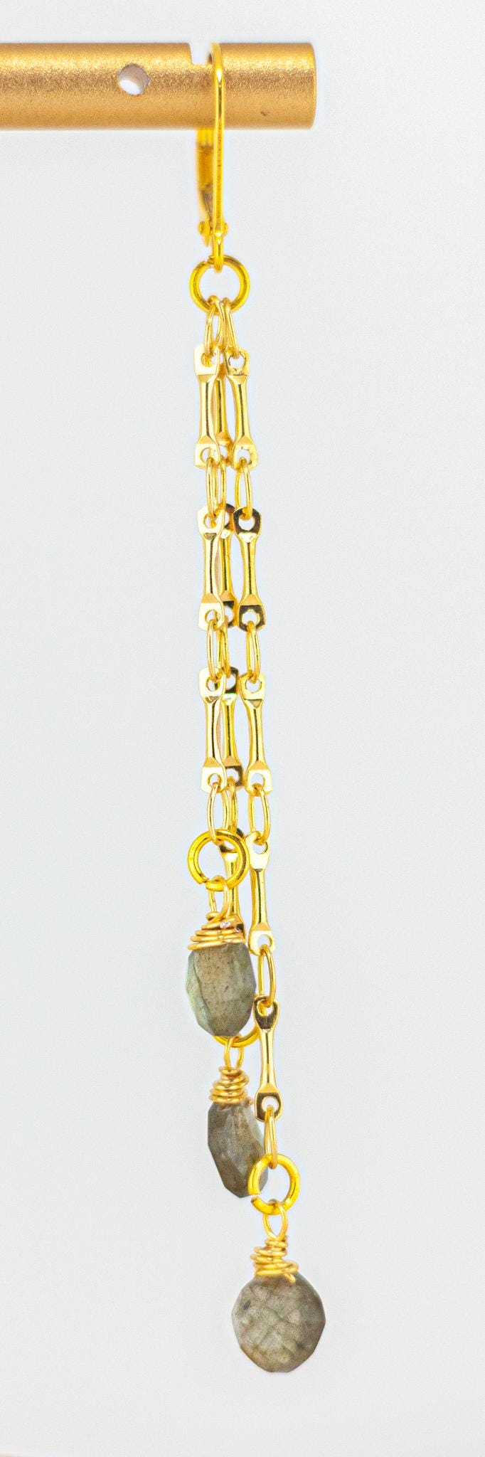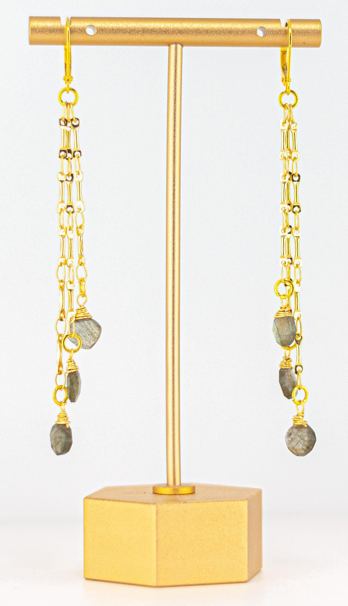Add a touch of elegance and earthy glamour to your look with these Pretty Boho Chic Gold Labradorite Earrings. Featuring natural gray and brown labradorite gemstones with subtle flashes of blue, green, and golden yellow, these long gold dangle earrings radiate a soft, bohemian elegance with a modern twist. The tiered chandelier design and delicate gold chain detailing enhance their graceful movement, creating a light, airy feel that makes them perfect for everyday wear or a special occasion.