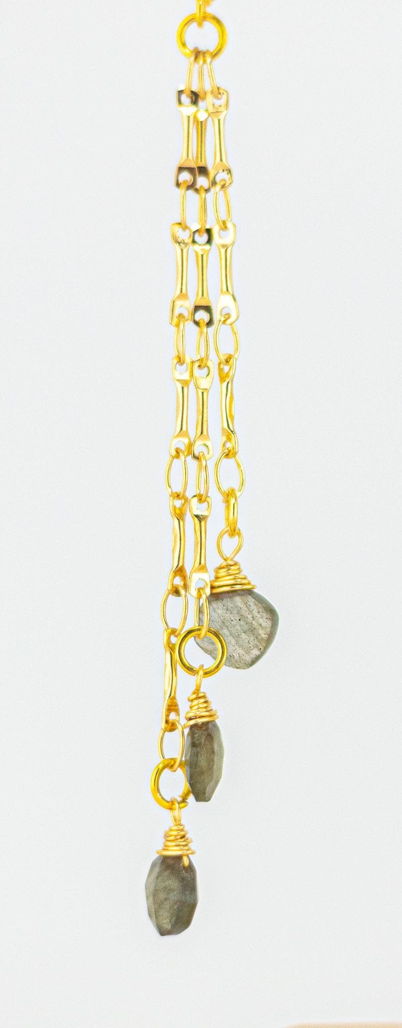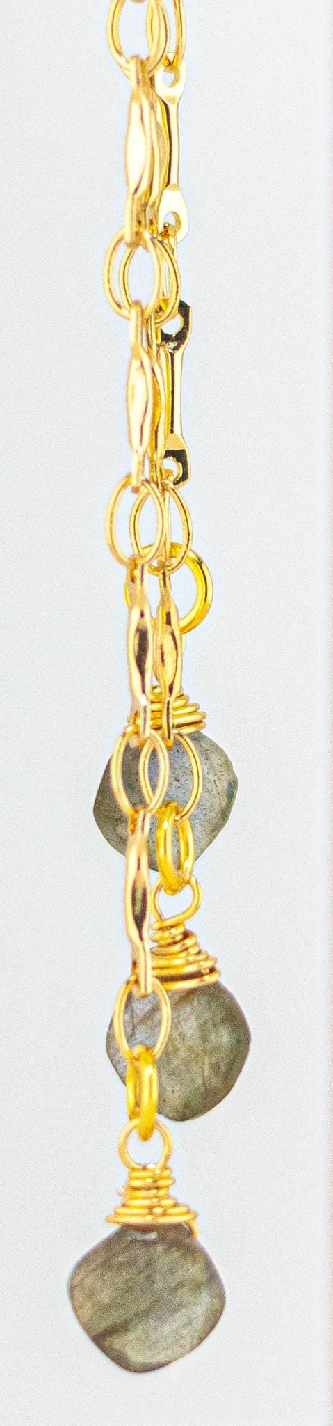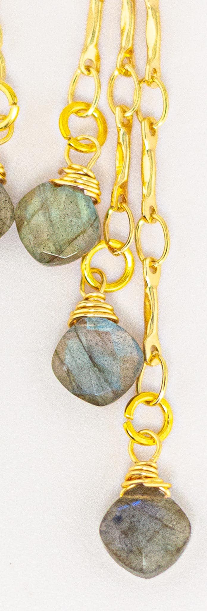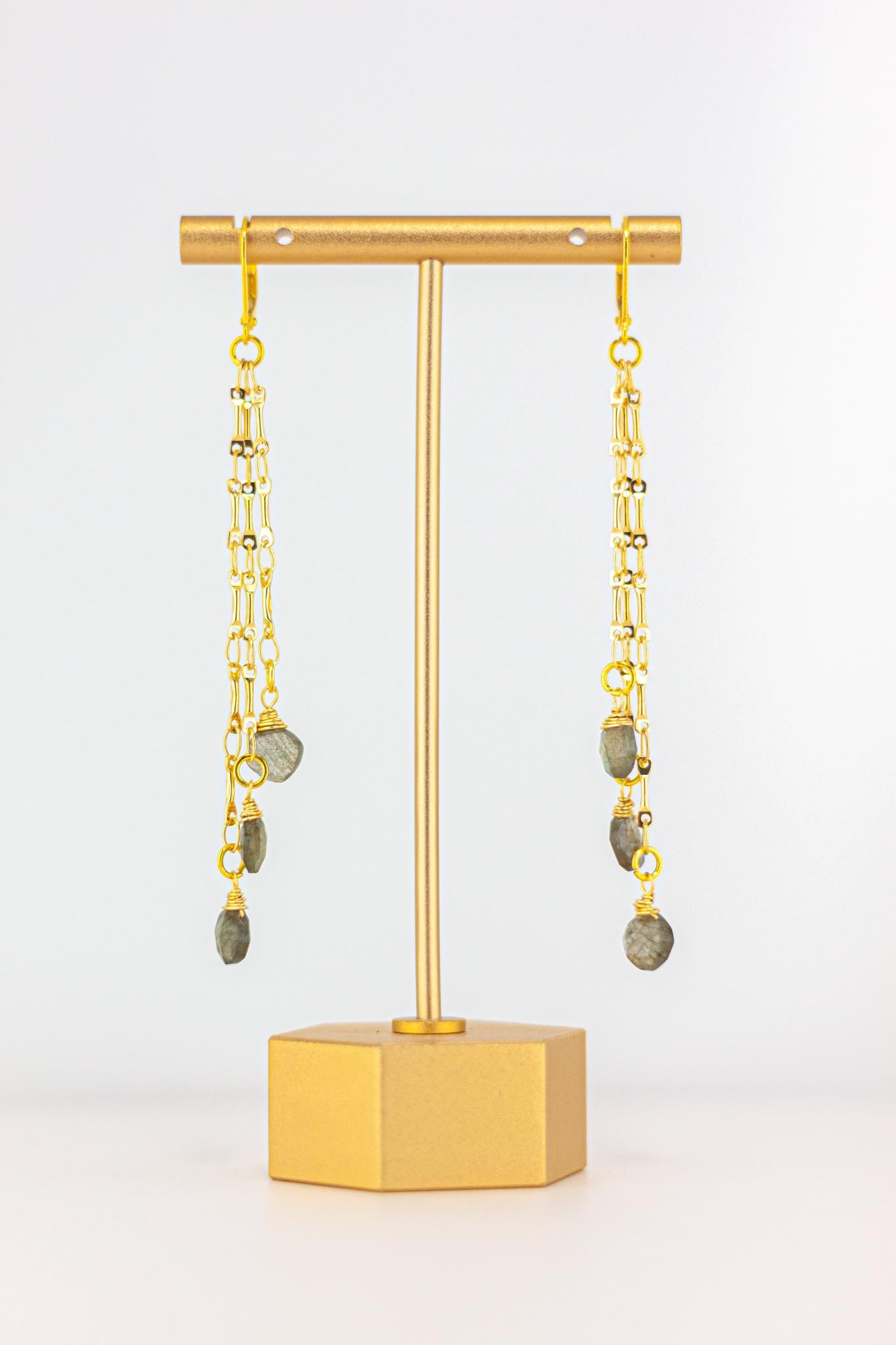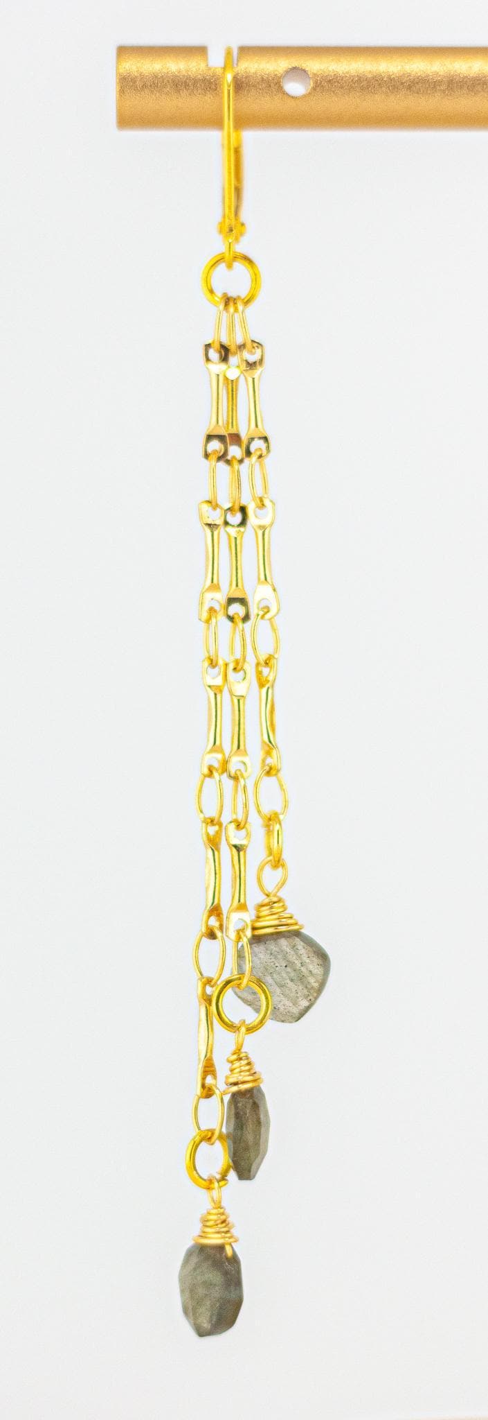 Add a touch of elegance and earthy glamour to your look with these Pretty Boho Chic Gold Labradorite Earrings. Featuring natural gray and brown labradorite gemstones with subtle flashes of blue, green, and golden yellow, these long gold dangle earrings radiate a soft, bohemian elegance with a modern twist. The tiered chandelier design and delicate gold chain detailing enhance their graceful movement, creating a light, airy feel that makes them perfect for everyday wear or a special occasion.