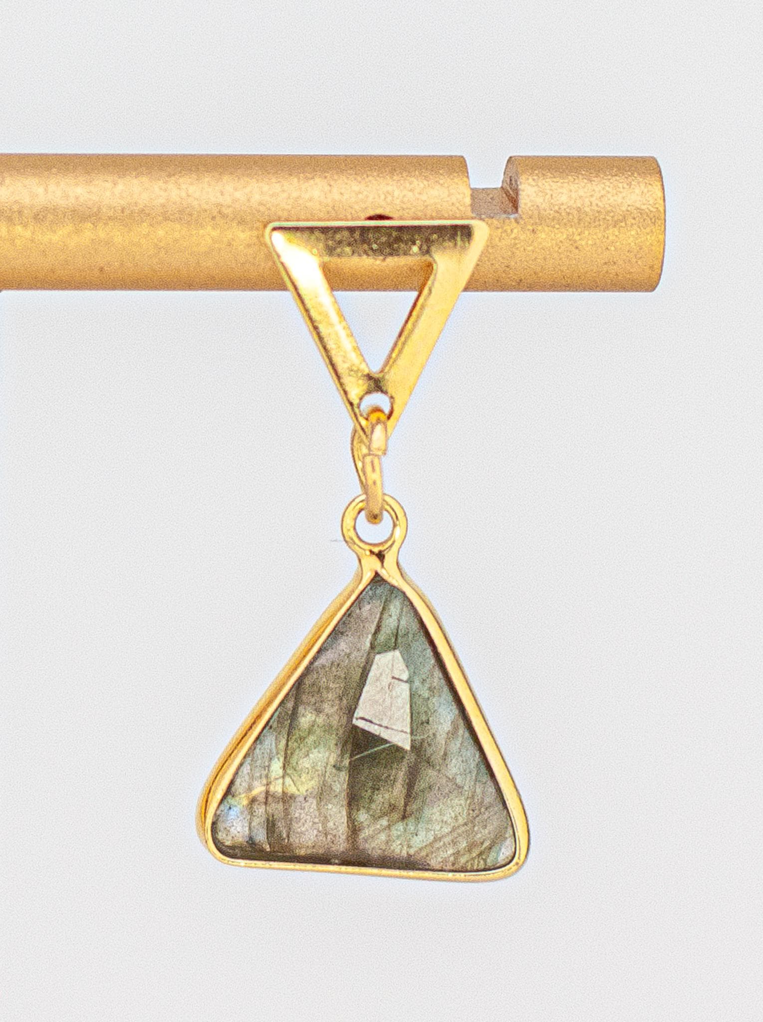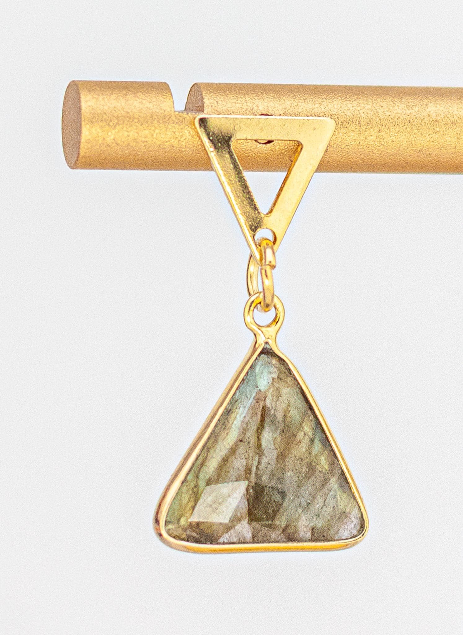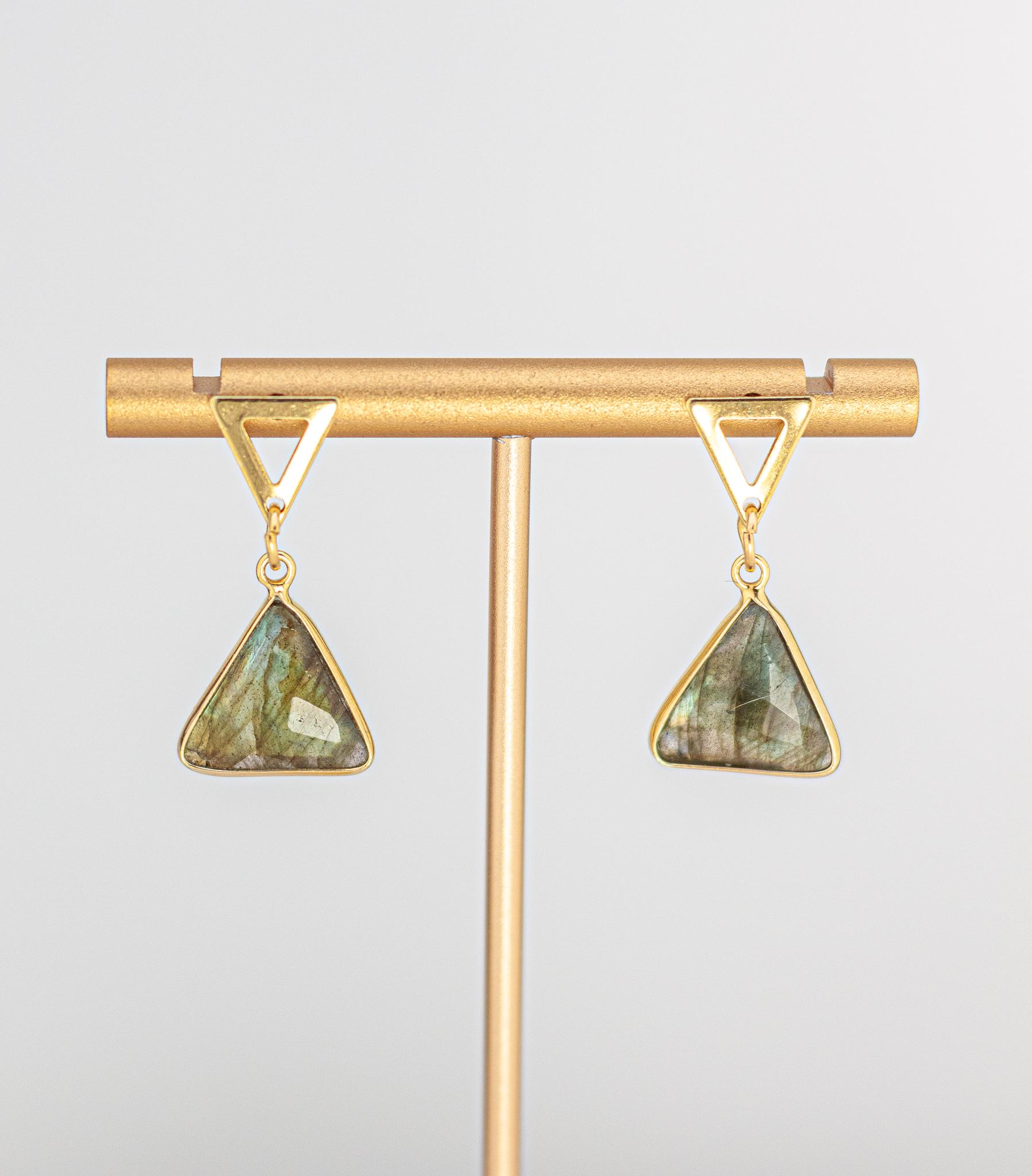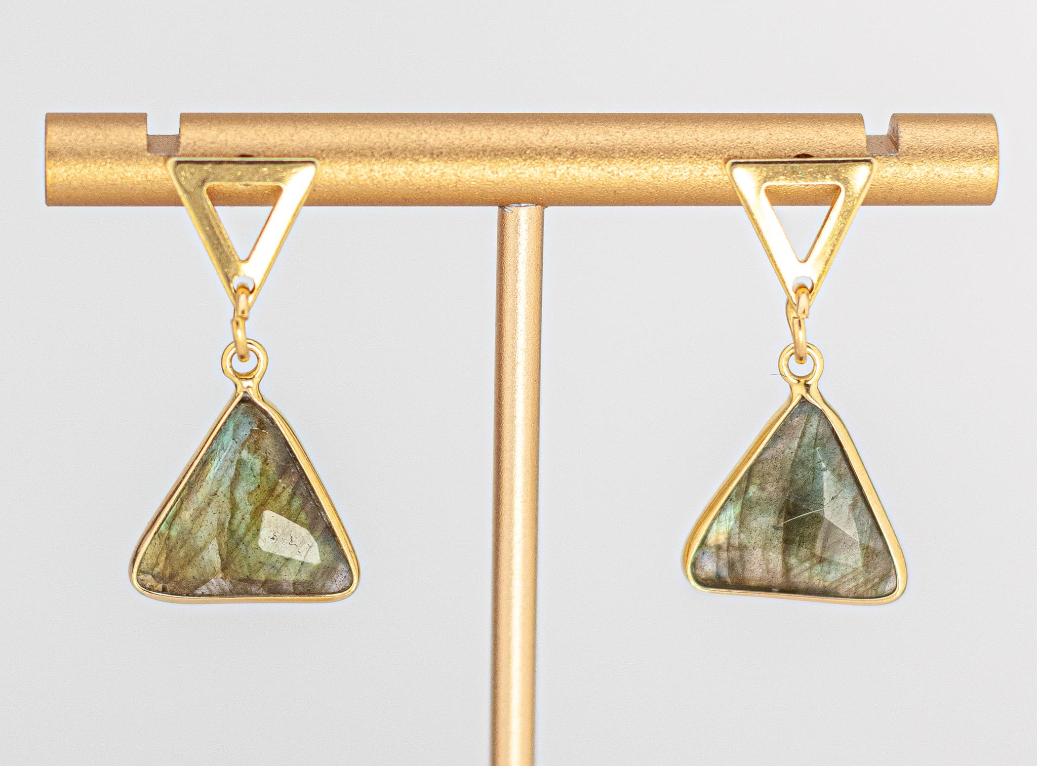 Elevate your modern boho chic style with these stunning labradorite Earrings. Featuring natural labradorite gemstone dominant shade of grey with flashes of amber, brown, yellow, green, and blue iridescent shimmers. These unique triangle shaped gold drop earrings exude sleek elegance and artistic flair. Each gemstone is beautifully faceted to reflect light and enhance its organic oceanic hue, creating a captivating statement piece that’s both contemporary and timeless.