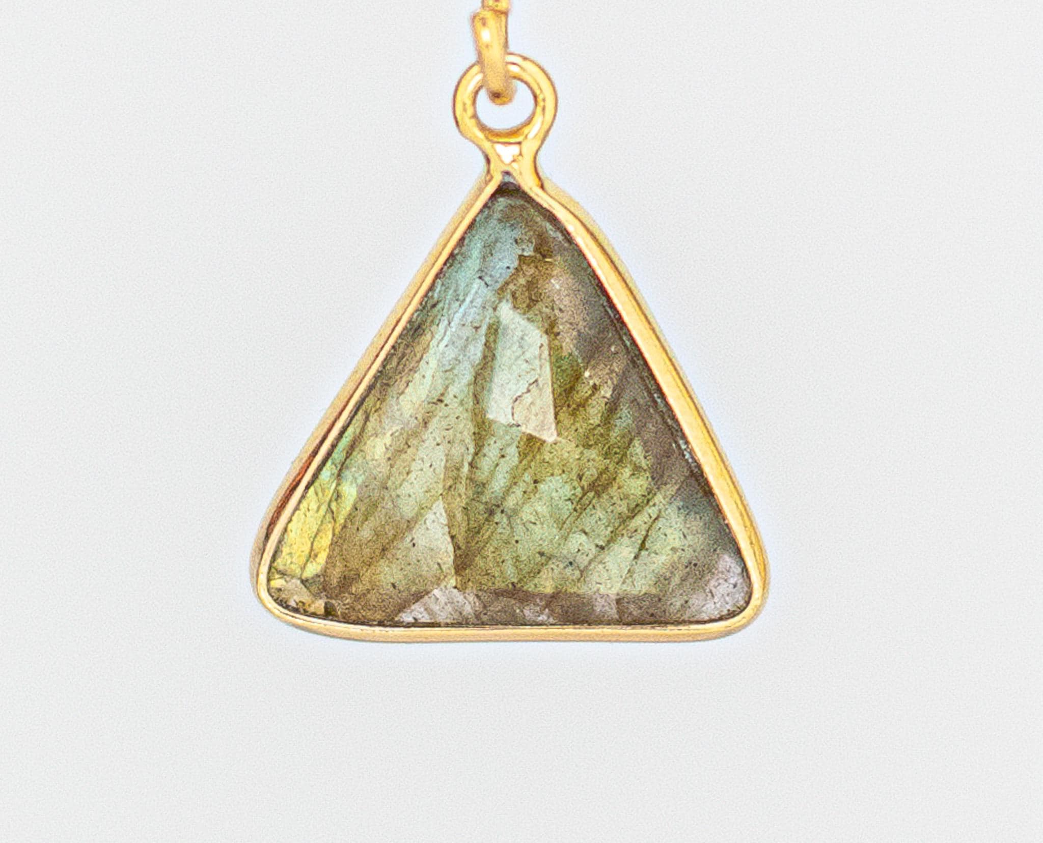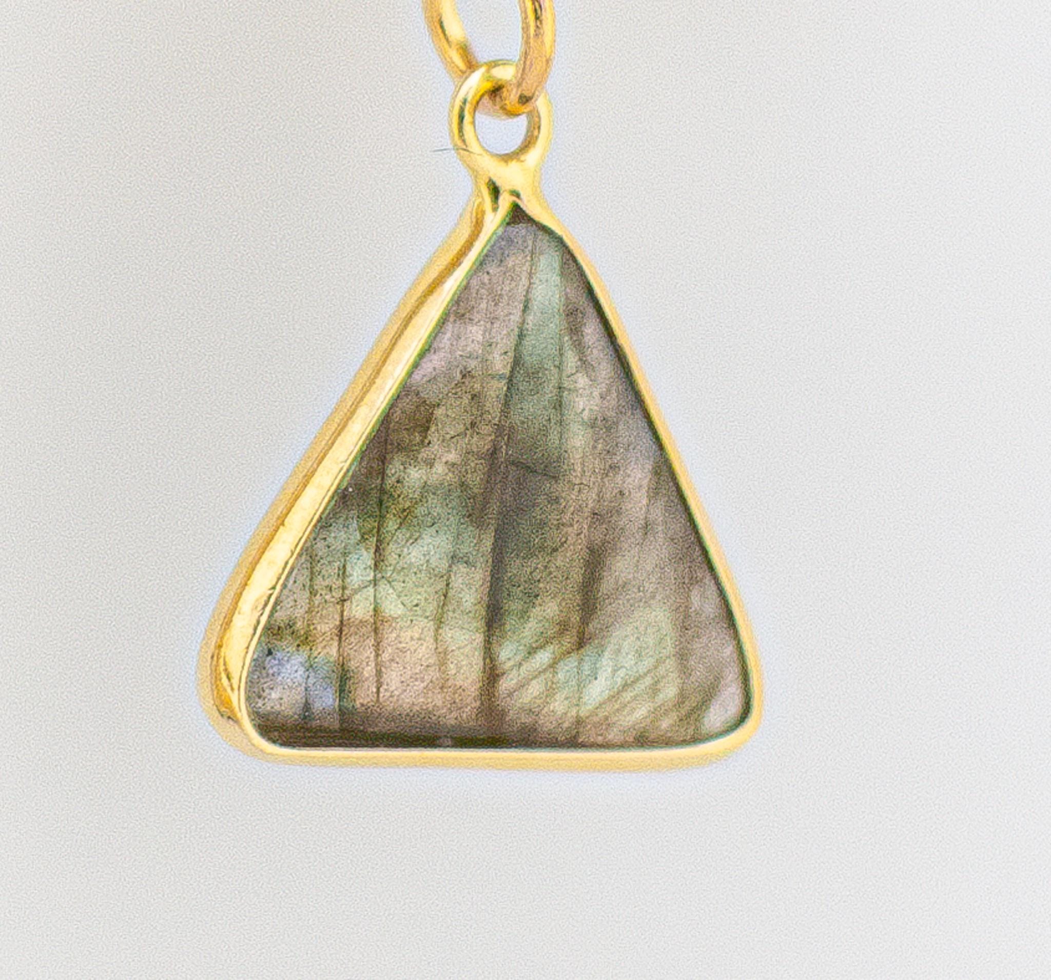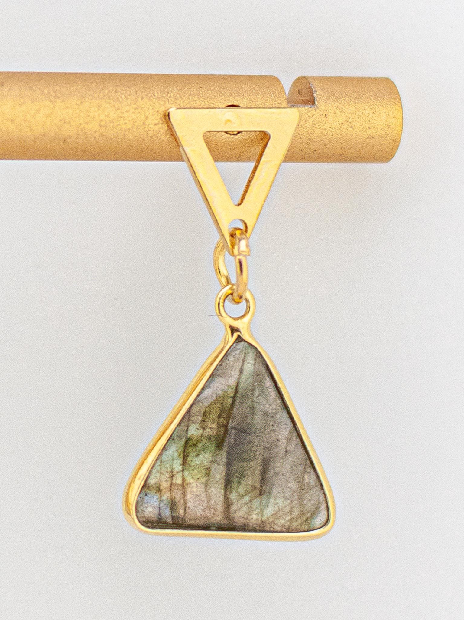 Elevate your modern boho chic style with these stunning labradorite Earrings. Featuring natural labradorite gemstone dominant shade of grey with flashes of amber, brown, yellow, green, and blue iridescent shimmers. These unique triangle shaped gold drop earrings exude sleek elegance and artistic flair. Each gemstone is beautifully faceted to reflect light and enhance its organic oceanic hue, creating a captivating statement piece that’s both contemporary and timeless.