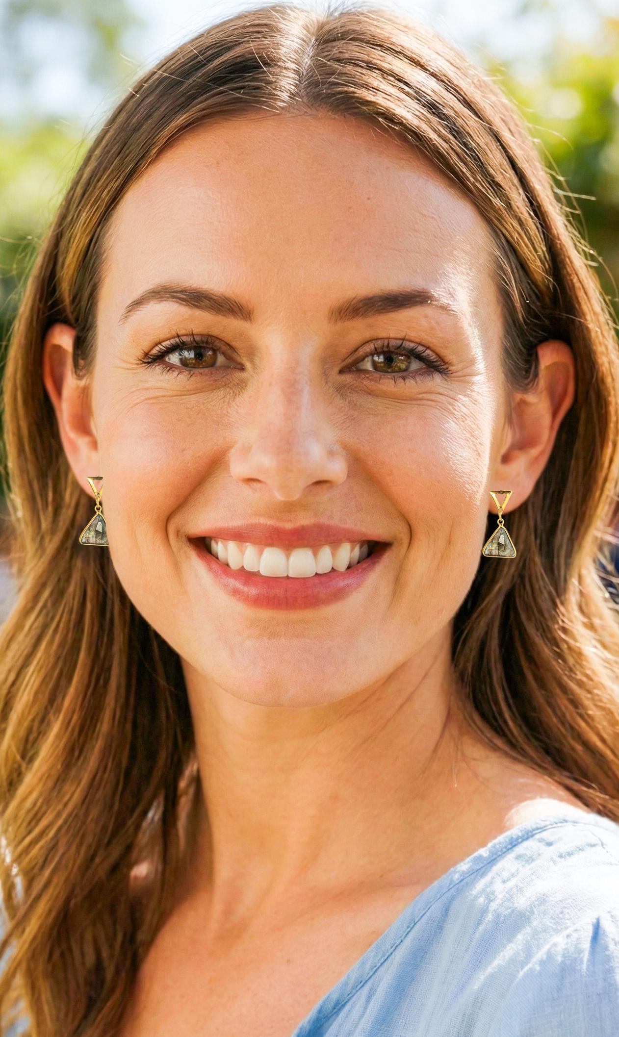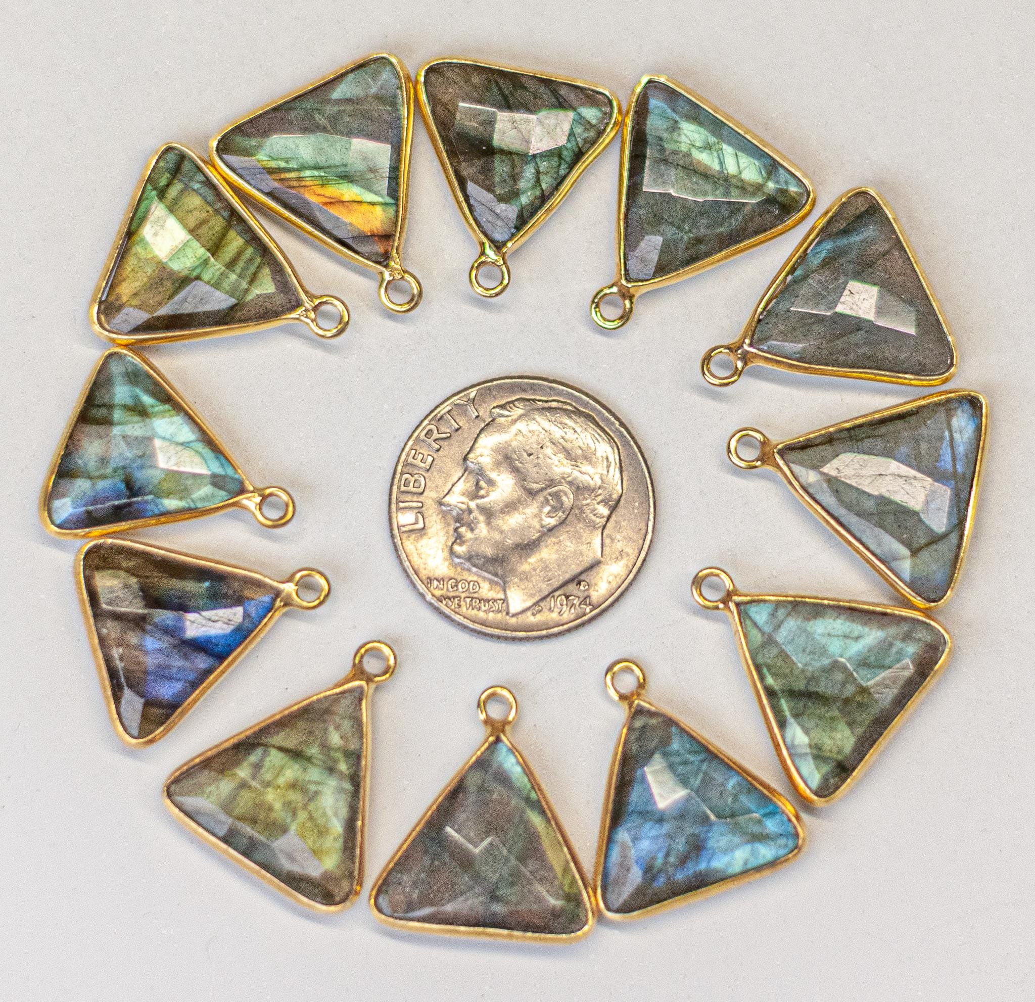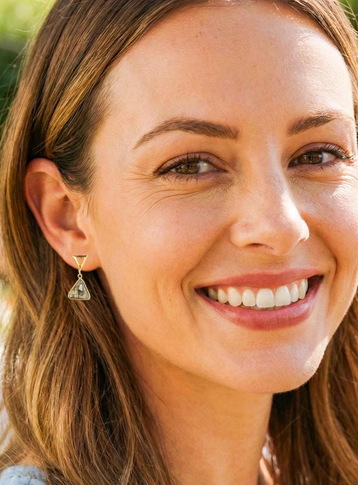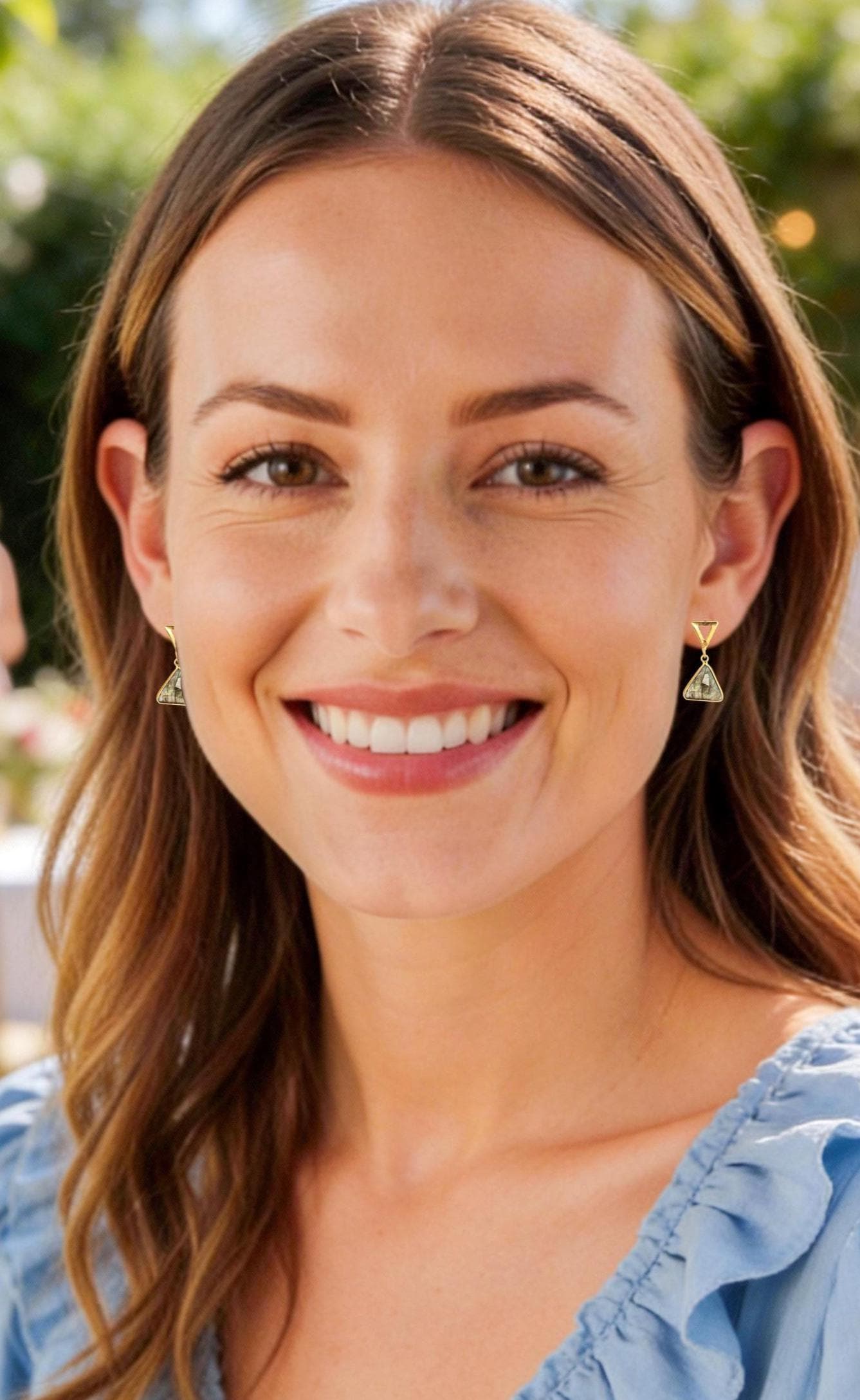 Elevate your modern boho chic style with these stunning labradorite Earrings. Featuring natural labradorite gemstone dominant shade of grey with flashes of amber, brown, yellow, green, and blue iridescent shimmers. These unique triangle shaped gold drop earrings exude sleek elegance and artistic flair. Each gemstone is beautifully faceted to reflect light and enhance its organic oceanic hue, creating a captivating statement piece that’s both contemporary and timeless.