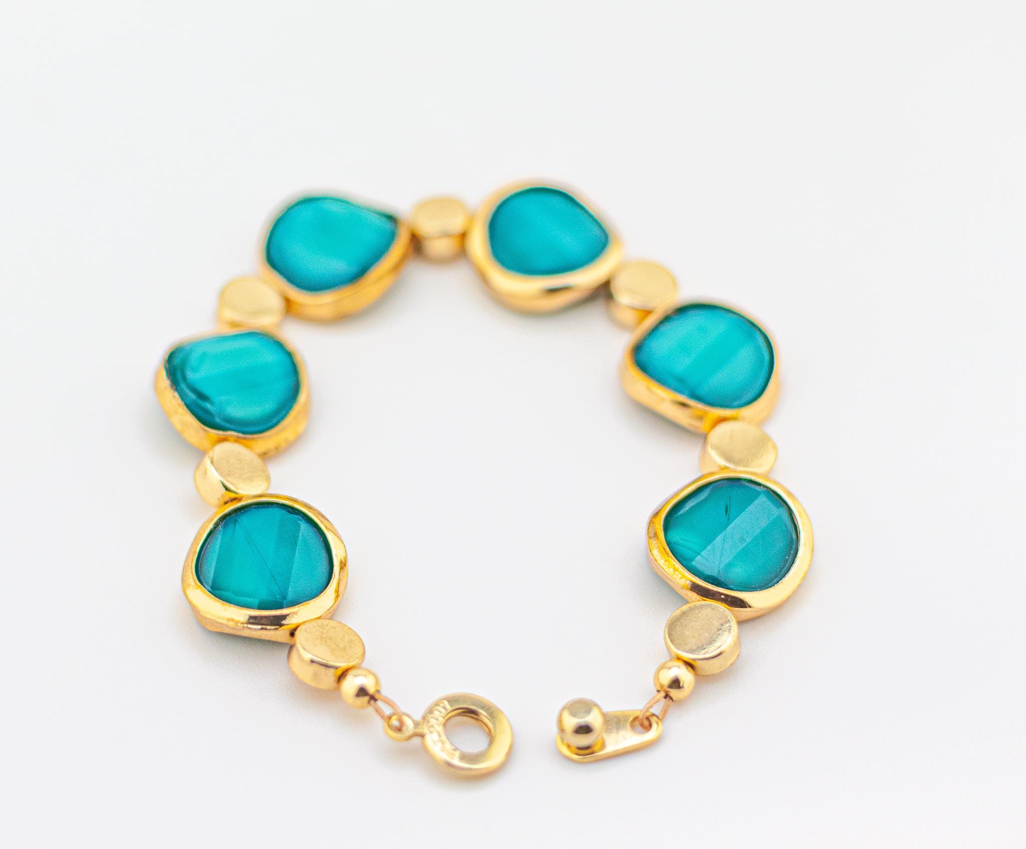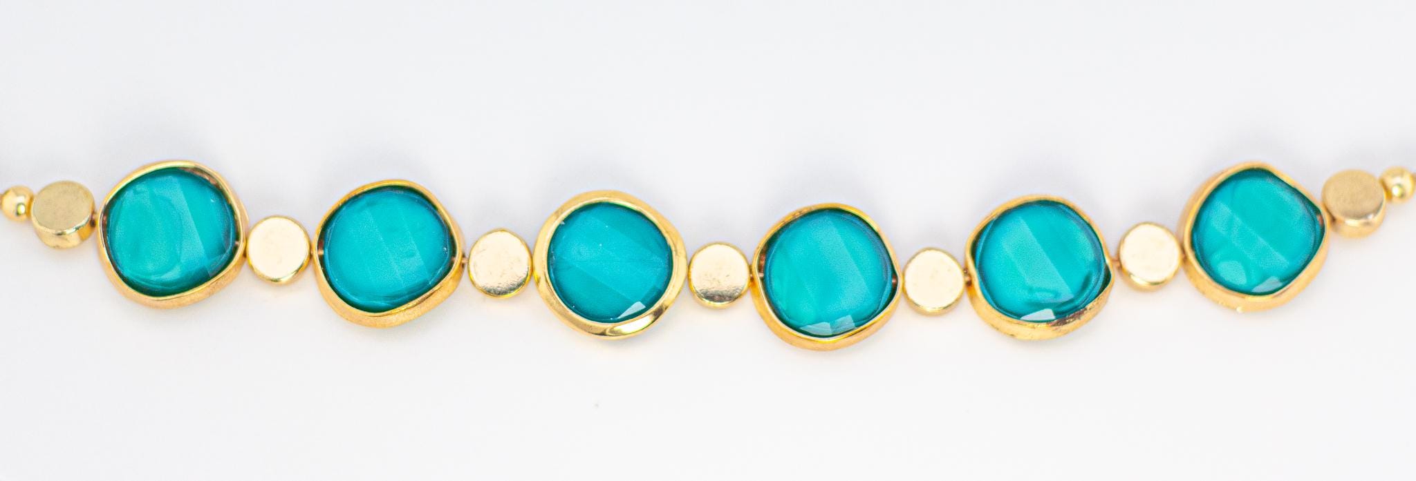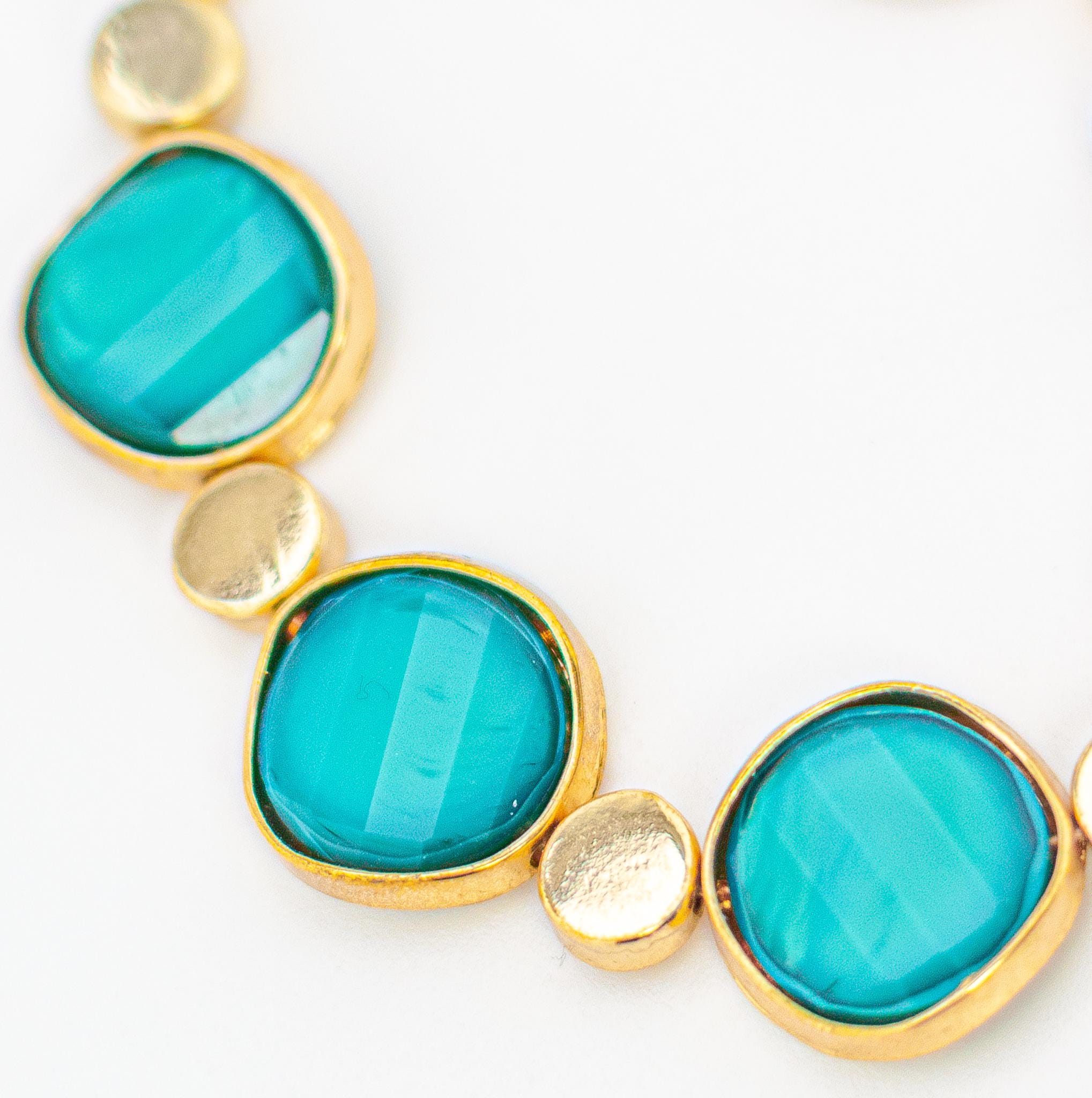 Each glossy teal bead reflects light beautifully, creating a dimensional, jewel-toned finish that shifts between deep ocean blue and moody green hues. The warm gold accents add contrast and sophistication, giving this bohemian beaded bracelet a polished, elevated feel. The result is a unique handmade fashion bracelet that feels bold yet refined—perfect for women who love statement jewelry that still works for everyday wear.