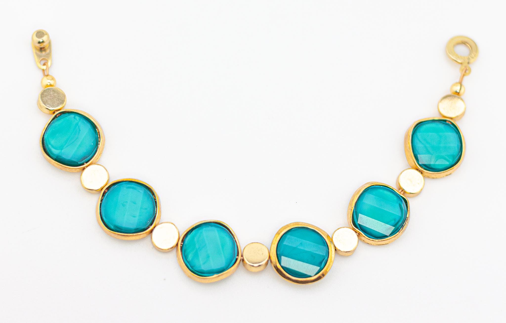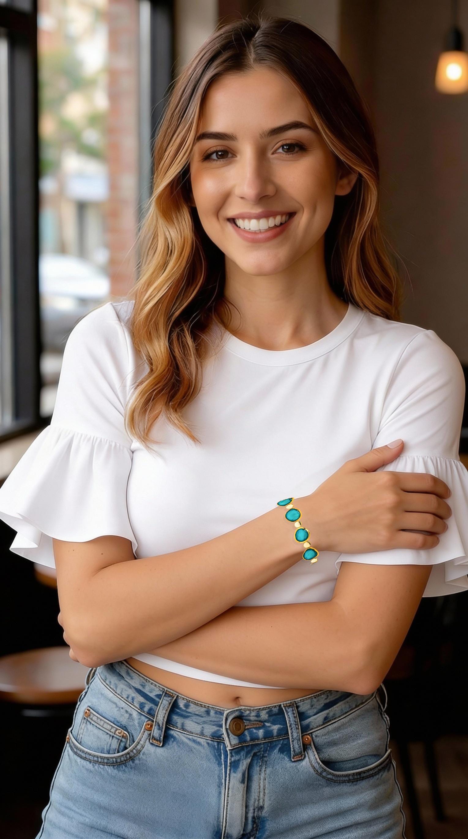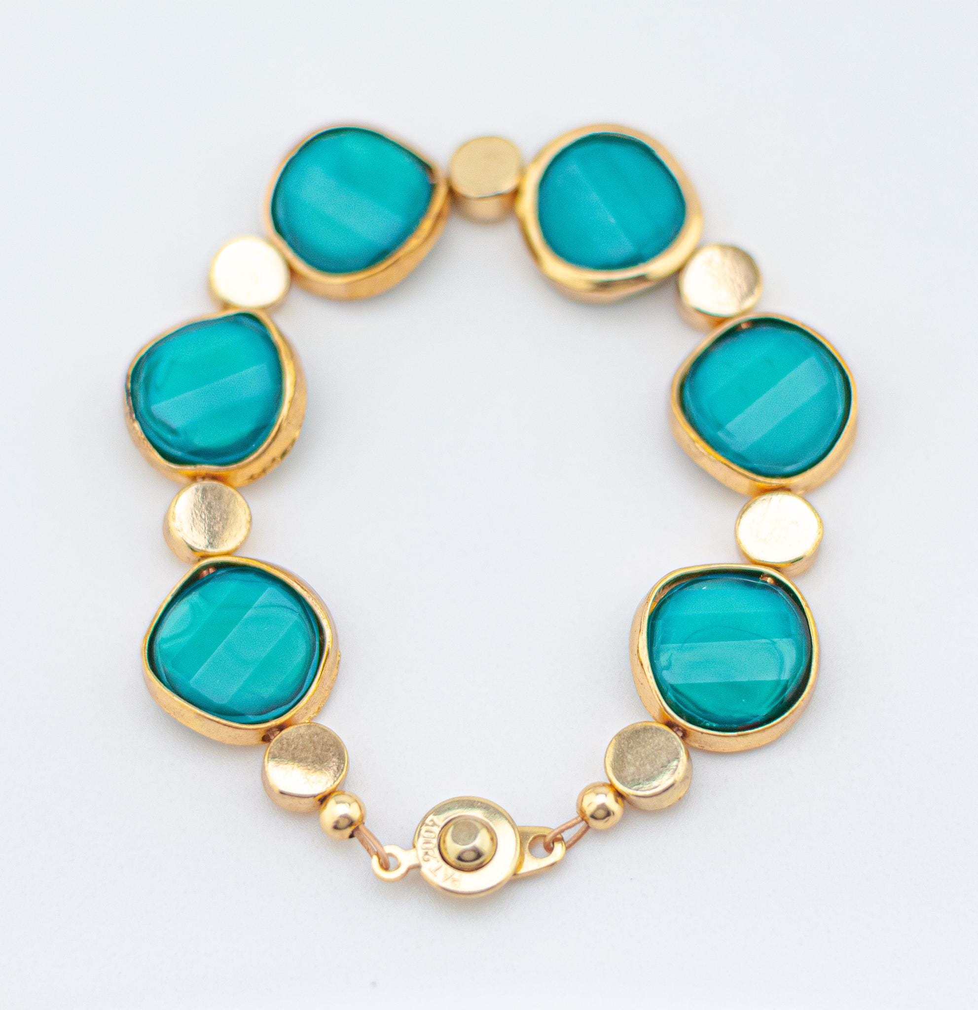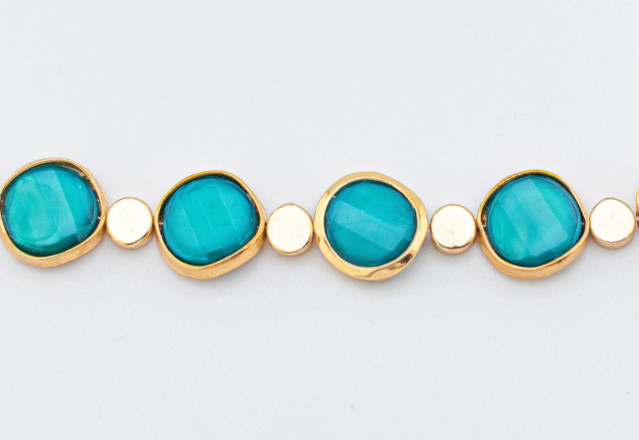 Each glossy teal bead reflects light beautifully, creating a dimensional, jewel-toned finish that shifts between deep ocean blue and moody green hues. The warm gold accents add contrast and sophistication, giving this bohemian beaded bracelet a polished, elevated feel. The result is a unique handmade fashion bracelet that feels bold yet refined—perfect for women who love statement jewelry that still works for everyday wear.