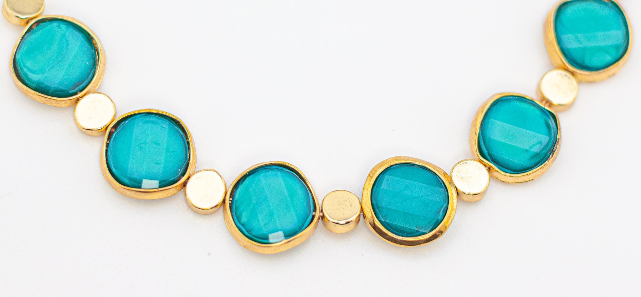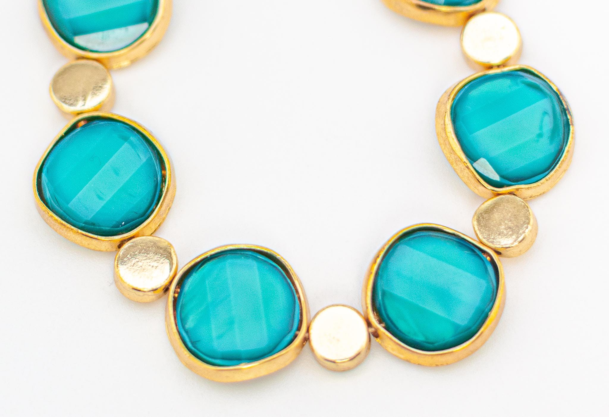 Make a confident style statement with this bold blue and gold statement bracelet, featuring chunky dark teal glass beads in rich deep blue-green tones accented with shimmering gold details. Designed to stand out while remaining effortlessly wearable, this bracelet blends modern elegance with bohemian charm for a look that feels chic, artistic, and slightly edgy.