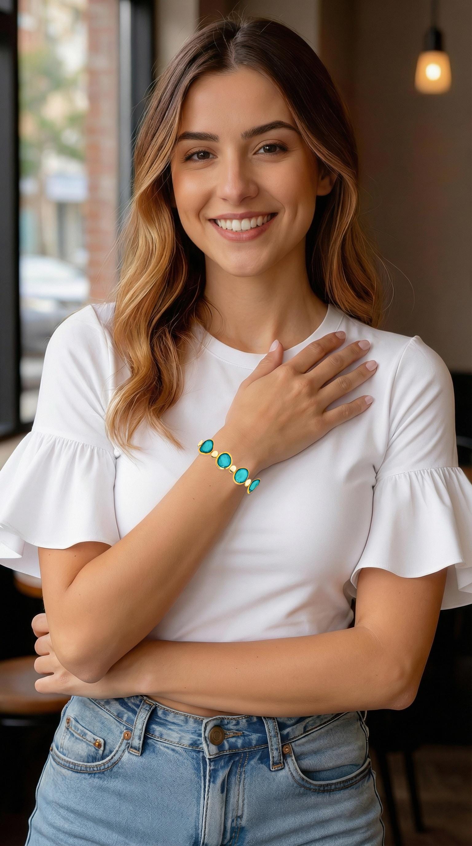 This chunky gold bracelet is ideal for styling with casual outfits, minimalist looks, or elevated evening ensembles. Wear it with jeans and a cozy knit for effortless everyday style, or pair it with a sleek black dress, linen jumpsuit, or flowy boho outfit for date night or evening looks. Its versatile color palette makes it easy to mix with neutrals, black, white, and earthy tones while adding a pop of rich color and shine.