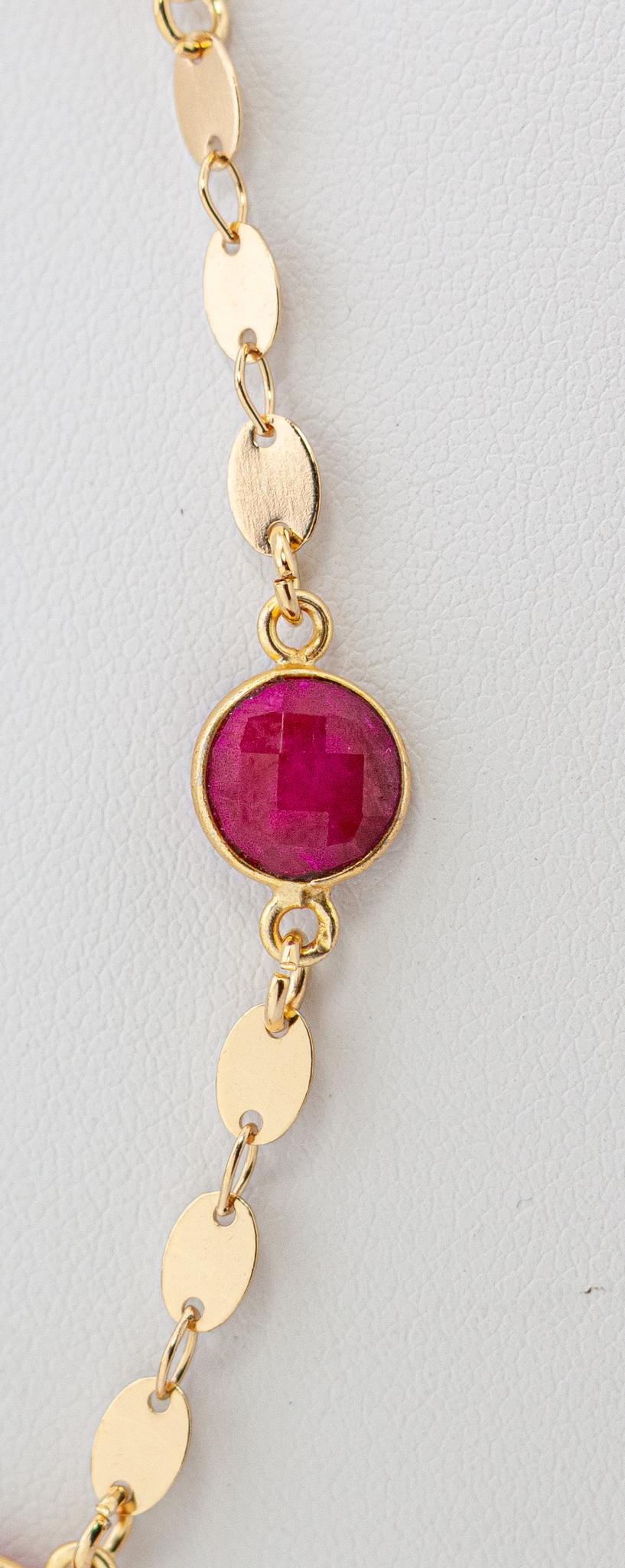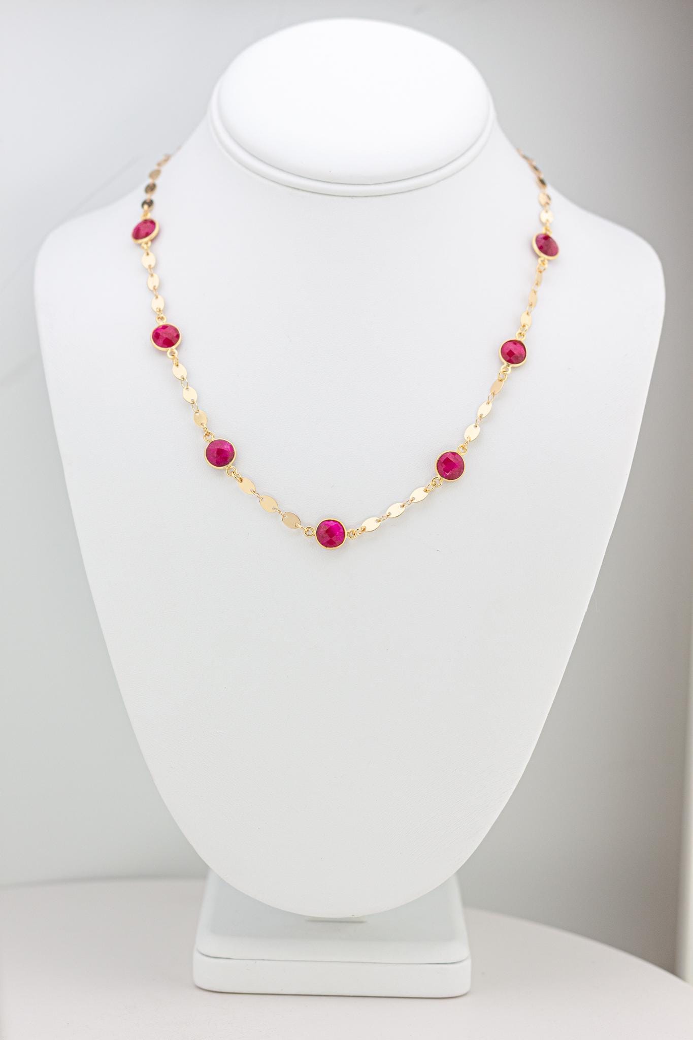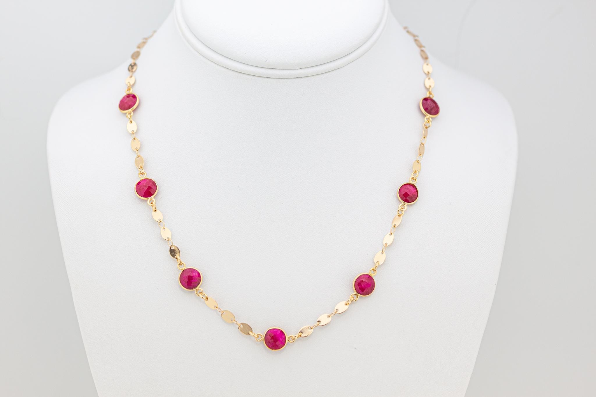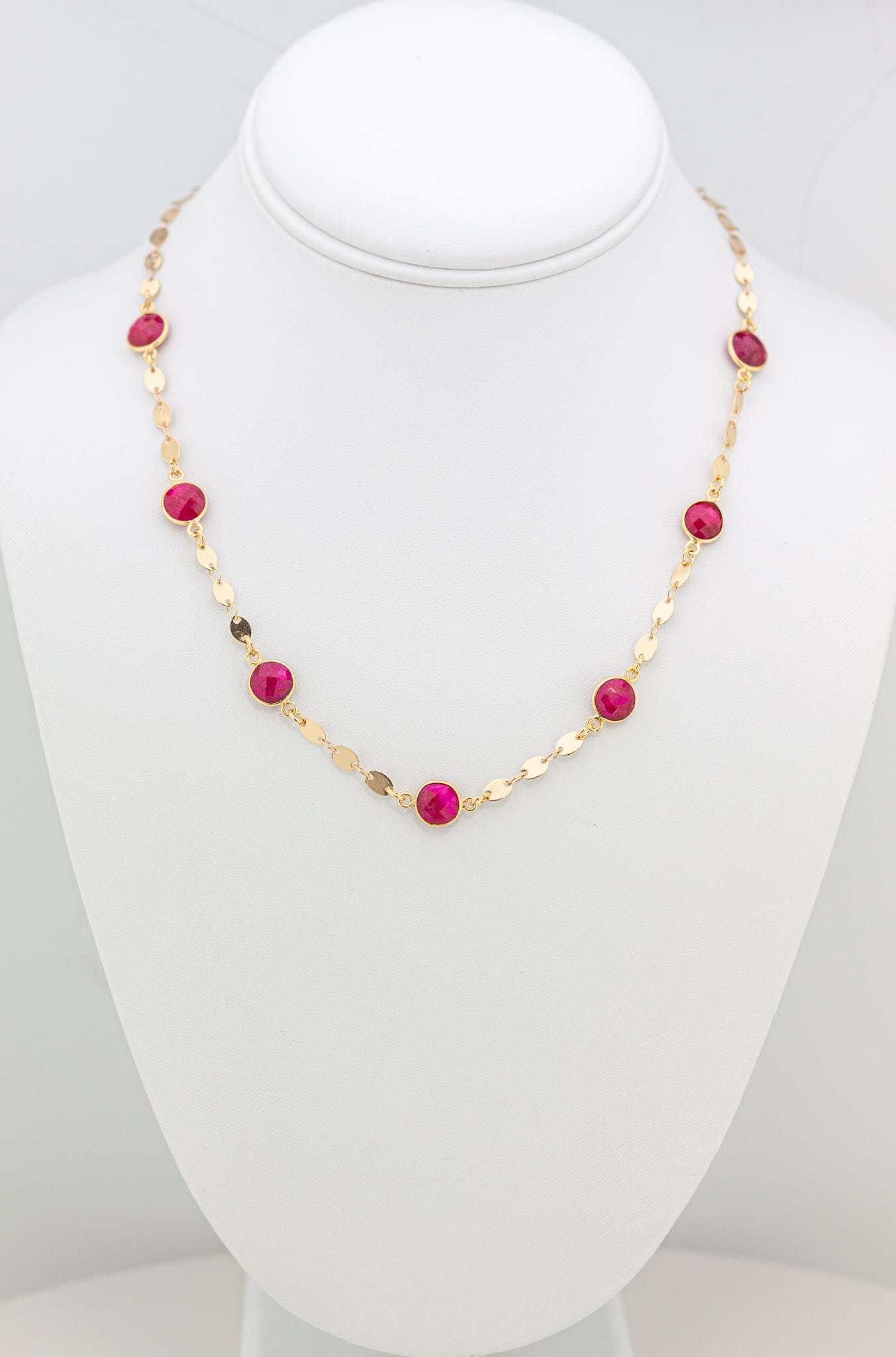 Featuring natural ruby gemstones in rich shades of magenta, fuchsia, and dark rose pink, paired with a luminous oval-link gold plated chain, this striking necklace captures the captivating beauty of deep pink gemstone color.