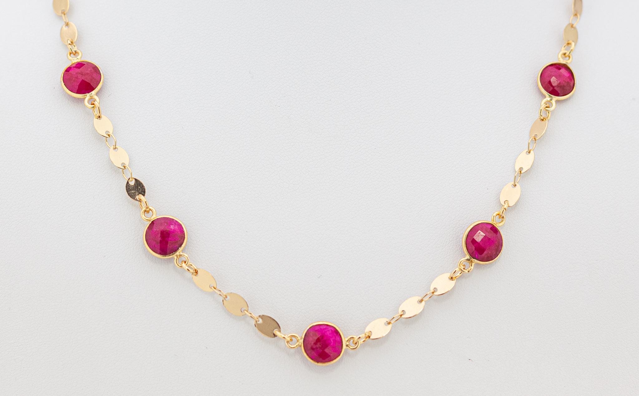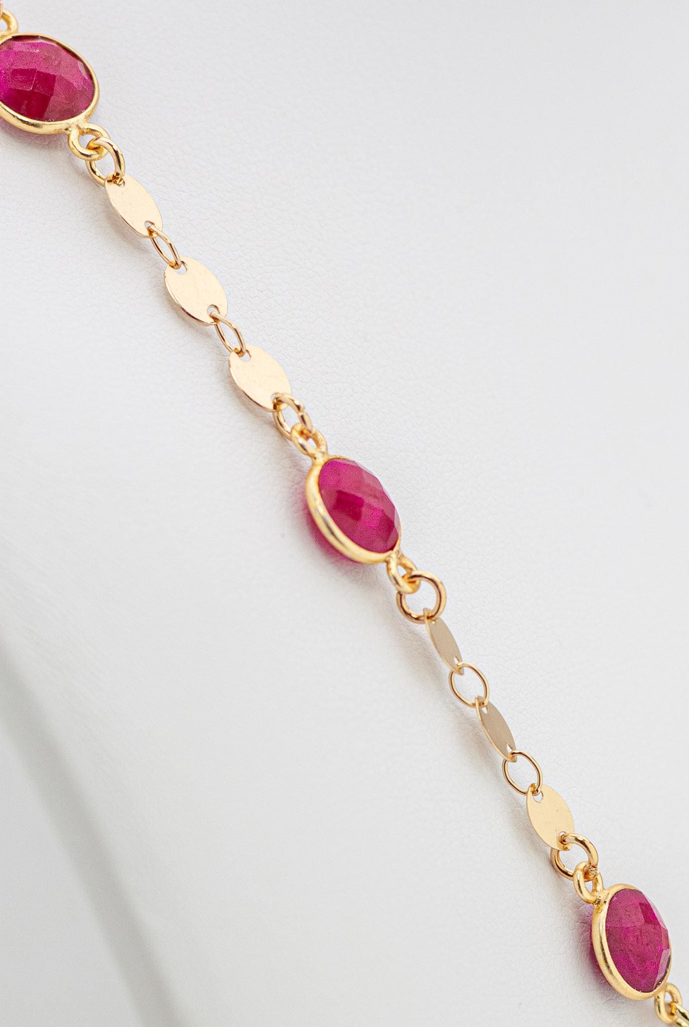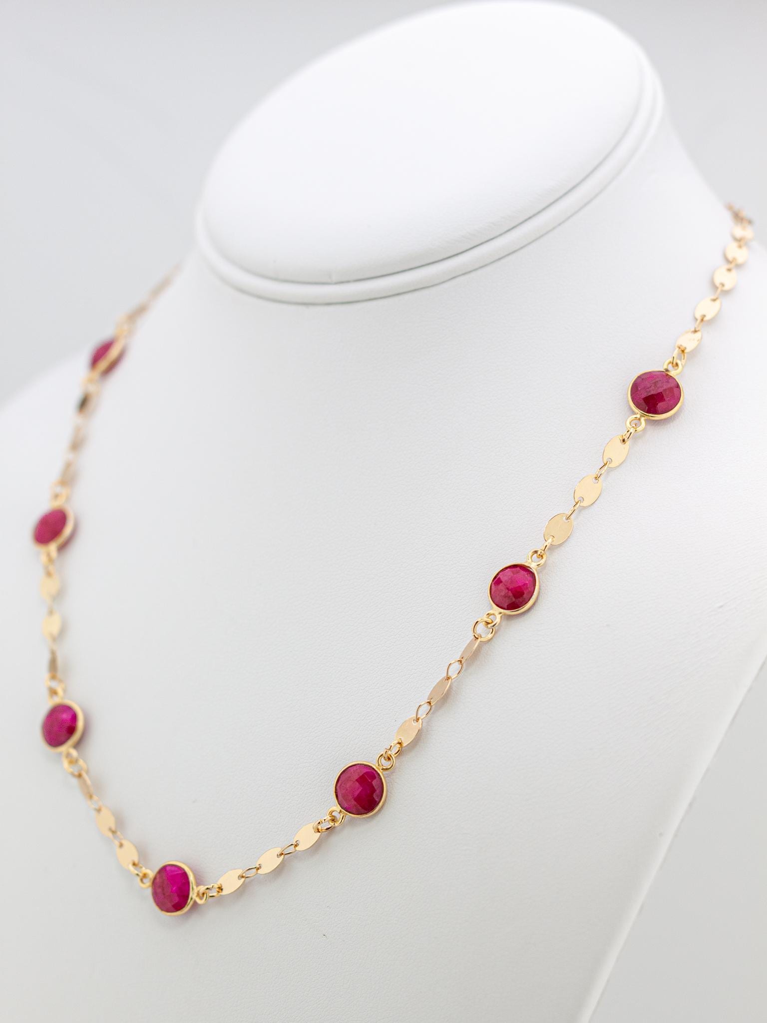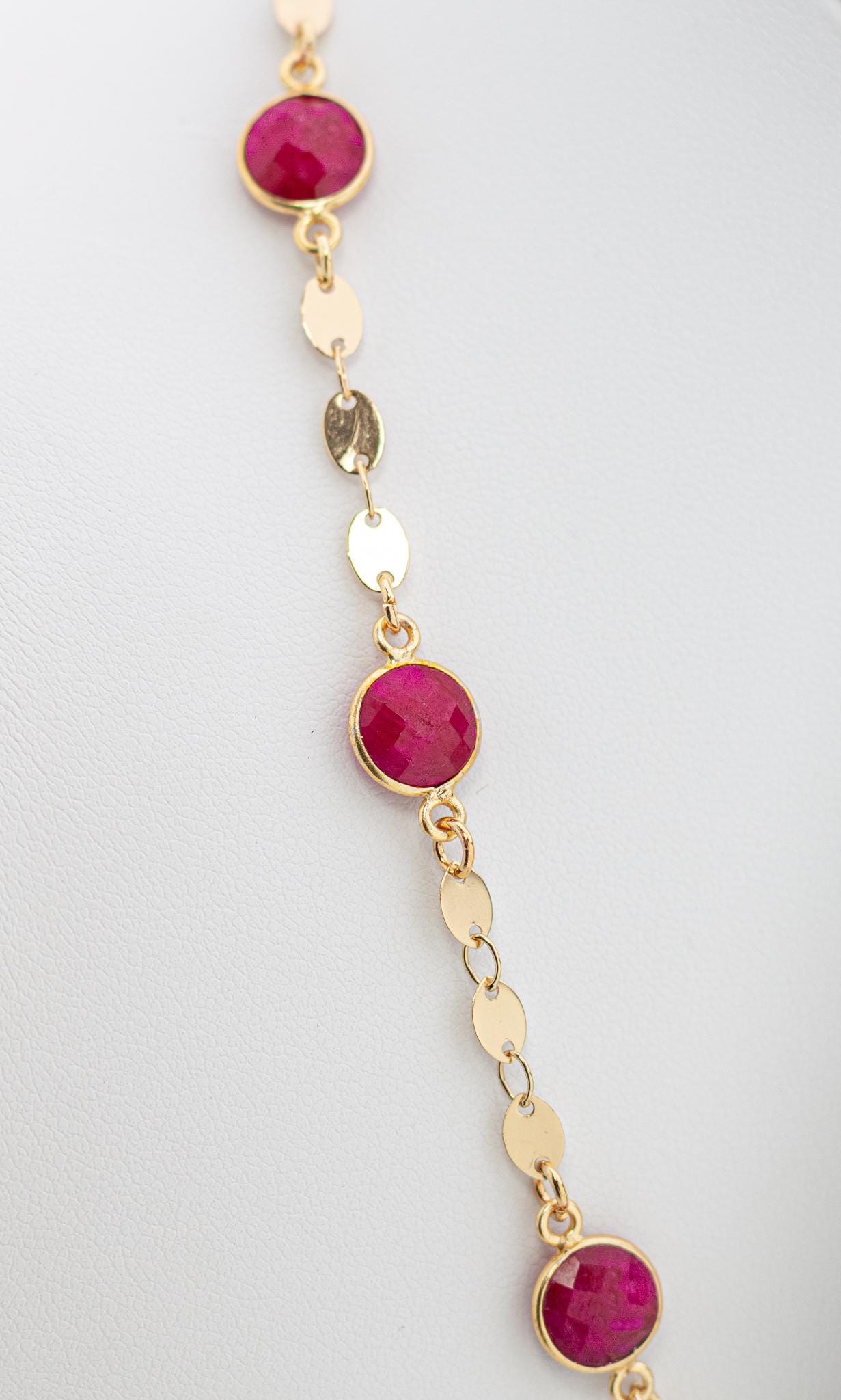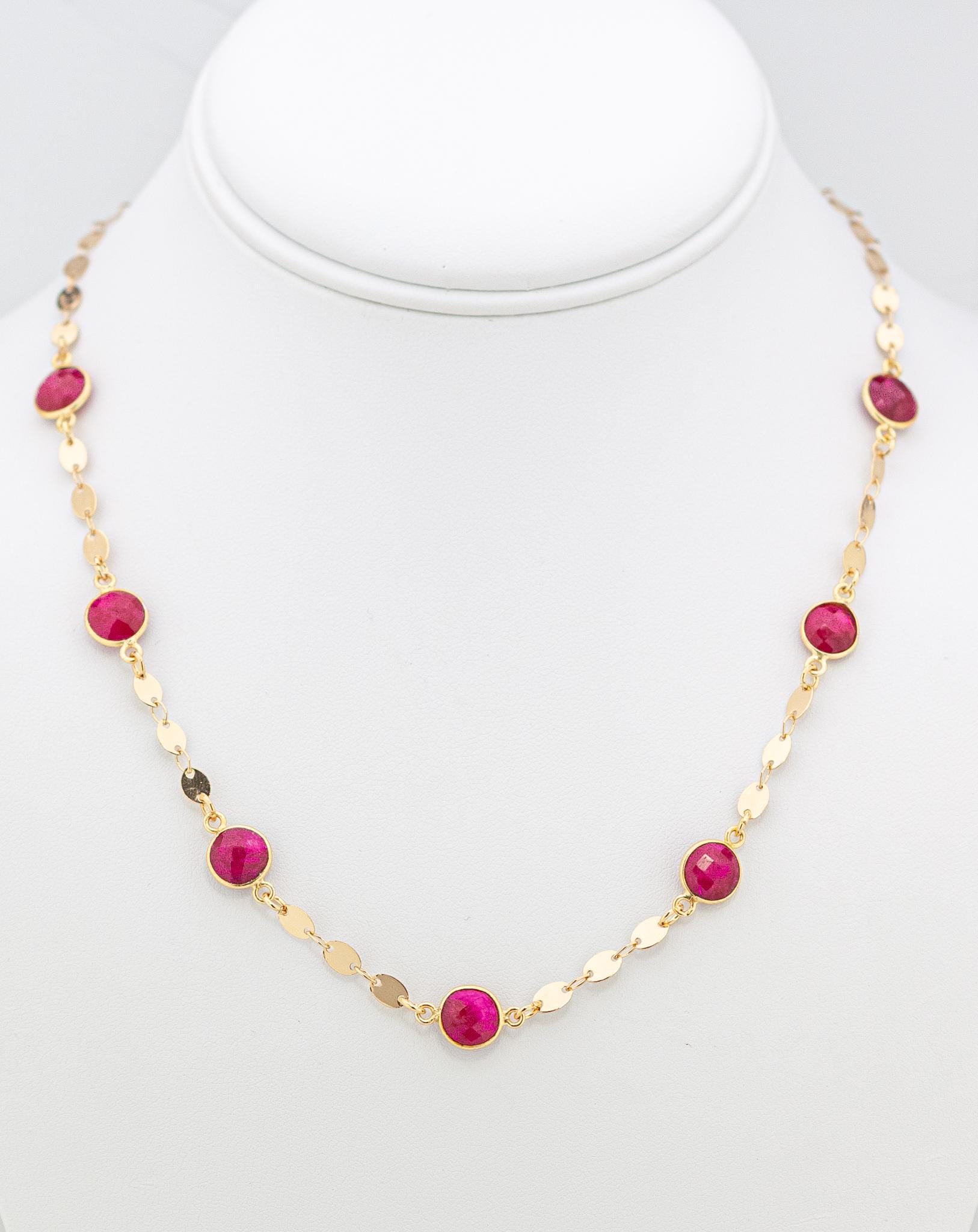 Featuring natural ruby gemstones in rich shades of magenta, fuchsia, and dark rose pink, paired with a luminous oval-link gold plated chain, this striking necklace captures the captivating beauty of deep pink gemstone color.