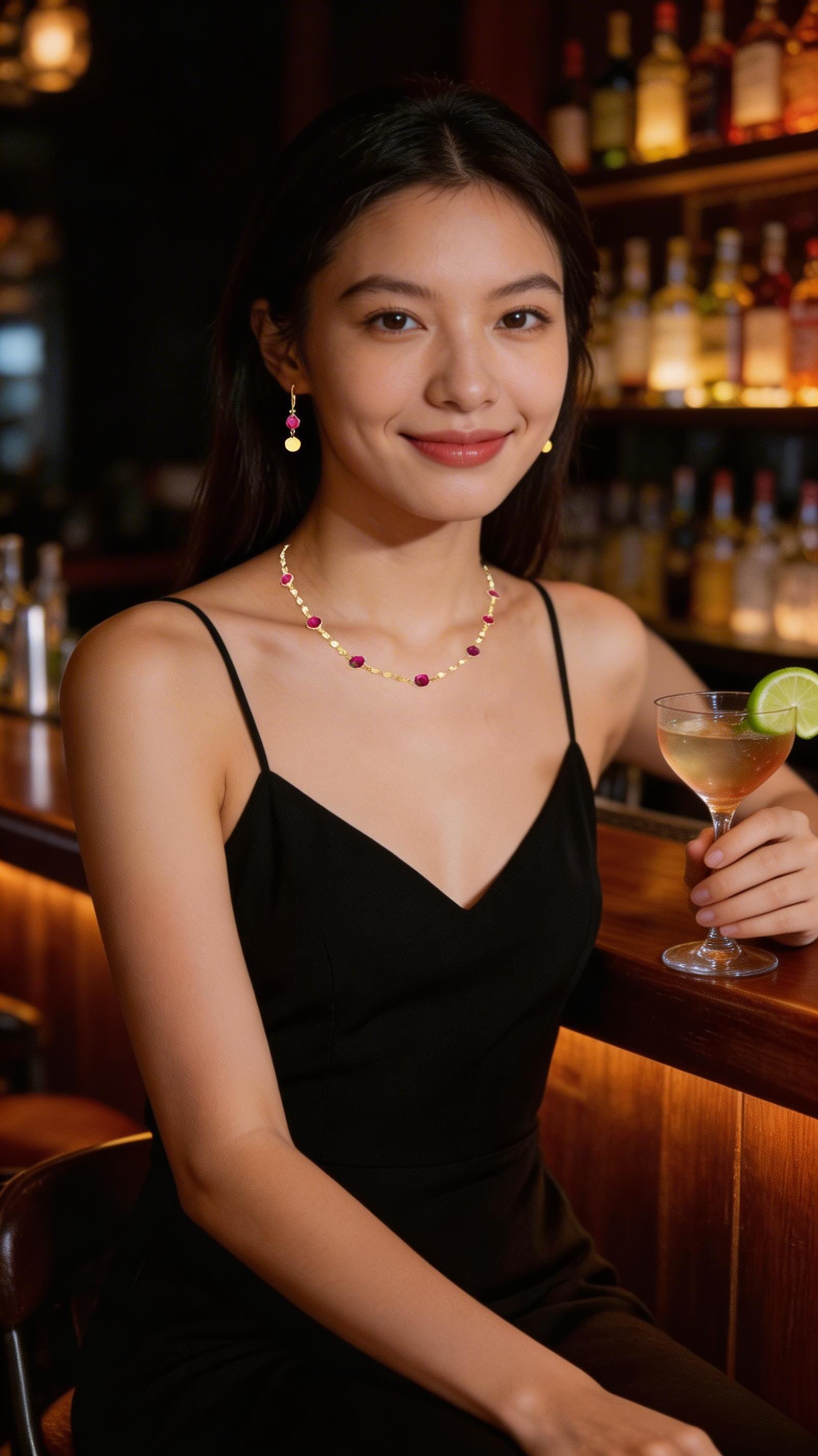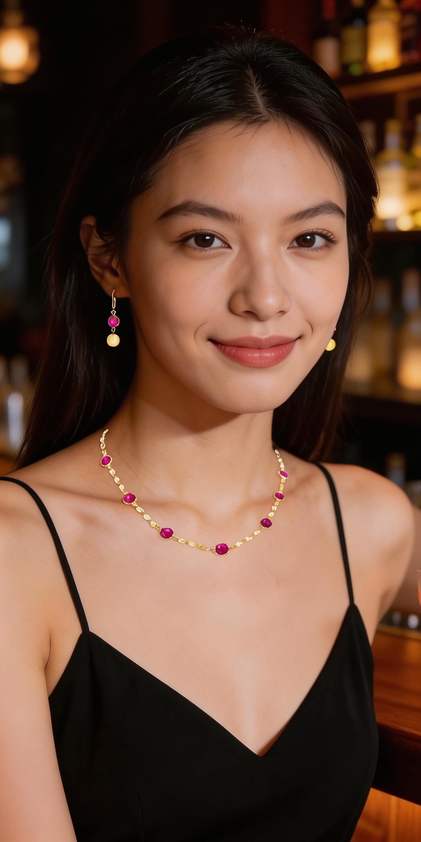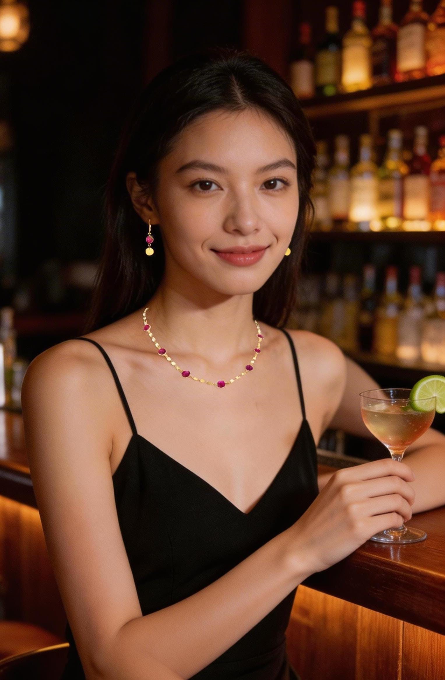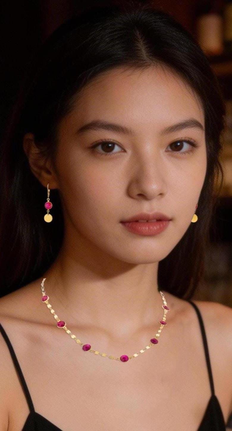 This ruby gemstone necklace also works beautifully as a shimmery layering piece. Style it alone as a bold focal point, or pair it with longer gold chains for a curated layered jewelry look. The mix of magenta, fuchsia, dark rose pink, and shimmering gold creates a luxe statement that feels both modern and timeless.