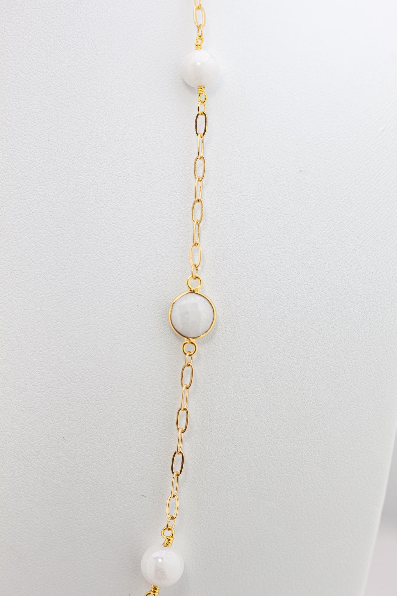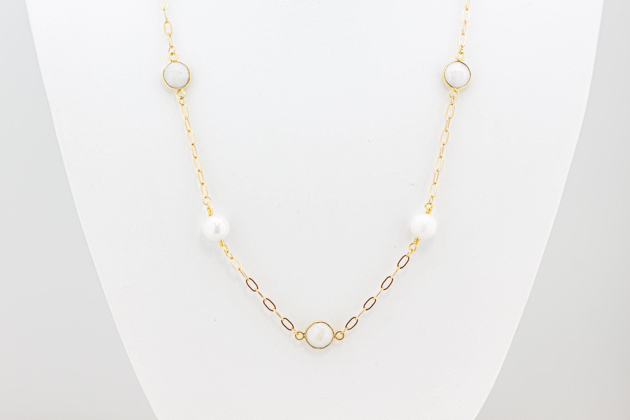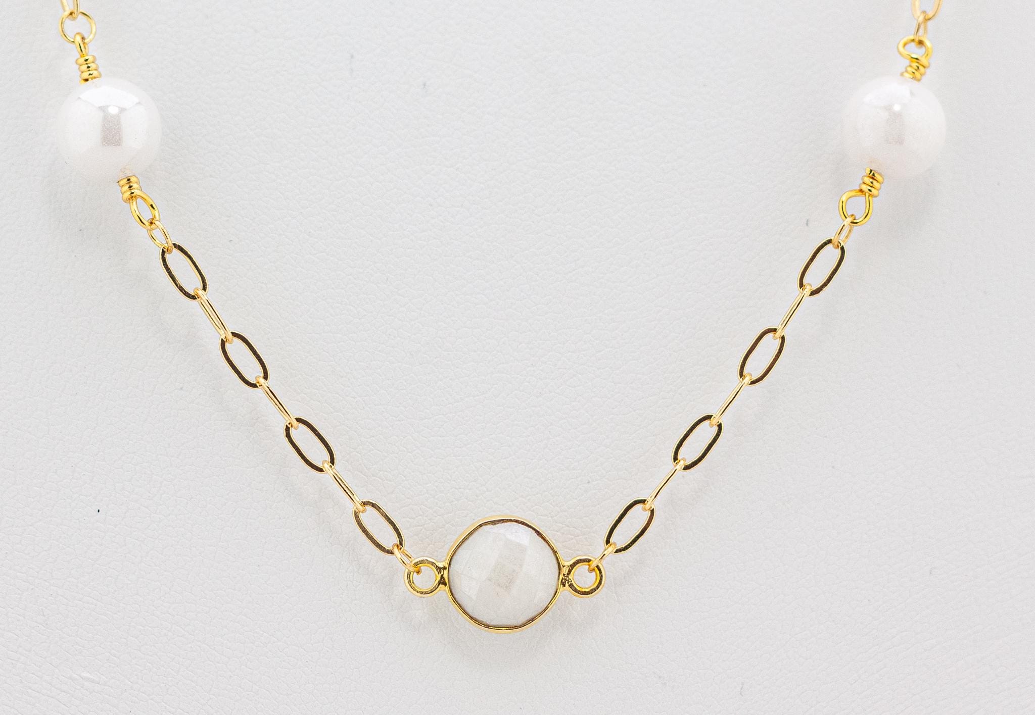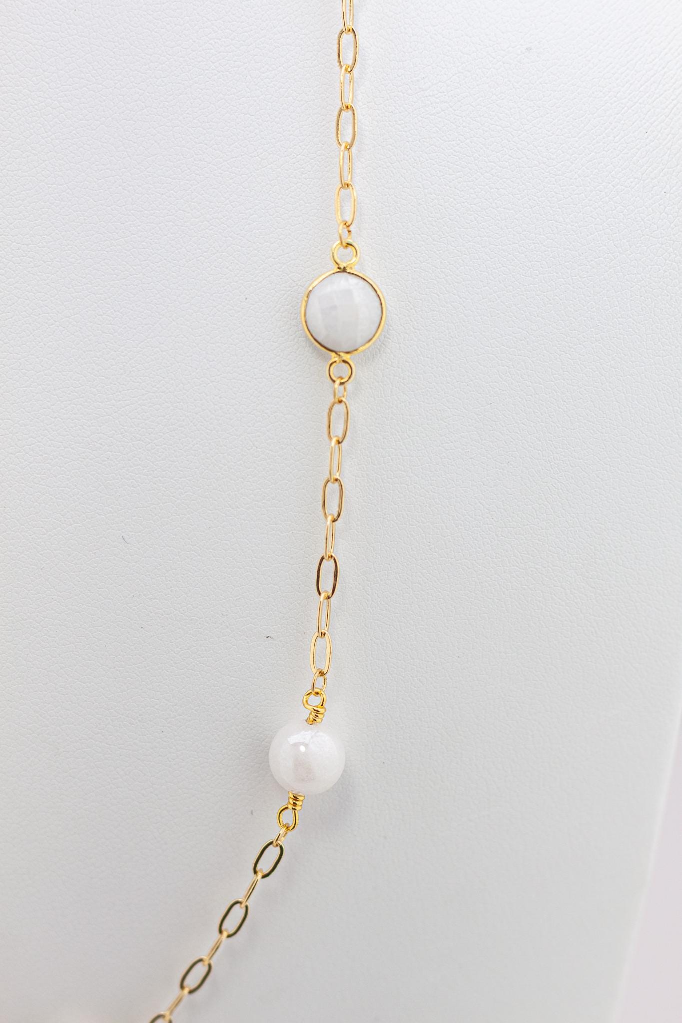 Featuring luminous white quartz gemstones set in gold bezels, beautifully paired with shimmering mystic quartz beads and radiant gold accents, this lightweight beaded necklace captures the cool, captivating beauty of soft white, off-white, and iridescent tones.