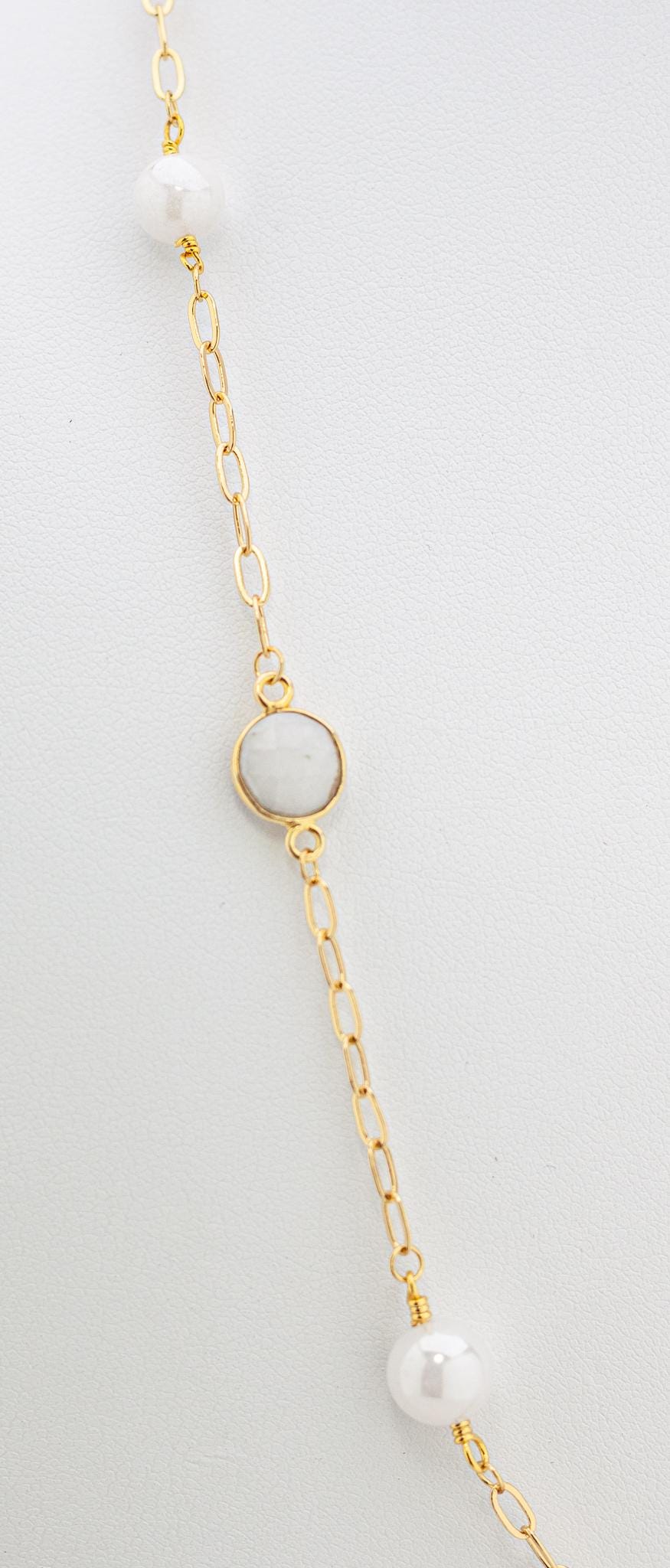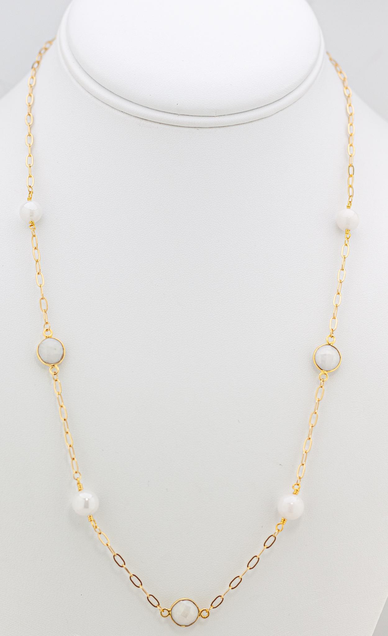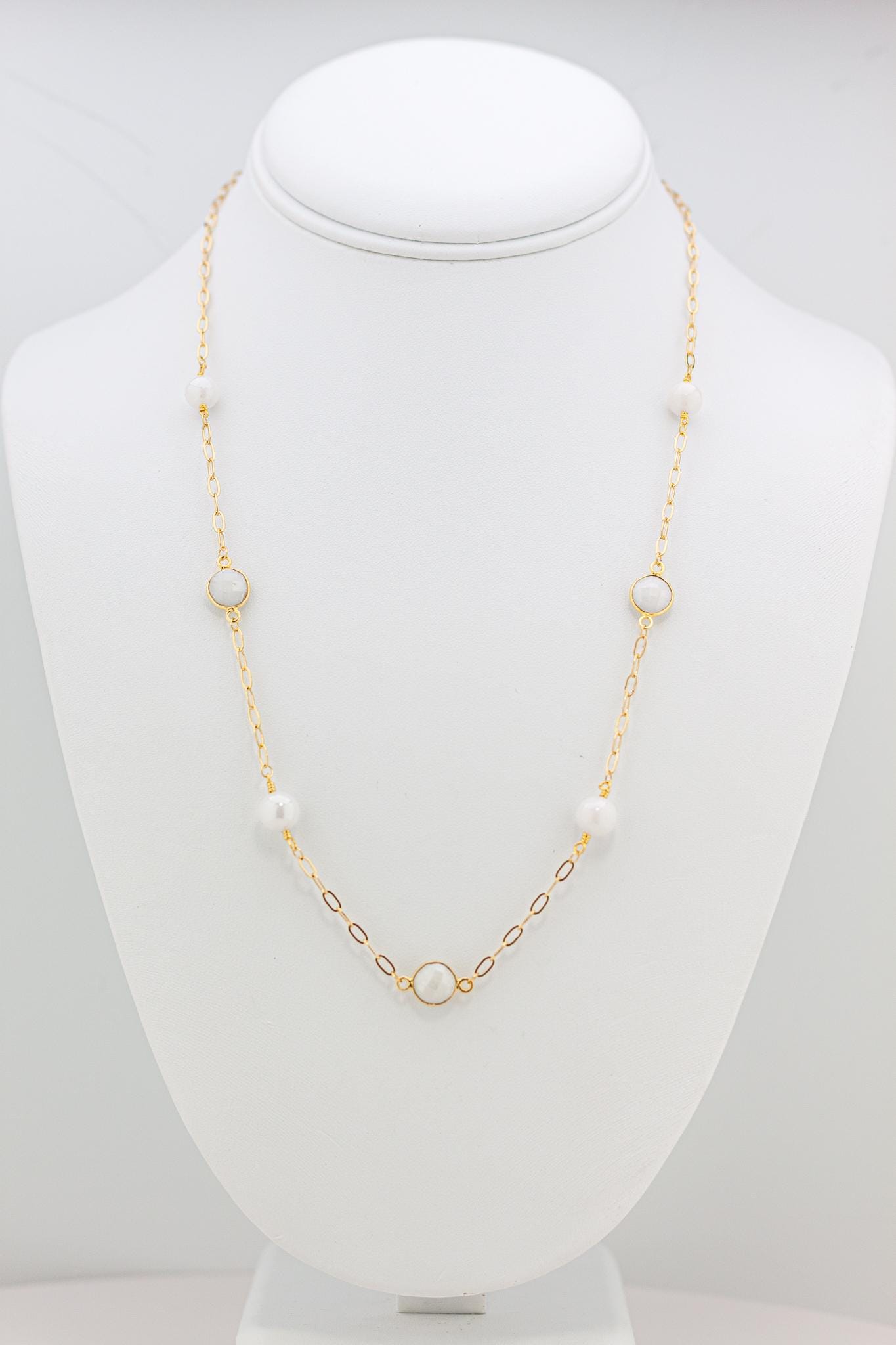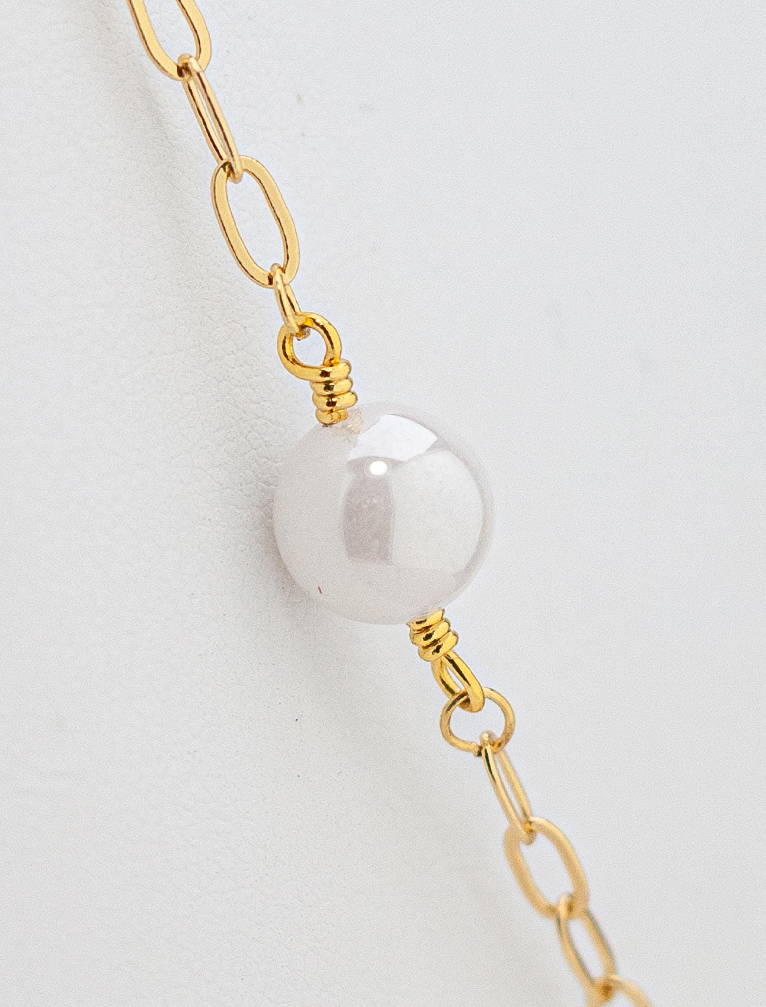 Featuring luminous white quartz gemstones set in gold bezels, beautifully paired with shimmering mystic quartz beads and radiant gold accents, this lightweight beaded necklace captures the cool, captivating beauty of soft white, off-white, and iridescent tones.